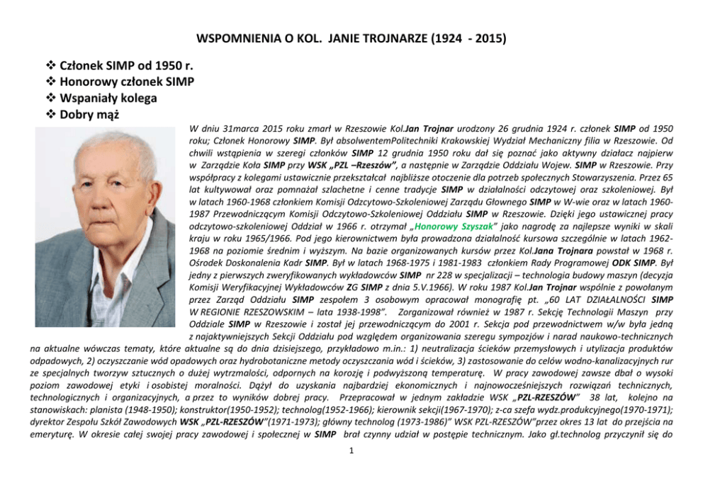 WSPOMNIENIA O KOL. JANIE TROJNARZE (1924 - 2015) Członek SIMP od 1950 r. Honorowy członek SIMP Wspaniały kolega Dobry mąż W dniu 31marca 2015 roku zmarł w Rzeszowie Kol.Jan Trojnar urodzony 26 grudnia 1924 r. członek SIMP od 1950 roku; Członek Honorowy SIMP. Był absolwentemPolitechniki Krakowskiej Wydział Mechaniczny filia w Rzeszowie. Od chwili wstąpienia w szeregi członków SIMP 12 grudnia 1950 roku dał się poznać jako aktywny działacz najpierw w Zarządzie Koła SIMP przy WSK „PZL –Rzeszów”, a następnie w Zarządzie Oddziału Wojew. SIMP w Rzeszowie. Przy współpracy z kolegami ustawicznie przekształcał najbliższe otoczenie dla potrzeb społecznych Stowarzyszenia. Przez 65 lat kultywował oraz pomnażał szlachetne i cenne tradycje SIMP w działalności odczytowej oraz szkoleniowej. Był w latach 1960-1968 członkiem Komisji Odzcytowo-Szkoleniowej Zarządu Głownego SIMP w W-wie oraz w latach 19601987 Przewodniczącym Komisji Odczytowo-Szkoleniowej Oddziału SIMP w Rzeszowie. Dzięki jego ustawicznej pracy odczytowo-szkoleniowej Oddział w 1966 r. otrzymał „Honorowy Szyszak” jako nagrodę za najlepsze wyniki w skali kraju w roku 1965/1966. Pod jego kierownictwem była prowadzona działalność kursowa szczególnie w latach 19621968 na poziomie średnim i wyższym. Na bazie organizowanych kursów przez Kol.Jana Trojnara powstał w 1968 r. Ośrodek Doskonalenia Kadr SIMP. Był w latach 1968-1975 i 1981-1983 członkiem Rady Programowej ODK SIMP. Był jedny z pierwszych zweryfikowanych wykładowców SIMP nr 228 w specjalizacji – technologia budowy maszyn (decyzja Komisji Weryfikacyjnej Wykładowców ZG SIMP z dnia 5.V.1966). W roku 1987 Kol.Jan Trojnar wspólnie z powołanym przez Zarząd Oddziału SIMP zespołem 3 osobowym opracował monografię pt. „60 LAT DZIAŁALNOŚCI SIMP W REGIONIE RZESZOWSKIM – lata 1938-1998”. Zorganizował również w 1987 r. Sekcję Technologii Maszyn przy Oddziale SIMP w Rzeszowie i został jej przewodniczącym do 2001 r. Sekcja pod przewodnictwem w/w była jedną z najaktywniejszych Sekcji Oddziału pod względem organizowania szeregu sympozjów i narad naukowo-technicznych na aktualne wówczas tematy, które aktualne są do dnia dzisiejszego, przykładowo m.in.: 1) neutralizacja ścieków przemysłowych i utylizacja produktów odpadowych, 2) oczyszczanie wód opadowych oraz hydrobotaniczne metody oczyszczania wód i ścieków, 3) zastosowanie do celów wodno-kanalizacyjnych rur ze specjalnych tworzyw sztucznych o dużej wytrzmalości, odpornych na korozję i podwyższoną temperaturę. W pracy zawodowej zawsze dbał o wysoki poziom zawodowej etyki i osobistej moralności. Dążył do uzyskania najbardziej ekonomicznych i najnowocześniejszych rozwiązań technicznych, technologicznych i organizacyjnych, a przez to wyników dobrej pracy. Przepracował w jednym zakładzie WSK „PZL-RZESZÓW” 38 lat, kolejno na stanowiskach: planista (1948-1950); konstruktor(1950-1952); technolog(1952-1966); kierownik sekcji(1967-1970); z-ca szefa wydz.produkcyjnego(1970-1971); dyrektor Zespołu Szkół Zawodowych WSK „PZL-RZESZÓW”(1971-1973); główny technolog (1973-1986)” WSK PZL-RZESZÓW”przez okres 13 lat do przejścia na emeryturę. W okresie całej swojej pracy zawodowej i społecznej w SIMP brał czynny udział w postępie technicznym. Jako gł.technolog przyczynił się do 1 modernizacji wydziałów produkcyjnych porzez wymianę przestarzałego parku maszynowego na nowoczesny – tradycyjne obrabiarki zostały zastąpione sterowanymi numerycznie i centrami obróbczymi. Ta modernizacja zakładu pod jego kierownictwem postawiła Wytwórnię w gronie najlepszych producentów przemysłu lotniczego. Był współorganizatorem zakładów filialnych w Przeworski. Żołyni, Bratkówce i Ropczycach. W 1978 i 1979r. brał udział w organizowanym przez SIMP, Min.Przem.Maszn. i Min.Przem.Maszyn Ciężkich i Roln. 2-ch KONKURSACH „Modernizacja środków produkcji żródłem wyzwalania rezerw w przemyśle maszynowym”- tematem pierwszej pracy zespłowej było: „Modernizacja uniwrsalnej obrabiarki elektrochemicznej EDCA-40 na obrabiarkę EDCB-40 i wdrażanie jej do produkcji matryc kuźniczych w WSK” PZL-RZESZÓW” - otrzymał Dyplom i nagrodę I stopnia, tematem drugiej pracy zespołowej było: „Modernizacja prasy mimośrodowej KD2326 – otrzymał Dyplom i nagrodę III stopnia. Posiada szereg świadectw racjonalizatorskich m.in.: z 28.V.1980 r. świadectwo nr 238/80 – projekt racjonalizatorski pt. „Wyciskanie kluczyków do uchwytów PTRk po uprzednim miejscowym nagrzaniu i spęczaniu w matrycy tradycyjnej” ; z 21.XII.1983 świadectwo racjonalizatorskie nr 8896 „Wykonanie przekładni planetarnych I stopnia i II stopnia sprężarek Linde”. Współdziałał zawodowo i społecznie w Kole SIMP w popularyzowaniu zwłaszcza wśród młodzieży dobrych tradycji zawodu, jego roli i perspektyw rozwoju. Posługiwał się zawsze obiektywizmem oraz prawdą. Podejmowal przemyślane, śmiałe i słuszne decyzje w zakresie swoich obowiazków. Był życzliwym, uczciwym, sprawiedliwym, wiarygodnym i odpowiedzialnym, co przy wysokich kawalifdikacjach zawodowych zapewniło mu wysoki autorytet zawoodowy w zakładzie i województwie. Za swoją pracę zawodową i społeczną otrzymał cały szereg odznaczeń państwowych, resortowych i stowarzyszeniowych takich jak: Zasłużony dla Wojew. Rzeszowskiego, Złota Odznaka Zasłużony dla WSK Rzeszów, Złota Odznaka Za Zasługi dla Rozwoju Przemysłu Maszynowego, KRZYŻ KAWALERSKI ORDERU ODRODZENIA POLSKI, Odznaka i tytuł „RACJONALIZATOR PRODUKCJI”, wszystkie możliwe odznaczenia i wyróżnienia stowarzyszeniowe SIMP i NOT. Zadania które podejmował w Stowarzyszeniu wypełniał w sposób wzorowy do ostatnich chwil swojego życia kierując Kołem Seniorów jako jego Przewodniczący, oraz przewodnicząc zespołowi Ogólnopolskiego Konkursu „Technik Absolwent Roku”. Kol. Jan Trojn