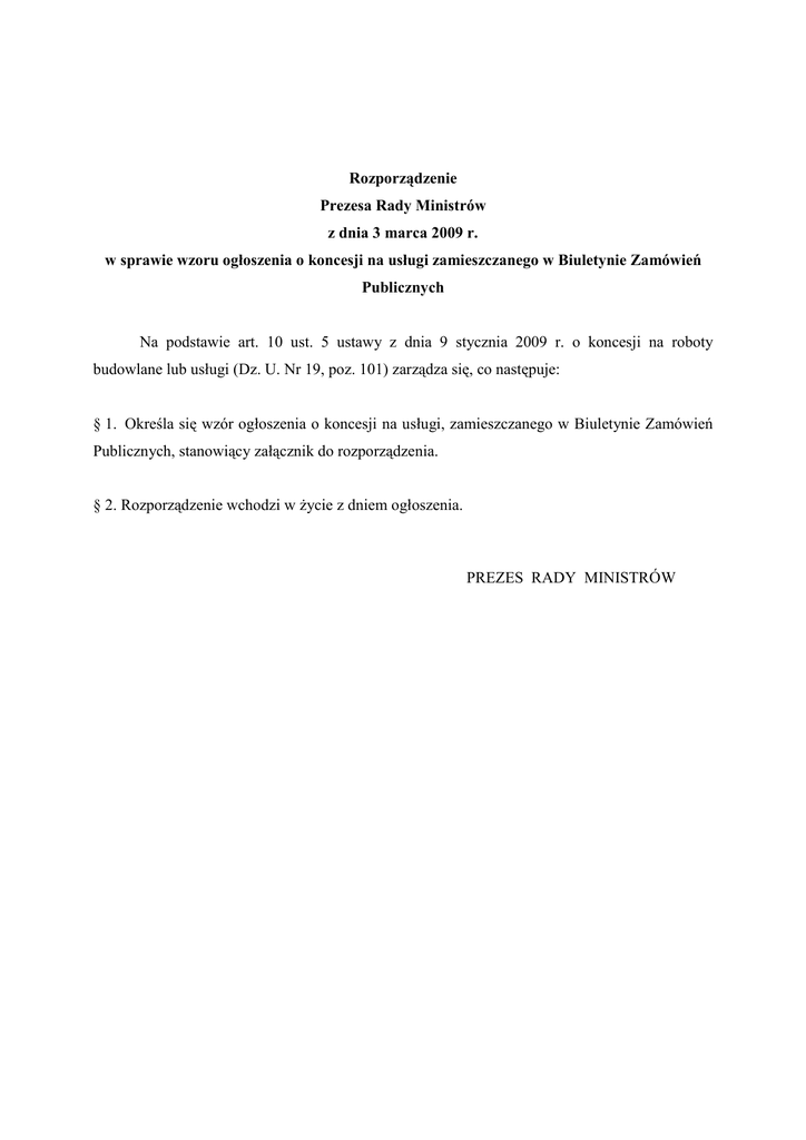 Rozporządzenie Prezesa Rady Ministrów z dnia 3 marca 2009 r. w sprawie wzoru ogłoszenia o koncesji na usługi zamieszczanego w Biuletynie Zamówień Publicznych Na podstawie art. 10 ust. 5 ustawy z dnia 9 stycznia 2009 r. o koncesji na roboty budowlane lub usługi (Dz. U. Nr 19, poz. 101) zarządza się, co następuje: § 1. Określa się wzór ogłoszenia o koncesji na usługi, zamieszczanego w Biuletynie Zamówień Publicznych, stanowiący załącznik do rozporządzenia. § 2. Rozporządzenie wchodzi w Ŝycie z dniem ogłoszenia. PREZES RADY MINISTRÓW Załącznik do rozporządzenia Prezesa Rady Ministrów z dnia………………..poz……. Urząd Zamówień Publicznych Zamieszczanie ogłoszeń on-line w BZP: http://www.portal.uzp.gov.pl OGŁOSZENIE O KONCESJI NA USŁUGI SEKCJA I: KONCESJODAWCA I. 1. NAZWA (FIRMA) I ADRES Nazwa (firma) Adres Miejscowość: Kod pocztowy: Tel.: Faks: Województwo: Adres strony internetowej koncesjodawcy (jeŜeli posiada): I. 2. RODZAJ KONCESJODAWCY Administracja rządowa centralna Administracja rządowa terenowa Administracja samorządowa Podmiot prawa publicznego Organ kontroli państwowej lub ochrony prawa, sąd lub trybunał Inny spośród podmiotów określonych w art. 3 ustawy z dnia 9 stycznia 2009 r. o koncesji na roboty budowlane lub usługi (naleŜy określić): ____________ SEKCJA II: PRZEDMIOT KONCESJI Nazwa nadana koncesji przez koncesjodawcę Określenie przedmiotu koncesji oraz jej wartości Opis potrzeb i wymagań koncesjodawcy / informacja o sposobie uzyskania opisu Termin wykonania przedmiotu koncesji (o ile jest to podyktowane specyfiką zawieranej umowy koncesji) SEKCJA III: INFORMACJE O CHARAKTERZE PRAWNYM, EKONOMICZNYM, FINANSOWYM I TECHNICZNYM III. WARUNKI UDZIAŁU Warunki udziału oraz opis sposobu dokonywania oceny spełniania warunków udziału w postępowaniu Informacja o oświadczeniach do których złoŜenia obowiązany jest zainteresowany podmiot, który składa wniosek o zawarcie umowy koncesji Informacja o dokumentach składanych przez oferenta, którego oferta została uznana za najkorzystniejszą albo oferenta, który złoŜy najkorzystniejszą ofertę spośród pozostałych ofert, o którym mowa w art. 21 ust. 3 ustawy z dnia 9 stycznia 2009 r. o koncesji na roboty budowlane lub usługi, w celu potwierdzenia spełniania warunków udziału w postępowaniu: SEKCJA IV: PROCEDURA IV. 1. WADIUM Wysokość i tryb wniesienia wadium (o ile jego wniesienie jest wymagane): IV. 2. KRYTERIA OCENY OFERT Kryteria Znaczenie (o ile moŜliwe do określenia) IV. 3. WARUNKI UZNANIA OFERTY ZA NIEODPOWIADAJĄCĄ WYMAGANIOM KONCESJODAWCY SKUTKUJĄCE NIEDOPUSZCZENIEM OFERT DO OCENY I PORÓWNANIA IV. 4. OKOLICZNOŚCI UZASADNIAJĄCE ODWOŁANIE POSTĘPOWANIA IV. 5. INFORMACJE ADMINISTRACYJNE Miejsce i termin składania wniosków o zawarcie umowy koncesji Data: // (dd/mm/rrrr) Godzina: Miejsce: Uzasadnienie: Rozporządzenie stanowi wykonanie delegacji ustawowej zawartej w art. 10 ust. 5 ustawy z dnia 9 stycznia 2009 r. o koncesji na roboty budowlane lub usługi (Dz. U. Nr 19, poz. 101), zwanej dalej „ustawą”. Przedmiotowy projekt rozporządzenia określa wzór ogłoszenia o koncesji na usługi, które koncesjodawca ma obowiązek zamieścić w Biuletynie Zamówień Publicznych. W ogłoszeniu o koncesji na usługi koncesjodawca powinien zamieścić wszystkie niezbędne informacje, przewidziane w art. 11 ustawy. Ogłoszenie składa się z czterech sekcji. W sekcji I, w części pierwszej powinny zostać podane dane dotyczące koncesjodawcy, takie jak nazwa, adres i adres strony internetowej, jak równieŜ rodzaj koncesjodawcy. W części drugiej koncesjodawca powinien określić przedmiot koncesji, podać jego nazwę, jak równieŜ opisać przedmiot koncesji, wraz ze swoimi wymaganiami dotyczącymi sposobu, w jaki powinny być świadczone usługi stanowiące przedmiot koncesji. Powinien takŜe podać czas, na jaki zostanie udzielona koncesja, który zgodnie z ustawą nie moŜe być dłuŜszy niŜ 15 lat. W sekcji II koncesjodawca powinien podać taki zakres informacji, który jest adekwatny do tego wstępnego etapu postępowania o zawarcie umowy koncesji. Sekcja III ogłoszenia o koncesji na usługi zawierać ma informacje o charakterze ekonomicznym, prawnym, technicznym i finansowym. W tej części powinny znaleźć się informacje o wymaganiach koncesjodawcy w zakresie oświadczeń, które kandydaci składają na tym etapie, ale takŜe informacja o dokumentach, składanych przez oferenta, którego oferta została uznana za najkorzystniejszą albo oferenta, który złoŜy najkorzystniejszą ofertę spośród pozostałych ofert, o którym mowa w art. 21 ust. 3, w celu potwierdzenia spełniania warunków udziału w postępowaniu. W tej części koncesjonodawca podaje, jakie dokumenty będą musiały być złoŜone przez oferenta, z którym będzie zawierał umowę. W sekcji IV ogłoszenia wskazane zostały niektóre wymagania proceduralne. W tej części koncesjonodawca powinien określić, czy będzie wymagał wniesienia wadium, a jeśli tak to w jakiej wysokości. Winien równieŜ podać w jakim trybie kandydaci powinni wnosić wadium. Koncesjodawca podaje tu takŜe kryteria oceny, jakimi będzie się kierował przy ocenie ofert złoŜonych w drugim etapie postępowania. Znaczenie kryteriów powinno zostać podane jedynie w przypadku, gdy na tym etapie jest moŜliwe ich określenie przez koncesjodawcę. W tabeli trzeciej sekcji IV koncesjonodawca podaje jakie mogą być przyczyny uznania oferty za nieodpowiadającą wymaganiom, natomiast w tabeli IV jakie mogą być przyczyny odwołania postępowania. Okoliczności te powinny być określone zgodnie z art. 19 ust 1 ustawy. Część 5 sekcji IV ma charakter wyłącznie proceduralny. Koncesjodawca określa w niej gdzie moŜna otrzymać dokładny opis przedmiotu koncesji, jak równieŜ gdzie i do kiedy moŜna składać wnioski o zawarcie umowy koncesji. Wejście w Ŝycie projektowanego rozpor