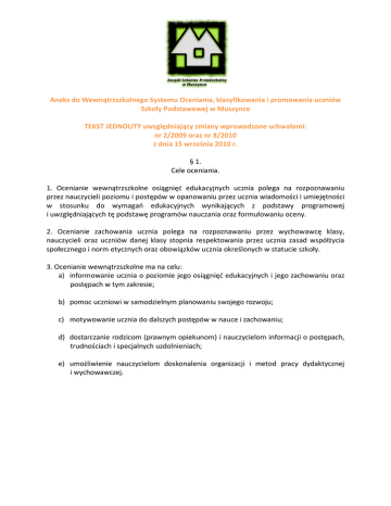 Aneks do Wewnątrzszkolnego Systemu Oceniania, klasyfikowania i promowania uczniów Szkoły Podstawowej w Muszynce TEKST JEDNOLITY uwzględniający zmiany wprowadzone uchwałami: nr 2/2009 oraz nr 8/2010 z dnia 15 września 2010 r. § 1. Cele oceniania. 1. Ocenianie wewnątrzszkolne osiągnięć edukacyjnych ucznia polega na rozpoznawaniu przez nauczycieli poziomu i postępów w opanowaniu przez ucznia wiadomości i umiejętności w stosunku do wymagań edukacyjnych wynikających z podstawy programowej i uwzględniających tę podstawę programów nauczania oraz formułowaniu oceny. 2. Ocenianie zachowania ucznia polega na rozpoznawaniu przez wychowawcę klasy, nauczycieli oraz uczniów danej klasy stopnia respektowania przez ucznia zasad współżycia społecznego i norm etycznych oraz obowiązków ucznia określonych w statucie szkoły. 3. Ocenianie wewnątrzszkolne ma na celu: a) informowanie ucznia o poziomie jego osiągnięć edukacyjnych i jego zachowaniu oraz postępach w tym zakresie; b) pomoc uczniowi w samodzielnym planowaniu swojego rozwoju; c) motywowanie ucznia do dalszych postępów w nauce i zachowaniu; d) dostarczanie rodzicom (prawnym opiekunom) i nauczycielom informacji o postępach, trudnościach i specjalnych uzdolnieniach; e) umożliwienie nauczycielom doskonalenia organizacji i metod pracy dydaktycznej i wychowawczej. § 2. Obszary oceniania. 1. Ocenianie wewnątrzszkolne obejmuje: a) formułowanie przez nauczycieli klas I-III wymagań edukacyjnych w zakresie obowiązujących i dodatkowych zajęć edukacyjnych, na poszczególne lata szkolne oraz informowanie o nich uczniów i rodziców (opiekunów); b) ustalenie kryteriów oceniania i zachowania; c) bieżące ocenianie i śródroczne klasyfikowanie z obowiązkowych i dodatkowych zajęć edukacyjnych oraz ustalenie śródrocznej oceny klasyfikacyjnej zachowania; d) ustalenie semestralnych i rocznych ocen klasyfikacyjnych z obowiązkowych i dodatkowych zajęć edukacyjnych oraz oceny rocznej zachowania; e) ustalenie warunków i sposobu przekazywania rodzicom (opiekunom) informacji o postępach i trudnościach ucznia w nauce; f) ustalenie warunków i trybu uzyskania wyższych niż przewidywane rocznych ocen klasyfikacyjnych z obowiązkowych i dodatkowych zajęć edukacyjnych oraz rocznej oceny klasyfikacyjnej zachowania. §3. Zasady oceniania. 1. Informowanie uczniów i rodziców (opiekunów): a) W SP Muszynce, w klasach I-III nauczyciele przygotowują, na pierwsze (w każdym roku szkolnym) zebranie z rodzicami, zestawy wymagań dotyczących poszczególnych aktywności edukacyjnych i wykazy form sprawdzania osiągnięć. Sformułowane wymagania edukacyjne dotyczą kolejnych lat nauki i wynikają z podstawy programowej i uwzględniających ją realizowanych programów nauczania. Osiągnięcia uczniów sprawdzane są poprzez: 1) samodzielne sprawdziany i prace, 2) prace domowe, 3) praktyczne stosowanie wiadomości i umiejętności, 4) odpowiedzi i prezentacje, 5) sprawdzian kompetencji na zakończenie I etapu edukacyjnego. b) Nauczyciele edukacji wczesnoszkolnej przygotowują informacje o warunkach i trybie uzyskiwania wyższej niż przewidywana oceny klasyfikacyjnej rocznej oraz semestralnej z zajęć edukacyjnych: 1) warunkiem uzyskania oceny wyższej niż przewidywana jest spełnienie wymagań niezbędnych do otrzymania danej oceny z zajęć edukacyjnych (w terminie od określenia oceny przewidywanej, tj. od otrzymania oceny śródsemestralnej w klasach I-III, do posiedzenia klasyfikacyjnego rady pedagogicznej); 2) tryb uzyskiwania oceny wyższej niż przewidywana zakłada: - uzyskanie lepszych od dotychczasowych ocen cząstkowych ze wskazanych przez nauczyciela działów programowych lub partii materiału - lub przedstawienie przez ucznia dowodów jego aktywności, samodzielności poznawczej (np. przedstawienie port folio itp.) oraz wykazanie się zdobytą wiedzą mającą związek z danymi zajęciami edukacyjnymi, o ile nauczyciel przewidywał taką możliwość. c) Uczniowie zapoznają się z wymaganiami, sposobem sprawdzania osiągnięć oraz warunkami i trybem uzyskiwania wyższej niż przewidywana semestralnej i rocznej oceny. d) Uczniowie winni mieć w zeszytach lub dzienniczkach (jeśli nie prowadzą zeszytów z danego przedmiotu) sporządzoną notatkę, dotyczącą wymagań i sprawdzania osiągnięć, podpisaną przez nauczyciela. e) Rodzice podpisem w zeszycie lub dzienniczku potwierdzają fakt zapoznania się z informacją nauczyciela. f) O warunkach, sposobie i kryteriach oceniania zachowania oraz warunkach i trybie uzyskania wyższej niż przewidywana rocznej oceny klasyfikacyjnej wychowawca informuje uczniów na pierwszej lekcji, a rodziców podczas pierwszego zebrania w danym roku szkolnym: 1) warunkiem uzyskania wyższej rocznej niż przewidywana, oceny zachowania jest spełnienie wymagań niezbędnych do uzyskania danej oceny, do posiedzenia klasyfikacyjnego; 2) tryb uzyskania oceny wyższej niż przewidywana zakłada: - przedstawienie przez ucznia działań, które nie były znane wcześniej, a dowodzą dbałości o honor i tradycje szkoły lub świadczą o zadośćuczynieniu krzywdy albo o okazywaniu szacunku innym; 3) skutkach ustalenia uczniowi nagannej rocznej oceny klasyfikacyjnej zachowania. g) Rodzice znają określone we wrześniu terminy zebrań i dni otwartych w danym roku szkolnym. Zapoznanie się z tym terminarzem potwierdzają podpisem. Zebrania i dni otwarte umożliwiają co miesięczne zasięgnięcie opinii o postępach i trudnościach dziecka w nauce oraz o jego zachowaniu. h) W przypadku dłuższego (niż 3 miesiące) braku kontaktu rodziców (opiekunów) z wychowawcą lub nauczycielami uczącymi w klasie bądź braku podpisanych ocen w zeszycie, wychowawca przesyła pocztą (za potwierdzeniem odbioru) zestawienie ocen śródsemestralnych. i) Bieżące informowanie o stanie osiągnięć i trudnościach dokonuje się poprzez zeszyt ucznia. 2. Jawność oceniania. a) Oceny są jawne za