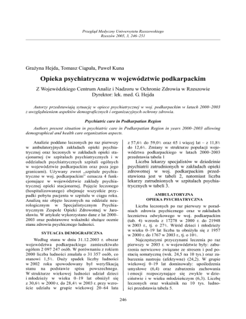 Przegląd Medyczny Uniwersytetu Rzeszowskiego Rzeszów 2005, 3, 246–251 Grażyna Hejda, Tomasz Ciąpała, Paweł Kuna Opieka psychiatryczna w województwie podkarpackim Z Wojewódzkiego Centrum Analiz i Nadzoru w Ochronie Zdrowia w Rzeszowie Dyrektor: lek. med. G. Hejda Autorzy przedstawiają sytuację w opiece psychiatrycznej w woj. podkarpackim w latach 2000–2003 z uwzględnieniem aspektów demograficznych i organizacyjnych ochrony zdrowia. Psychiatric care in Podkarpatian Region Authors present situation in psychiatric care in Podkarpatian Region in years 2000–2003 allowing demographical and health care organization aspects. Analizie poddano leczonych po raz pierwszy w ambulatoryjnych zakładach opieki psychiatrycznej oraz leczonych w zakładach opieki stacjonarnej (w szpitalach psychiatrycznych i w oddziałach psychiatrycznych szpitali ogólnych w województwie podkarpackim oraz poza jego granicami). Używany zwrot „szpitale psychiatryczne w woj. podkarpackim” oznacza 4 funkcjonujące w województwie zakłady psychiatrycznej opieki stacjonarnej. Pojęcie leczonego (hospitalizowanego) obejmuje wszystkie przypadki pobytu pacjenta w szpitalu w ciągu roku. Analizą nie objęto leczonych na oddziale neurologicznym w Specjalistycznym Psychiatrycznym Zespole Opieki Zdrowotnej w Jarosławiu. W artykule wykorzystano dane z lat 2000– 2003 oraz podstawowe wskaźniki służące ocenie stanu zdrowia psychicznego ludności. z 57,6% do 59,0% oraz 65 i więcej lat – z 11,8% do 12,6%. Zmiany w strukturze populacji województwa podkarpackiego w latach 2000–2003 przedstawia tabela 1 Liczba lekarzy specjalistów w dziedzinie psychiatrii zatrudnionych w zakładach opieki zdrowotnej w woj. podkarpackim przedstawiona jest w tabeli 2, natomiast liczba lekarzy zatrudnionych w szpitalach psychiatrycznych w tabeli 3. AMBULATORYJNA OPIEKA PSYCHIATRYCZNA Liczba leczonych po raz pierwszy w poradniach zdrowia psychicznego oraz w zakładach lecznictwa odwykowego w woj. podkarpackim (tab. 4) wzrosła z 17278 w 2000 r. do 21948 w 2003 r., tj. o 27%. Wśród dzieci i młodzieży w wieku 0–19 lat liczba ta obniżyła się z 1957 w 2000 r. do 1767 w 2003 r., tj. o 10%. Najczęstszymi przyczynami leczenia po raz pierwszy w 2003 r. w województwie były: zaburzenia nerwicowe związane ze stresem i pod postacią somatyczną (wsk. 24,5 na 10 tys.) oraz zaburzenia nastroju (afektywne) (24,2). W grupie wiekowej 0–19 lat dominowały: upośledzenia umysłowe (6,4) oraz zaburzenia zachowania i emocji rozpoczynające się zwykle w dzieciństwie i w wieku młodzieńczym (6,3). Liczbę leczonych oraz wskaźnik na 10 tys. ludności przedstawia tabela 5. SYTUACJA DEMOGRAFICZNA Według stanu w dniu 31.12.2003 r. obszar województwa podkarpackiego zamieszkiwało ogółem 2 097 247 osób. W porównaniu z rokiem 2000 liczba ludności zmalała o 31 357 osób, co stanowi 1,5%. Duży spadek liczby ludności w 2002 roku spowodowany był weryfikacją stanu na podstawie spisu powszechnego. W strukturze wiekowej ludności udział dzieci i młodzieży w wieku 0–19 lat obniżył się z 30,6% w 2000 r. do 28,4% w 2003 r. przy wzroście udziału w grupie wiekowej 20–64 lata 246 TABELA 1 Lata 2000 2001 2002 2003 Ogółem 2 128 605 2 131 368 2 105 050 2 097 248 0–19 lat 650 355 634 711 619 358 596 156 20–64 lata 1 226 229 1 239 498 1 224 781 1 237 696 65 i więcej lat 252 021 257 159 260 911 263 396 TABELA 2 Liczba bezwzględna Lata 2000 2001 2002 2003 Wskaźnik na 10 tys. ludności 109 93 95 100 0,5 0,4 0,5 0,5 W tym specjaliści II stopnia liczba wskaźnik na 10 tys. ludnobezwzględna ści 52 0,2 46 0,2 58 0,3 70 0,3 TABELA 3 Liczba bezwzględna 45 48 53 51 Lata 2000 2001 2002 2003 Wskaźnik na 10 tys. ludności 0,2 0,2 0,3 0,2 TABELA 4 Ogółem Lata 2000 2001 2002 2003 Liczby bezwzględne 17 278 16 922 17 606 21 948 Wskaźnik na 10 tys. ludności 81,2 79,5 83,7 104,7 W tym w wieku 0–19 lat Wskaźnik na 10 tys. Liczby bezwzględne ludności 1 957 29,7 1 904 29,6 1 961 31,2 1 767 29,1 TABELA 5 ogółem Wyszczególnienie l. bezwzgl. Ogółem Z tego organiczne zaburzenia psychiczne włącznie z zespołami objawowymi (F00-F09) zaburzenia psychiczne i zaburzenia zachowania spowodowane używaniem środków (substancji) psychoaktywnych (F10-F19) schizofrenia, zaburzenia typu schizofrenii (schizotypowe) i urojeniowe (F20-F29) zaburzenia nastroju (afektywne) (F30-F39) 2000 2001 2002 2003 2000 2001 2002 2003 2000 2001 2002 2003 2000 2001 2002 2003 2000 2001 2002 2003 247 17 278 16 922 17 606 21 948 1 406 1 463 1 659 2 329 2 775 2 920 2 814 2 678 1 293 849 752 2 039 4 008 3 724 3 571 5 077 wsk. na 10 tys. 81,2 79,5 83,7 104,7 6,6 6,9 7,9 11,1 13,0 13,7 13,3 12,8 6,1 4,0 3,5 9,7 18,9 17,5 17,0 24,2 w tym w wieku 0-19 lat l. bezwzgl. 1 957 1 904 1 961 1 767 26 12 72 77 64 72 54 43 79 66 106 198 143 119 158 147 wsk. na 10 tys. 29,7 29,6 31,2 29,1 0,4 0,2 1,1 1,3 0,9 1,2 0,8 0,7 1,2 1,0 1,7 3,3 2,2 1,9 2,6 2,5 zaburzenia nerwicowe, związane ze stresem i pod postacią somatyczną (somatoform) (F40F48) zespoły behawioralne związane z zaburzeniami fizjologicznymi i czynnikami fizycznymi (F50F59) zaburzenia osobowości i zachowania dorosłych (F60-F69) upośledzenie umysłowe (F70-F79) zaburzenia rozwoju psychicznego (psychologicznego) (F80-F89) zaburzenia zachowania i emocji rozpoczynające się zwykle w dzieciństwie i w wieku młodzieńczym (F90-F98) nieokreślone zaburzenia psychiczne (F99) obserwacja stanu psychicznego, rozpoznania nieustalone, bez zaburzeń psychicznych i rozpoznania niepsychiatryczne 2000 2001 2002 2003 2000 2001 2002 2003 2000 2001 2002 2003 2000 2001 2002 2003 2000 2001 2002 2003 2000 2001 2002 2003 2000 2001 2002 2003 2000 2001 2002 2003 3 851 3 640 4 685 5 144 145 140 162 301 192 304 333 436 687 639 955 1 004 134 120 162 187 545 648 841 757 684 653 371 928 1 558 1 822 1 301 1 068 18,1 17,1 22,3 24,5 0,7 0,7 0,8 1,4 0,9 1,4 1,6 2,1 3,2 3,0 4,5 4,8 0,7 0,5 0,8 0,8 2,6 3,0 4,0 3,6 3,2 3,1 1,8 4,4 7,3 8,6 6,2 