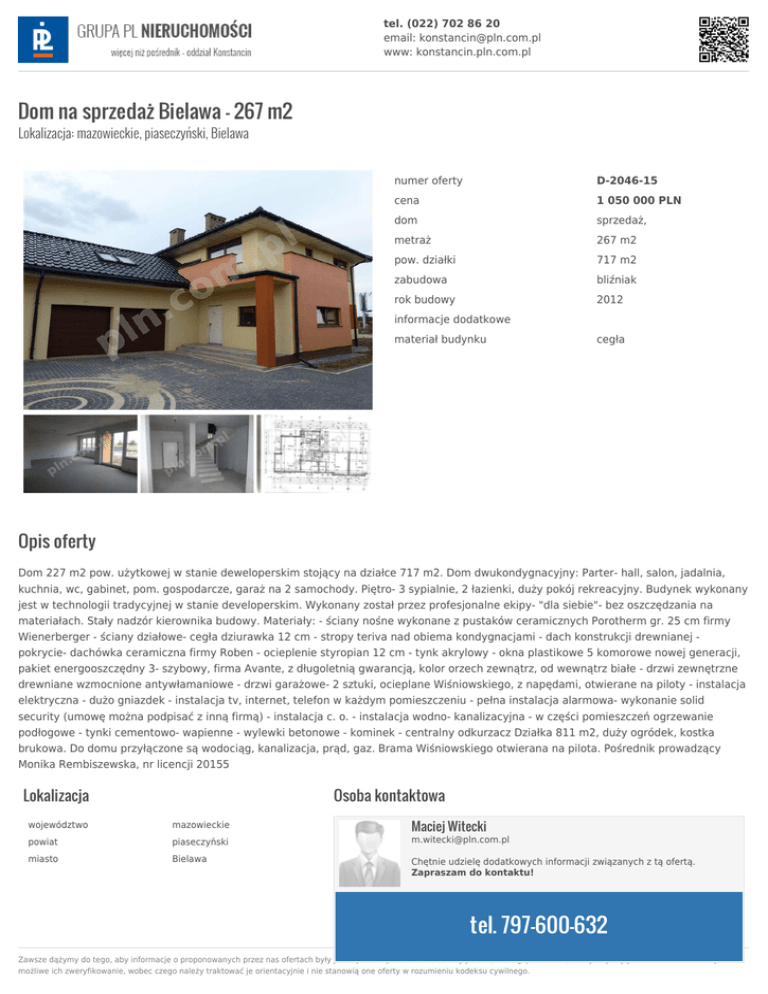 tel. (022) 702 86 20 email: [email protected] www: konstancin.pln.com.pl Dom na sprzedaż Bielawa - 267 m2 Lokalizacja: mazowieckie, piaseczyński, Bielawa numer oferty D-2046-15 cena 1 050 000 PLN dom sprzedaż, metraż 267 m2 pow. działki 717 m2 zabudowa bliźniak rok budowy 2012 informacje dodatkowe materiał budynku cegła Opis oferty Dom 227 m2 pow. użytkowej w stanie deweloperskim stojący na działce 717 m2. Dom dwukondygnacyjny: Parter- hall, salon, jadalnia, kuchnia, wc, gabinet, pom. gospodarcze, garaż na 2 samochody. Piętro- 3 sypialnie, 2 łazienki, duży pokój rekreacyjny. Budynek wykonany jest w technologii tradycyjnej w stanie developerskim. Wykonany został przez profesjonalne ekipy- "dla siebie"- bez oszczędzania na materiałach. Stały nadzór kierownika budowy. Materiały: - ściany nośne wykonane z pustaków ceramicznych Porotherm gr. 25 cm firmy Wienerberger - ściany działowe- cegła dziurawka 12 cm - stropy teriva nad obiema kondygnacjami - dach konstrukcji drewnianej pokrycie- dachówka ceramiczna firmy Roben - ocieplenie styropian 12 cm - tynk akrylowy - okna plastikowe 5 komorowe nowej generacji, pakiet energooszczędny 3- szybowy, firma Avante, z długoletnią gwarancją, kolor orzech zewnątrz, od wewnątrz białe - drzwi zewnętrzne drewniane wzmocnione antywłamaniowe - drzwi garażowe- 2 sztuki, ocieplane Wiśniowskiego, z napędami, otwierane na piloty - instalacja elektryczna - dużo gniazdek - instalacja tv, internet, telefon w każdym pomieszczeniu - pełna instalacja alarmowa- wykonanie solid security (umowę można podpisać z inną firmą) - instalacja c. o. - instalacja wodno- kanalizacyjna - w części pomieszczeń ogrzewanie podłogowe - tynki cementowo- wapienne - wylewki betonowe - kominek - centralny odkurzacz Działka 811 m2, duży ogródek, kostka brukowa. Do domu przyłączone są wodociąg, kanalizacja, prąd, gaz. Brama Wiśniowskiego otwierana na pilota. Pośrednik prowadzący Monika Rembiszewska, nr licencji 20155 Lokalizacja Osoba kontaktowa Maciej Witecki województwo mazowieckie powiat piaseczyński [email protected] miasto Bielawa Chętnie udzielę dodatkowych informacji związanych z tą ofertą. Zapraszam do kontaktu! tel. 797-600-632 Zawsze dążymy do tego, aby informacje o proponowanych przez nas ofertach były jak najbardziej dokładne. Niekiedy jednak, ze względu na fakt, iż uzyskujemy je od osób trzecich nie jest możliwe ich zweryfikowanie, wobec czego należy traktować je orientacyjnie i nie stanowią one oferty w rozumieniu kodeksu cywilnego.