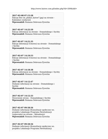 http://www.bytow.com.pl/index.php?id=209&idd= 2017-02-08 07:15:28 Edycja foto (m_plakat_bytow7.jpg) na stronie Kalendarz wydarzeń Wprowadził: Romana Delevaux-Żywicka 2017-02-07 14:22:59 Edycja informacji na stronie - Domańskiego i Sychty Wprowadził: Romana Delevaux-Żywicka 2017-02-07 14:21:35 Edycja informacji (Umowa) na stronie - Domańskiego i Sychty Wprowadził: Romana Delevaux-Żywicka 2017-02-07 14:19:53 Edycja informacji (Umowa) na stronie - Domańskiego i Sychty Wprowadził: Romana Delevaux-Żywicka 2017-02-07 14:18:38 Edycja informacji na stronie - Domańskiego i Sychty Wprowadził: Romana Delevaux-Żywicka 2017-02-07 14:12:47 Dodanie informacji na stronie - Domańskiego i Sychty Wprowadził: Romana Delevaux-Żywicka 2017-02-07 14:12:33 Stworzenie strony - Domańskiego i Sychty Wprowadził: Romana Delevaux-Żywicka 2017-02-07 09:58:56 Dodanie informacji (Konsultacje społeczne ws. projektu Lokalnego Programu Rewitalizacji rozpoczęte) na stronie - Aktualności Wprowadził: Romana Delevaux-Żywicka 2017-02-07 09:58:56 Dodanie informacji (Konsultacje społeczne ws. projektu Lokalnego Programu Rewitalizacji rozpoczęte) na stronie - Lokalny Program Rewitalizacji Bytowa Wprowadził: Romana Delevaux-Żywicka 2017-02-06 15:40:27 Dodanie informacji (IX edycja konkursu „Polska wieś – dziedzictwo i przyszłość”) na stronie - Aktualności Wprowadził: Romana Delevaux-Żywicka 1 ... | 17 | 18 | 19 | 20 | 21 | 22 | 23 | 24 | 25 | 26 | 27 | 28 | 29 | 30 | 31 | ... 677