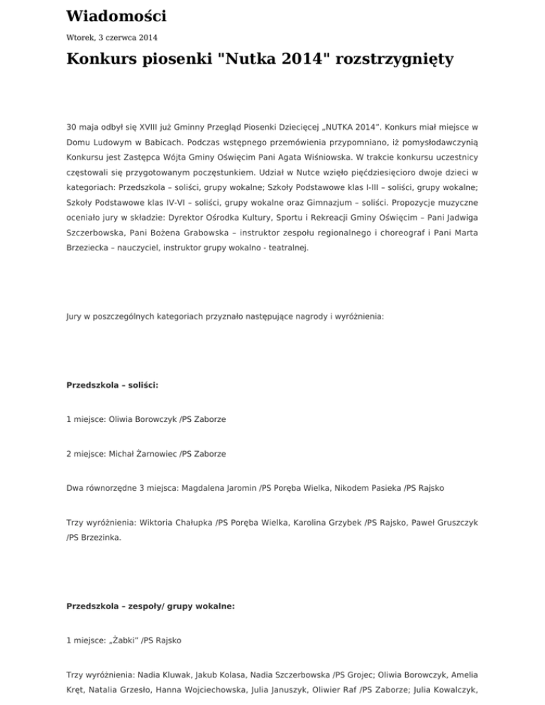 Wiadomości Wtorek, 3 czerwca 2014 Konkurs piosenki "Nutka 2014" rozstrzygnięty 30 maja odbył się XVIII już Gminny Przegląd Piosenki Dziecięcej „NUTKA 2014”. Konkurs miał miejsce w Domu Ludowym w Babicach. Podczas wstępnego przemówienia przypomniano, iż pomysłodawczynią Konkursu jest Zastępca Wójta Gminy Oświęcim Pani Agata Wiśniowska. W trakcie konkursu uczestnicy częstowali się przygotowanym poczęstunkiem. Udział w Nutce wzięło pięćdziesięcioro dwoje dzieci w kategoriach: Przedszkola – soliści, grupy wokalne; Szkoły Podstawowe klas I-III – soliści, grupy wokalne; Szkoły Podstawowe klas IV-VI – soliści, grupy wokalne oraz Gimnazjum – soliści. Propozycje muzyczne oceniało jury w składzie: Dyrektor Ośrodka Kultury, Sportu i Rekreacji Gminy Oświęcim – Pani Jadwiga Szczerbowska, Pani Bożena Grabowska – instruktor zespołu regionalnego i choreograf i Pani Marta Brzeziecka – nauczyciel, instruktor grupy wokalno - teatralnej. Jury w poszczególnych kategoriach przyznało następujące nagrody i wyróżnienia: Przedszkola – soliści: 1 miejsce: Oliwia Borowczyk /PS Zaborze 2 miejsce: Michał Żarnowiec /PS Zaborze Dwa równorzędne 3 miejsca: Magdalena Jaromin /PS Poręba Wielka, Nikodem Pasieka /PS Rajsko Trzy wyróżnienia: Wiktoria Chałupka /PS Poręba Wielka, Karolina Grzybek /PS Rajsko, Paweł Gruszczyk /PS Brzezinka. Przedszkola – zespoły/ grupy wokalne: 1 miejsce: „Żabki” /PS Rajsko Trzy wyróżnienia: Nadia Kluwak, Jakub Kolasa, Nadia Szczerbowska /PS Grojec; Oliwia Borowczyk, Amelia Kręt, Natalia Grzesło, Hanna Wojciechowska, Julia Januszyk, Oliwier Raf /PS Zaborze; Julia Kowalczyk, Matylda Kwadrans, Wiktoria Wojnowski /PS Włosienica Szkoły Podstawowe klas I-III – soliści: 1 miejsce: Julia Gabryel /SP Rajsko 2 miejsce: Edyta Lasek /SP Brzezinka 3 miejsce: Aleksandra Pędrys /SP Grojec Szkoły Podstawowe klas I-III – zespoły/ grupy wokalne: 1 miejsce: Lidia Jastrzębiowska, Maja Chojnacka /SP Rajsko Szkoły Podstawowe klas IV-VI - soliści: 1 miejsce: Zuzanna Bratek /SP Poręba Wielka Dwa równorzędne 2 miejsca: Martyna Kobylańska /SP Grojec, Klaudia Kawiorska /SP Rajsko 3 miejsce: Marta Wykręt /SP Rajsko Cztery wyróżnienia: Nikola Borycka /SP Rajsko, Sandra Kruk /SP Poręba Wielka, Marta Tobiasz /SP Brzezinka, Kinga Chowaniec /OKSiR Szkoły Podstawowe klas IV-VI zespoły/ grupy wokalne: 1 miejsce: Klaudia Słowińska, Natalia Słowińska /SP Rajsko 2 miejsce: Maria Jacuzzo, Milena Matyja, Oliwia Milowska /SP Babice Wyróżnienie: "Audiogirls" /OKSiR Gimnazjum - soliści: 1 miejsce: Marta Kopacz /GG nr. 1 Rajsko Wyróżnienie: Natalia Podbiał /GG nr. 1 Rajsko Ośrodek Kultury, Sportu i Rekreacji Gminy Oświęcim, organizator „Nutka 2014” dziękuje za liczne przybycie i udział w konkursie. Gratuluje uczestnikom talentów, a opiekunom zdolnych, zaangażowanych uczniów. Wręczenie nagród oraz koncert laureatów odbędzie się 15 czerwca w ramach obchodów Dni Gminy Oświęcim w Brzezince.