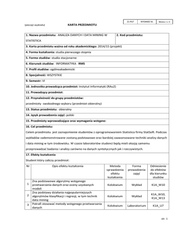 Z1-PU7 WYDANIE N1 Strona 1 z 3 KARTA PRZEDMIOTU (pieczęć wydziału) 1. Nazwa przedmiotu: ANALIZA DANYCH I DATA MINING W 2. Kod przedmiotu: STATISTICA 3. Karta przedmiotu ważna od roku akademickiego: 2014/15 (projekt) 4. Forma kształcenia: studia pierwszego stopnia 5. Forma studiów: studia stacjonarne 6. Kierunek studiów: INFORMATYKA RMS 7. Profil studiów: ogólnoakademicki 8. Specjalność: WSZYSTKIE 9. Semestr: VI 10. Jednostka prowadząca przedmiot: Instytut Informatyki (RAu2) 11. Prowadzący przedmiot: 12. Przynależność do grupy przedmiotów: przedmioty swobodnego wyboru (przedmiot obieralny) 13. Status przedmiotu: obieralny 14. Język prowadzenia zajęć: polski 15. Przedmioty wprowadzające oraz wymagania wstępne: 16. Cel przedmiotu: Celem przedmiotu jest zaznajomienie studentów z oprogramowaniem Statistica firmy StatSoft. Podczas wykładów zademonstrowane zostaną podstawowe oraz bardziej zaawansowane techniki analizy danych i data mining w tym środowisku. W czasie laboratoriów studenci będą mieli okazję samemu przeprowadzać badania i analizy zarówno na danych syntetycznych jak i rzeczywistych. 17. Efekty kształcenia Student który zaliczy przedmiot: Nr 1 2 3 Opis efektu kształcenia Zna podstawowe algorytmy wstępnego przetwarzania danych oraz oceny uzyskanych modeli Zna podstawy działania najpopularniejszych algorytmów klasyfikacji i regresji, w tym technik data mining Potrafi stosować metody wstępnego przetwarzania danych Metoda sprawdzenia efektu kształcenia Forma prowadzenia zajęć Odniesienie do efektów dla kierunku studiów Kolokwium Wykład K1A_W10 Kolokwium Wykład K1A_W10, K1A_W13 Kolokwium Laboratorium K1A_U7 str. 1 4 5 6 7 Potrafi budować i oceniać proste modele liniowe i nieliniowe Potrafi budować i oceniać modele uczenia nienadzorowanego Potrafi budować i oceniać modele uczenia nadzorowanego Potrafi automatyzować przebieg analizy danych Kolokwium Laboratorium K1A_U7 Kolokwium Laboratorium K1A_U7 Kolokwium Laboratorium K1A_U7 Kolokwium Laboratorium K1A_U7 18. Formy zajęć dydaktycznych i ich wymiar (liczba godzin) Wykład Ćwiczenia 30 Laboratorium Projekt Seminarium 30 19. Treści kształcenia: Wykład: 1. Przypomnienie podstawowych pojęć z zakresu statystyki opisowej i wnioskowania statystycznego. Ocena uzyskiwanych modeli . 2. Wprowadzenie do środowiska Statistica, omówienie jej funkcjonalności i podstawowych modułów. 3. Operacje na danych, filtrowanie przypadków i zmiennych. Operacje dostępu do danych zewnętrznych. 4. Analizy wariancji w środowisku Statistica. 5. Analiza danych wielowymiarowych, porządkowanie liniowe, skalowanie wielowymiarowe. 6. Modele regresyjne w Statistica: modele liniowe i regresja wieloraka. 7. Techniki Data Mining w Statistica: przetwarzanie wstępne danych, obsługa braków danych i obserwacji nietypowych, przekształcenia zmiennych, dyskretyzacja zmiennych. 8. Techniki Data Mining w Statistica – modele nienadzorowane: analiza koszykowa, sekwencji, analiza skupień. 9. Techniki Data Mining w Statistica – modele nadzorowane: sztuczne sieci neuronowe, MARS, maszyny wektorów podpierających, drzewa klasyfikacyjne i regresyjne. 10. Prezentacja środowiska Statistica Data Miner. 11. Elementy automatyzacji badań i raportów w środowisku Statistica – Statistica Visual Basic. Laboratorium: 1. Zapoznanie ze środowiskiem Statistica. 2. Budowa prostych modeli regresyjnych, ocena uzyskanych parametrów modelu. 3. Wstępne przetwarzanie danych. 4. Analiza danych z wykorzystaniem modeli nienadzorowanych. 5. Analiza danych z wykorzystaniem modeli nadzorowanych. 6. Rejestracja makr w Statistica. Modyfikacja i parametryzacja makr. Konstrukcja własnych makr w oparciu o zarejestrowane. 20. Egzamin: nie 21. Literatura podstawowa: 1. Internetowy podręcznik statystyki (http://www.statsoft.pl/textbook/stathome.html) 2. Kot S., Jakubowski J., Sokołowski A: Statystyka, Wyd. Difin, Warszawa 2011 3. Koronacki J., Mielniczuk J.: Statystyka dla studentów kierunków przyrodniczych i technicznych. 22. Literatura uzupełniająca: 1. Hastie T., Tibshirani R., Friedman J.: The elements of statistical learning: data mining, inference and prediction. (http://www-stat.stanford.edu/~tibs/ElemStatLearn/printings/ESLII_print10.pdf) 2. Stąpor K.: Automatyczna klasyfikacja obiektów. Exit. 2005 str. 2 23. Nakład pracy studenta potrzebny do osiągnięcia efektów kształcenia Lp. Liczba godzin kontaktowych / pracy studenta 30/30 Forma zajęć 1 Wykład 2 Ćwiczenia 3 Laboratorium 4 Projekt / 5 Seminarium / 6 Inne: / / 30/30 Suma godzin 60/60 24. Suma wszystkich godzin 120 25. Liczba punktów ECTS 4 26. Liczba punktów ECTS uzyskanych na zajęciach z bezpośrednim udziałem nauczyciela akademickiego 2 27. Liczba punktów ECTS uzyskanych na zajęciach o charakterze 2 praktycznym (laboratoria, projekty) 28. Uwagi: Zatwierdzono: ……………………………. ………………………………………………… (data i podpis prowadzącego) (data i podpis dyrektora instytutu/kierownika katedry/ Dyrektora Kolegium Języków Obcych/kierownika lub dyrektora jednostki międzywydziałowej) str. 3