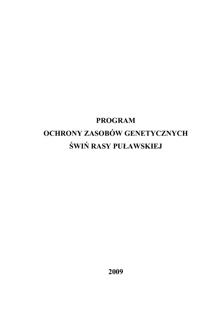 PROGRAM OCHRONY ZASOBÓW GENETYCZNYCH ŚWIŃ RASY PUŁAWSKIEJ 2009 PROGRAM OCHRONY ZASOBÓW GENETYCZNYCH ŚWIŃ RASY PUŁAWSKIEJ Historia rasy Historia rasy sięga początku wieku XX. Systematyczną pracę hodowlaną nad doskonaleniem tzw. świń gołębskich, które stały się zaczątkiem genealogii świń puławskich podjęto w 1926 r. w Stacji Zootechnicznej Państwowego Instytutu Naukowego Gospodarstwa Wiejskiego w Borowinie, pod merytorycznym nadzorem prof. Zdzisława Zabielskiego. Materiał wyjściowy stanowiło stado składające się z kilkunastu sztuk mieszańców prymitywnych świń miejscowych (polska świnia kłapoucha i mała polska ostroucha) z importowaną rasą Berkshire, tzw. „łaciatek” zakupionych z okolic wsi Gołąb; stąd pierwotna nazwa - świnia gołębska. Zwierzęta te uszlachetniano poprzez dolew krwi świń rasy wielkiej białej angielskiej oraz intensywną selekcję. Wyhodowano świnie w cenionym wówczas typie tłuszczowo-mięsnym, wykazywały one cechy wczesnego dojrzewania oraz intensywnego otłuszczania się już w młodym wieku. Cechą szczególną był fakt, iż tłuszcz odkładany był głównie w formie słoniny i tłuszczu wewnętrznego, w mniejszym stopniu jako tłuszcz międzymięśniowy. Pozwalało to uzyskiwać bardzo wysoką wydajność rzeźną (około 85%) przy masie ciała 150-180 kg i tym samym spełniać wymagania ówczesnego rynku wieprzowiny. W okresie tym tworzyło się coraz szersze grono rolników zainteresowanych chowem tej świni. Największe skupiska tzw. „łaciatek” powstały między Puławami a Dęblinem oraz w okolicach Kocka, Michowa i Kamionki. W roku 1935 rejon występowania tej rasy obejmował 7 powiatów woj. lubelskiego. W latach 1935-1951 świnie gołębskie rozprzestrzeniły się także w innych rejonach Polski (Mazowsze i Śląsk), wypierając w dużej mierze świnie biało umaszczone. Szczególnie docenianymi wówczas zaletami świni gołębskiej była zdrowotność oraz bardzo dobre przystosowanie do tradycyjnych warunków chowu, zwłaszcza żywienia zbożowo-ziemniaczanego. Loszki wcześnie uzyskiwały dojrzałość płciową, a lochy wykazywały dużą sprawność rozpłodową, wysoką mleczność i dobrze odchowywały mioty. W roku 1951 w związku z reorganizacją PINGW w Puławach Rada Naukowa podjęła decyzję o zmianie nazwy ekotypu świni gołębskiej na puławską. Podjęto decyzję o przekształceniu tych świń na typ bardziej mięsny. Zastosowano staranny dobór do kojarzeń i ostrą selekcję, jak również dolew krwi świń rasy wielkiej białej angielskiej w typie bekonowym i berkszyrów. Największe zainteresowanie hodowlą tej rasy przypada na lata 1950-1960. Rejonizacja świń rasy puławskiej spowodowała, że można je było utrzymywać w 51 gminach siedmiu województw tj.: białostockim, katowickim, kieleckim, krakowskim, lubelskim, łódzkim i warszawskim. Jeszcze w 1960 roku lochy puławskie stanowiły 9,8% krajowego stada loch zarodowych. W okresie lat 60. i 70. zasięg terytorialny rasy puławskiej obejmował łącznie 14 powiatów byłych województw: katowickiego, kieleckiego, lubelskiego i warszawskiego. Pod koniec lat 80. rozpoczął się etap intensywnej redukcji rasy, co doprowadziło do likwidacji w 2 roku 1992 jedynej hodowli wielkostadnej w PPR w Końskowoli. Ograniczenie zakresu wykorzystania świń puławskich w programach produkcji żywca rzeźnego spowodowane zostało presją rynku wieprzowiny, na którym preferowano tusze wysokomięsne. W roku 1997 populacja aktywna świń rasy puławskiej liczyła zaledwie 86 loch i 10 knurów stadnych. W wyniku podjętych wówczas działań organizacyjnych w kierunku ochrony zasobów genetycznych ras krajowych oraz wydzielenia subsydiów rządowych na wspieranie rozwoju stad zachowawczych, stan liczbowy populacji został ustabilizowany, wystąpiła nawet niewielka tendencja wzrostowa. W okresie tym stada hodowlane świń rasy puławskiej utrzymywane były w 4 województwach, tj.: bialskopodlaskim, lubelskim, siedleckim, i zamojskim. [1] Uzasadnienie konieczności objęcia populacji programem ochrony W aktualnych warunkach rynkowych rozwój świń rasy puławskiej nie jest możliwy z powodu gorszych wskaźników mięsności tuczników w stosunku do ras mięsnych oraz ich mieszańców. Jest to rasa lokalna przydatna do utrzymywania w gospodarstwach rodzinnych. Zachowanie jej może mieć znaczenie utylitarne ze względu na dużą przydatność tych świń do użytkowania w trudnych warunkach gospodarowania, w których tylko dobrze przystosowane rasy miejscowe umożliwiają eksploatację zasobów przyrodniczych środowiska i tym samym efektywną produkcję rolniczą. Hodowla tej rasy może przynieść wymierne korzyści gospodarcze i społeczne oraz wzmocnić sytuację ekonomiczną gospodarstw poprzez rozwój przetwórstwa i powstanie produktu lokalnego. Pula genów świni puławskiej powinna być zachowana dla przyszłych pokoleń, z myślą o jej ewentualnej przydatności w perspektywie zmiany warunków środowiskowych, wymagań człowieka, a także w uznaniu ich znaczenia jako elementu świadczącego o historii i tradycji regionu oraz zamieszkującej go ludności i jej tożsamości kulturowej. Celowość ochrony i rozwoju populacji uzasadniają względy gospodarcze i etnograficzne. Aspekt ekonomiczny wynika z istnienia uwarunkowań rozwoju gospodarczego poszczególnych regionów oraz przyjmowanych zasad doskonalenia warunków technologii, produkcji i programów wyżywienia ludności. Również trudności w przewidywaniu przyszłych zmian środowiska oraz odpowiednich genotypów zwierząt użytkowych skłaniają do przyjęcia hipotezy, że optymalnym rozwiązaniem możliwym obecnie do podjęcia, powinno być utrzymanie maksymalnie dużej różnorodności genetycznej. Doświadczenia i obserwacje prowadzone w tym zakresie wskazują, iż w odniesieniu do cech rozrodczych świnie puławskie charakteryzują się relatywnie wcześniejszym dojrz