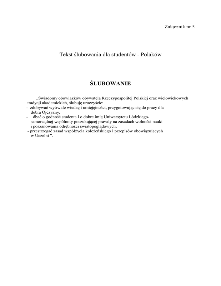 Za cznik nr 5 Tekst lubowania dla studentów - Polaków LUBOWANIE „ wiadomy obowi zków obywatela Rzeczypospolitej Polskiej oraz wielowiekowych tradycji akademickich, lubuj$ uroczy cie: - zdobywa& wytrwale wiedz$ i umiej$tno ci, przygotowuj c si$ do pracy dla dobra Ojczyzny, - dba& o godno & studenta i o dobre imi$ Uniwersytetu *ódzkiegosamorz dnej wspólnoty poszukuj cej prawdy na zasadach wolno ci nauki i poszanowania odr$bno ci wiatopogl dowych, - przestrzega& zasad wspó +ycia kole+e,skiego i przepisów obowi zuj cych w Uczelni ”.