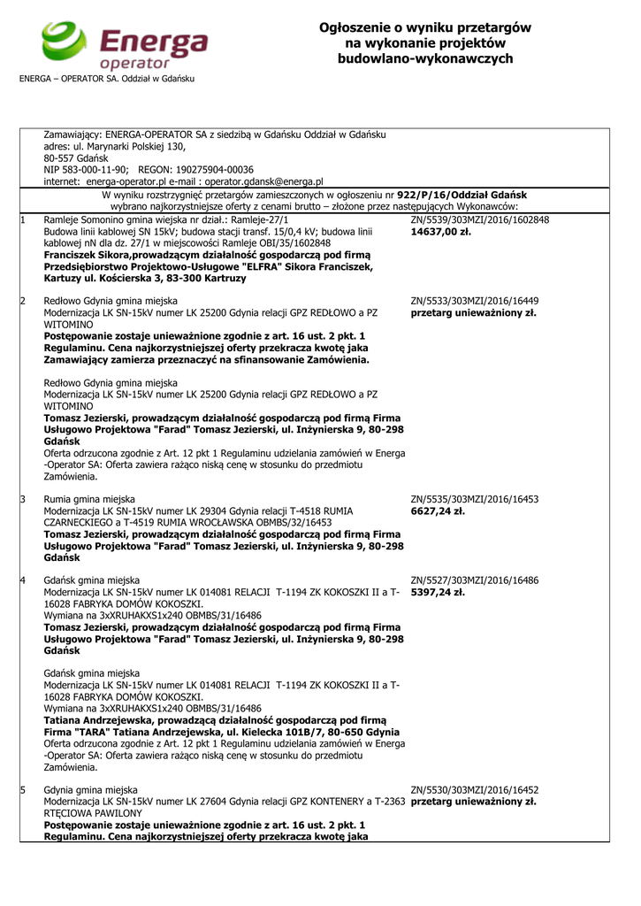Ogłoszenie o wyniku przetargów na wykonanie projektów budowlano-wykonawczych ENERGA – OPERATOR SA. Oddział w Gdańsku 1 2 Zamawiający: ENERGA-OPERATOR SA z siedzibą w Gdańsku Oddział w Gdańsku adres: ul. Marynarki Polskiej 130, 80-557 Gdańsk NIP 583-000-11-90; REGON: 190275904-00036 internet: energa-operator.pl e-mail : [email protected] W wyniku rozstrzygnięć przetargów zamieszczonych w ogłoszeniu nr 922/P/16/Oddział Gdańsk wybrano najkorzystniejsze oferty z cenami brutto – złożone przez następujących Wykonawców: Ramleje Somonino gmina wiejska nr dział.: Ramleje-27/1 ZN/5539/303MZI/2016/1602848 Budowa linii kablowej SN 15kV; budowa stacji transf. 15/0,4 kV; budowa linii 14637,00 zł. kablowej nN dla dz. 27/1 w miejscowości Ramleje OBI/35/1602848 Franciszek Sikora,prowadzącym działalność gospodarczą pod firmą Przedsiębiorstwo Projektowo-Usługowe "ELFRA" Sikora Franciszek, Kartuzy ul. Kościerska 3, 83-300 Kartruzy Redłowo Gdynia gmina miejska Modernizacja LK SN-15kV numer LK 25200 Gdynia relacji GPZ REDŁOWO a PZ WITOMINO Postępowanie zostaje unieważnione zgodnie z art. 16 ust. 2 pkt. 1 Regulaminu. Cena najkorzystniejszej oferty przekracza kwotę jaka Zamawiający zamierza przeznaczyć na sfinansowanie Zamówienia. ZN/5533/303MZI/2016/16449 przetarg unieważniony zł. Redłowo Gdynia gmina miejska Modernizacja LK SN-15kV numer LK 25200 Gdynia relacji GPZ REDŁOWO a PZ WITOMINO Tomasz Jezierski, prowadzącym działalność gospodarczą pod firmą Firma Usługowo Projektowa "Farad" Tomasz Jezierski, ul. Inżynierska 9, 80-298 Gdańsk Oferta odrzucona zgodnie z Art. 12 pkt 1 Regulaminu udzielania zamówień w Energa -Operator SA: Oferta zawiera rażąco niską cenę w stosunku do przedmiotu Zamówienia. 3 Rumia gmina miejska ZN/5535/303MZI/2016/16453 Modernizacja LK SN-15kV numer LK 29304 Gdynia relacji T-4518 RUMIA 6627,24 zł. CZARNECKIEGO a T-4519 RUMIA WROCŁAWSKA OBMBS/32/16453 Tomasz Jezierski, prowadzącym działalność gospodarczą pod firmą Firma Usługowo Projektowa "Farad" Tomasz Jezierski, ul. Inżynierska 9, 80-298 Gdańsk 4 Gdańsk gmina miejska ZN/5527/303MZI/2016/16486 Modernizacja LK SN-15kV numer LK 014081 RELACJI T-1194 ZK KOKOSZKI II a T- 5397,24 zł. 16028 FABRYKA DOMÓW KOKOSZKI. Wymiana na 3xXRUHAKXS1x240 OBMBS/31/16486 Tomasz Jezierski, prowadzącym działalność gospodarczą pod firmą Firma Usługowo Projektowa "Farad" Tomasz Jezierski, ul. Inżynierska 9, 80-298 Gdańsk Gdańsk gmina miejska Modernizacja LK SN-15kV numer LK 014081 RELACJI T-1194 ZK KOKOSZKI II a T16028 FABRYKA DOMÓW KOKOSZKI. Wymiana na 3xXRUHAKXS1x240 OBMBS/31/16486 Tatiana Andrzejewska, prowadzącą działalność gospodarczą pod firmą Firma "TARA" Tatiana Andrzejewska, ul. Kielecka 101B/7, 80-650 Gdynia Oferta odrzucona zgodnie z Art. 12 pkt 1 Regulaminu udzielania zamówień w Energa -Operator SA: Oferta zawiera rażąco niską cenę w stosunku do przedmiotu Zamówienia. 5 Gdynia gmina miejska ZN/5530/303MZI/2016/16452 Modernizacja LK SN-15kV numer LK 27604 Gdynia relacji GPZ KONTENERY a T-2363 przetarg unieważniony zł. RTĘCIOWA PAWILONY Postępowanie zostaje unieważnione zgodnie z art. 16 ust. 2 pkt. 1 Regulaminu. Cena najkorzystniejszej oferty przekracza kwotę jaka Ogłoszenie o wyniku przetargów na wykonanie projektów budowlano-wykonawczych ENERGA – OPERATOR SA. Oddział w Gdańsku Zamawiający zamierza przeznaczyć na sfinansowanie Zamówienia. Gdynia gmina miejska Modernizacja LK SN-15kV numer LK 27604 Gdynia relacji GPZ KONTENERY a T-2363 RTĘCIOWA PAWILONY Tomasz Jezierski, prowadzącym działalność gospodarczą pod firmą Firma Usługowo Projektowa "Farad" Tomasz Jezierski, ul. Inżynierska 9, 80-298 Gdańsk Oferta odrzucona zgodnie z Art. 12 pkt 1 Regulaminu udzielania zamówień w Energa -Operator SA: Oferta zawiera rażąco niską cenę w stosunku do przedmiotu Zamówienia. 6 Kalisz Dziemiany gmina wiejska nr dział.: Kalisz-804/5 ZN/5529/303MZI/2016/1602890 Budowa linii SN, Stacji transformatorowej SN/nN oraz linii kablowej nN dla zasilania przetarg unieważniony zł. budynku mieszkalnego jednorodzinnego na dz. 804/5, 804/6, 804/7, 804/8, 804/9 w m. Kalisz gm. Dziemiany. Postępowanie zostaje unieważnione zgodnie z art. 16 ust. 2 pkt. 1 Regulaminu. Cena najkorzystniejszej oferty przekracza kwotę jaka Zamawiający zamierza przeznaczyć na sfinansowanie Zamówienia. 7 Gdańsk gmina miejska ZN/5531/303MZI/2016/16488 Modernizacja LK SN-15kV numer LK 014206 RELACJI T-1808 PZ STARA APTEKA a T- przetarg unieważniony zł. 16729 URZĄD MIEJSKI. Wymiana na 3xXRUHAKXS1x120 Postępowanie zostaje unieważnione zgodnie z art. 16 ust. 2 pkt. 1 Regulaminu. Cena najkorzystniejszej oferty przekracza kwotę jaka Zamawiający zamierza przeznaczyć na sfinansowanie Zamówienia. Gdańsk gmina miejska Modernizacja LK SN-15kV numer LK 014206 RELACJI T-1808 PZ STARA APTEKA a T16729 URZĄD MIEJSKI. Wymiana na 3xXRUHAKXS1x120 Tomasz Jezierski, prowadzącym działalność gospodarczą pod firmą Firma Usługowo Projektowa "Farad" Tomasz Jezierski, ul. Inżynierska 9, 80-298 Gdańsk Oferta odrzucona zgodnie z Art. 12 pkt 1 Regulaminu udzielania zamówień w Energa -Operator SA: Oferta zawiera rażąco niską cenę w stosunku do przedmiotu Zamówienia. 8 Gdańsk gmina miejska ZN/5532/303MZI/2016/16485 Modernizacja LK SN-15kV , nr LK 012114 RELACJI T-16650 UCZNIOWSKA PTK DO T-6627,24 zł. 1242 UCZNIOWSKA. Wymiana na 3xXRUHAKXS 1x120mm2 OBMBS/31/16485 Tomasz Jezierski, prowadzącym działalność gospodarczą pod firmą Firma Usługowo Projektowa "Farad" Tomasz Jezierski, ul. Inżynierska 9, 80-298 Gdańsk Sporządził(a): Agnieszka Małek Gdańsk, dnia 18-11-2016r. .............................................................. /podpis/