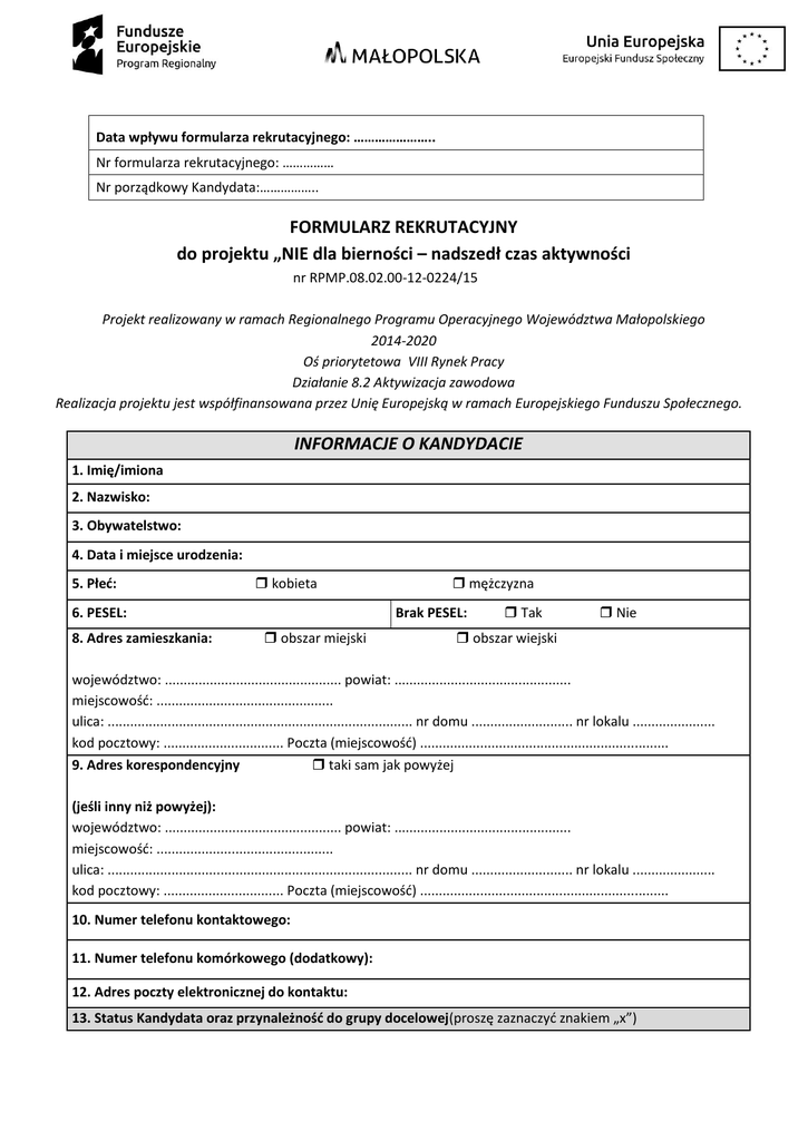 Data wpływu formularza rekrutacyjnego: ………………….. Nr formularza rekrutacyjnego: …………… Nr porządkowy Kandydata:…………….. FORMULARZ REKRUTACYJNY do projektu „NIE dla bierności – nadszedł czas aktywności nr RPMP.08.02.00-12-0224/15 Projekt realizowany w ramach Regionalnego Programu Operacyjnego Województwa Małopolskiego 2014-2020 Oś priorytetowa VIII Rynek Pracy Działanie 8.2 Aktywizacja zawodowa Realizacja projektu jest współfinansowana przez Unię Europejską w ramach Europejskiego Funduszu Społecznego. INFORMACJE O KANDYDACIE 1. Imię/imiona 2. Nazwisko: 3. Obywatelstwo: 4. Data i miejsce urodzenia: 5. Płeć: kobieta 6. PESEL: 8. Adres zamieszkania: mężczyzna Brak PESEL: obszar miejski Tak Nie obszar wiejski województwo: ............................................... powiat: ............................................... miejscowość: ............................................... ulica: ................................................................................. nr domu ........................... nr lokalu ...................... kod pocztowy: ................................ Poczta (miejscowość) .................................................................. 9. Adres korespondencyjny taki sam jak powyżej (jeśli inny niż powyżej): województwo: ............................................... powiat: ............................................... miejscowość: ............................................... ulica: ................................................................................. nr domu ........................... nr lokalu ...................... kod pocztowy: ................................ Poczta (miejscowość) .................................................................. 10. Numer telefonu kontaktowego: 11. Numer telefonu komórkowego (dodatkowy): 12. Adres poczty elektronicznej do kontaktu: 13. Status Kandydata oraz przynależność do grupy docelowej(proszę zaznaczyć znakiem „x”) osoba fizyczna w wieku 30 lat i więcej pozostająca bez pracy zamieszkująca jeden z powiatów: myślenicki, m.Tarnów,miechowski,proszowicki,wadowicki,oświęcimski,nowotarski,brzeski,gorlicki,tarnowskie,chrza nowskie, olkuskie, nowosądeckie, tatrzańskie, limanowskie i dąbrowski w woj. małopolskim. w tym: osoba bierna zawodowoi; osoba bezrobotnaii, w tym: długotrwale bezrobotnaiii osoba bezrobotna niezarejestrowana w ewidencjach urzędów pracy. osoba powyżej 50 roku życia osoba niepełnosprawna w stopniu lekkim, umiarkowanym, znacznym. osoba o niskich kwalifikacjach4 14. Wykształcenie (proszę zaznaczyć znakiem „x” ) Nazwa programu/szkoły Poziom ISCED 2011 Przedszkole/brak Poziom 0 Szkoła podstawowa Poziom 1 Gimnazjum Poziom 2 Liceum, Technikum, Zasadnicza szkoła zawodowa Poziom 3 Szkoły policealne Poziom 4 Studia krótkiego cyklu np. kolegium językowe, kolegium nauczycielskie Poziom 5 Studia licencjackie Poziom 6 Studia magisterskie, Studia uzupełniające magisterskie, Poziom 7 Studia doktoranckie Poziom 8 15. Posiadane doświadczenie zawodowe (proszę zaznaczyć znakiem „x” i uzupełnić) brak doświadczenia od 1 do 3 miesięcy od 3 miesięcy do 1 roku powyżej 1 roku Zawód wyuczony ………………………………………………………………………………………………… 16. OCZEKIWANIA ZWIĄZANE Z UDZIAŁEM W PROJEKCIE (proszę zaznaczyć znakiem „x” i /lub uzupełnić) Podniesienie zdolności do zatrudnienia tak nie Podjęcie pracy Nabycie lub zaktualizowanie posiadanych kwalifikacji Zwiększenie atrakcyjności na rynku pracy Zwiększenie wiary we własne siły, poczucia wartości, potencjału społecznego i eliminacja barier tak tak tak nie nie nie tak nie Inne, jakie?............................................................................................................................................................... 17. Źródła informacji o projekcie (zakreślić odpowiednie) Ulotka/plakat informacyjny Ogłoszenie prasowe Spotkanie informacyjne Strona internetowa projektu Znajomi Inne (jakie?) …………………………………………………………………………………. Oświadczenia: Oświadczam, że wszystkie dane zawarte w niniejszym Formularzu Rekrutacyjnym są zgodne z prawdą. Oświadczam, że zapoznałem(am) się z Regulaminem rekrutacji i Regulaminem uczestnictwa. Ja niżej podpisany(a) wyrażam zgodę na przetwarzanie moich danych osobowych dla celów związanych z procedurą rekrutacji oraz realizacją projektu „NIE dla bierności – nadszedł czas aktywności”, zgodnie z Ustawą z dnia 29.08.1997 r. o Ochronie Danych Osobowych (Dz. U. Nr 133 poz. 883). Wyrażam zgodę na prowadzenie wobec mojej osoby dalszego postępowania rekrutacyjnego, mającego na celu określenie moich predyspozycji do udziału w Projekcie. Zostałem(am) poinformowany(a), że Projekt jest finansowany ze środków Unii Europejskiej – Europejskiego Funduszu Społecznego. Mam świadomość, że szkolenie może odbywać się w miejscowości innej od mojego miejsca zamieszkania i wyrażam na to zgodę. Jestem świadomy(a), iż złożenie Formularza rekrutacyjnego nie jest równoznaczne z zakwalifikowaniem do udziału w projekcie. Zostałem(am) pouczony(a) o odpowiedzialności za składanie oświadczeń niezgodnych z prawdą lub zatajenie prawdy, niniejszym oświadczam, że ww. dane są prawdziwe. Jednocześnie oświadczam, iż jestem świadomy(a), że w razie złożenia przeze mnie oświadczenia niezgodnego z prawdą, skutkującego obowiązkiem zwrotu środków otrzymanych na sfinansowanie mojego udziału w projekcie, EURO-FUTURA Spółka z ograniczoną odpowiedzialnością będzie miała prawo dochodzić ode mnie roszczeń na drodze cywilnoprawnej. …………………………………………. Data i czytelny podpis Kandydata/tki do projektu Do formularza zgłoszeniowego przedkładam poniższe załączniki: 1. Oświadczenie Uczestnika 