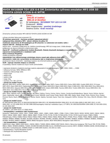 Informacje o produkcie Utworzono 07-03-2017 NVOX NV1086M TOY LEX 6-6 SM Zmieniarka cyfrowa emulator MP3 USB SD TOYOTA LEXUS SCION 6+6 WTYK Cena : 244,02 zł (netto) 300,14 zł (brutto) Nr katalogowy : NV1086M TOY LEX 6-6 SM Producent : NVOX Stan magazynowy : poniżej średniego Średnia ocena : brak recenzji Zmieniarka cyfrowa emulator MP3 USB SD TOYOTA LEXUS SCION 6+6 SM er m ar k cyfrowy emulator fabrycznej zmieniarki CD 36 miesięcy gwarancji - markowy produkt najwyższej jakości najlepszej klasy dekodery MP3 - jakość zbliżona do płyty CD możliwość utworzenia do 99 katalogów po 99 utworów ( w zależności od modelu radia ) wejście USB SD - obsługa do 32GB wejście AUX - możliwość podłączenia np. telefonu komórkowego, MP3 lub innego zewn. źródła dźwięku podłączany do złącza zmieniarki w fabrycznym radiu złącze BT - możliwość podłączenia modułu Bluetooth. Moduły bluetooth dostępne w naszej ofercie najszersza kompatybilność z modelami radii łatwa instalacja Plug&Play szybkie przewijanie utworów zapamiętuje czas odtwarzanego ostatniego utworu nawet gdy odtwarza duże pliki sterowanie z radia lub z przycisków na kierownicy (jak w oryginalnej zmieniarce) przykręcane złącze zmieniarki - zapobiega wypięciu się zmieniarki podczas jazdy po nierównościach SLIM - zajmuje niewiele miejsca w schowku w sprzedaży również modele do innych marek samochodów w at • poprawne działanie urządzenia wymaga nadania odpowiednich tytułów katalogom: CD01, CD02, CD03, ..., CD99. • odtwarza formaty: WMA, MPEG1/2, MP3 • zasilanie z fabrycznego radia • wejście AUX • wejście SD • wejście USB • waga: 85g • wymiary: 91 x 69 x 20 mm • pasuje do modeli Toyota: 4Runner 2003-2013, Avalon 2005-2013, Avensis 003-2011, Auris (after 2007), Camry 2005-2013, Celica 2003-2005, Corolla 2005-2013, FJ Cruiser 2007-2013, Hiace 2003-2013, Highlander 2004-2013, Land cruiser 2003-2013, Matrix 2005-2013, Mark X 2005-2011, MR2 2004-2010, Prius 2004-2013, RAV4 2003-2013, Sequoia 2005-2013, Sienna/Previa 2004-2010, Solara 2004-2008, Tacoma 2005-2013, Tundra 2004-2013, Venza 2009-2013, Vitz 2006-2010, Yaris 2006-2013, Picnic 2003-2010, Hilux 2003-2013 • pasuje do modeli Toyota 2003-2013: Alleх, Allion, Alphard, Auris, Avalon, Avensis, bB, Belta, Caldina, Camry, Carina, Celica, Celsior, Corolla Axio/Fielder/Runx, Spacio, Verso, Estima, Harrier, Hiace, Highlander, Ipsum, Isis, ist, Kluger, Land Cruiser 100/200, Land Cruiser Prado, MarkX, MRS, MR2, Nadia, Noah, Origin, Porte, Premio, Prius, Probox, Pronard, Ractis, Raum, RAV4, Rush, Sera, Sienta, Soarer, Sparky, Succeed, Suprа, Town Ace, Vanguard, Vellfire, Verossa, Vitz, Voxy, WiLLVS, Windom, Wish, Yaris • pasuje do modeli Lexus: ES 300/330/350 2004-2013, IS 200/220/250/300/350 2006-2013, GS 300/400/430/450H 2006-2013, GX 470 2004-2009,LS 460 2007-2013, LX 470 2004-2007, LX 570 2008-2013, RX 300 1998-2002(wymagany może być rozdzielacz typu y (YT-SBY)), RX 300/330/350/400H 2004-2009, SC 430 2005-2010, LS 430 2004-2007 • pasuje do modeli Scion: xA (2004+), xB (2004-2013), tC (2005-2010) • kompatybilny z modelami radii Toyota/Lexus: Panasonic i Matsushita: 11816, 11817, 11828, 16852, 12821, 13803, 13829, 16852, 17006, 17424, 17828, 50323, 50320, 50339, 51825, 53816, 53810, 53812, 53818, 53903, 56827, 58814, 58816, 58827, P1500, P1733, P1740, P1749, P1750(LX470), P1754, P3745 (Land Cruiser), P3803, P3809, P3914(Prado), P3916, P2868, P3918, P3919, P3920, P3921, P3926, P3930, P3946, P6502, P6827, P7508, P7514, P7809, P7820, P8604, Q58816, A56828, A56829, AP6829, AP6860, W13805, W13830, W53824, W53900, W53901, W53903, W53904, W53905, W58810, W58814, W58824, W58831, W58832, A51806, A51829, A56833, A56835, B9028, B9002 Navigation System, ND3T-W55(36052) Navigation radio (Mark X) • nie kompatybilne z modelami: 52867(Vios), Aygo, 58805 (2003 RAV4 ), 56018, 58813, T18303, B9010, B9004 (2007 RAV4), RAV4 z fabryczną nawigacją, TNS Travel 700, P1718, P3905, P6813, P6832, WH8403,W58816, T18303, W13807/W13081/W13086 (Auris), W53904(Panasonic,Avensis 2007), W58824, W58832,36458, AD1812(Delphi on 2010-2011 Tundra/Sequoia), AD6900 (Delphi on 2000-2004 Avalon), inne AD-xxx radia * Kompatybilne z Toyota Navigation System * Obsługuje IDS (wyświetlanie tekstu) W zestawie: Wygenerowano w programie www.oscGold.com w at er m ar k - zmieniarka cyfrowa - kabel podłączeniowy - instrukcja obsługi - kabel AUX - gwarancja 36 miesięcy - paragon lub Faktura VAT