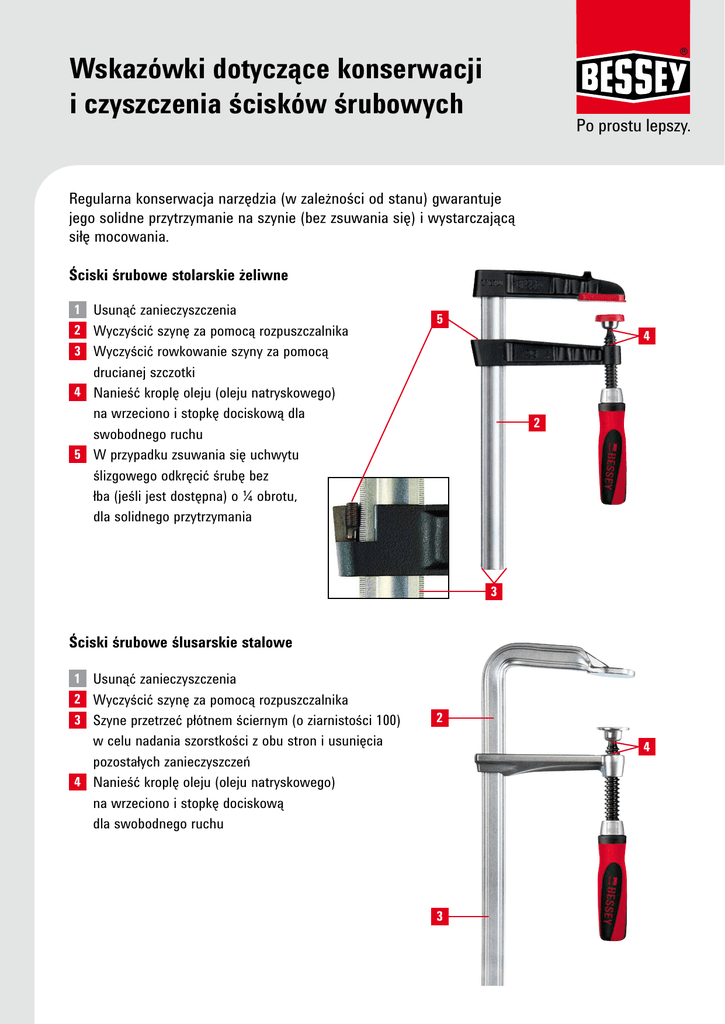 Wskazówki dotyczące konserwacji i czyszczenia ścisków śrubowych Po prostu lepszy. Regularna konserwacja narzędzia (w zależności od stanu) gwarantuje jego solidne przytrzymanie na szynie (bez zsuwania się) i wystarczającą siłę mocowania. Ściski śrubowe stolarskie żeliwne 1 Usunąć zanieczyszczenia 2 Wyczyścić szynę za pomocą rozpuszczalnika 5 4 3 Wyczyścić rowkowanie szyny za pomocą drucianej szczotki 4 Nanieść kroplę oleju (oleju natryskowego) na wrzeciono i stopkę dociskową dla swobodnego ruchu 5 W przypadku zsuwania się uchwytu ślizgowego odkręcić śrubę bez łba (jeśli jest dostępna) o ¼ obrotu, dla solidnego przytrzymania 2 3 Ściski śrubowe ślusarskie stalowe 1 Usunąć zanieczyszczenia 2 Wyczyścić szynę za pomocą rozpuszczalnika 3 Szyne przetrzeć płótnem ściernym (o ziarnistości 100) 2 w celu nadania szorstkości z obu stron i usunięcia pozostałych zanieczyszczeń 4 Nanieść kroplę oleju (oleju natryskowego) na wrzeciono i stopkę dociskową dla swobodnego ruchu 4 3