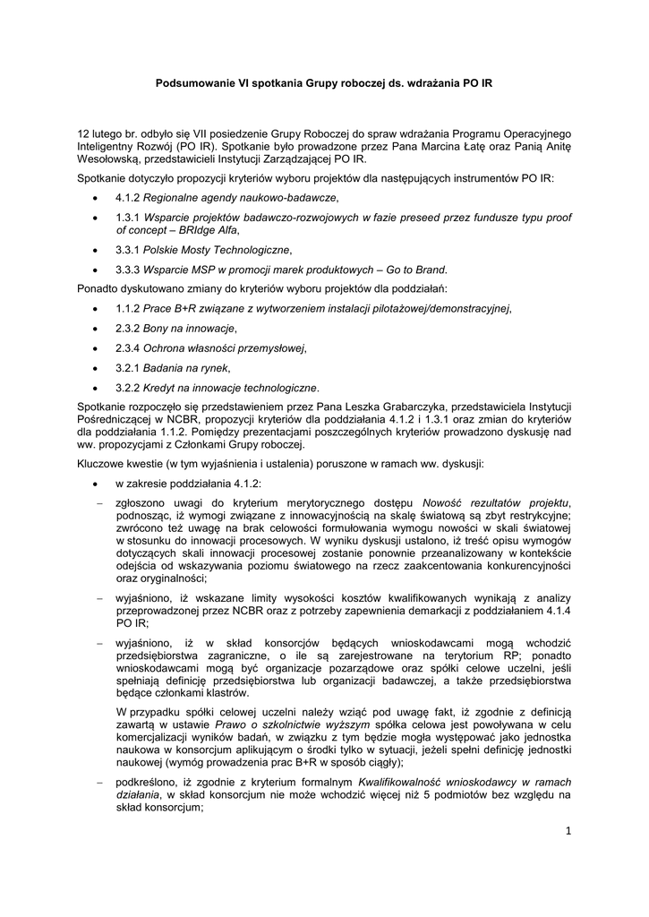 Podsumowanie VI spotkania Grupy roboczej ds. wdrażania PO IR 12 lutego br. odbyło się VII posiedzenie Grupy Roboczej do spraw wdrażania Programu Operacyjnego Inteligentny Rozwój (PO IR). Spotkanie było prowadzone przez Pana Marcina Łatę oraz Panią Anitę Wesołowską, przedstawicieli Instytucji Zarządzającej PO IR. Spotkanie dotyczyło propozycji kryteriów wyboru projektów dla następujących instrumentów PO IR: 4.1.2 Regionalne agendy naukowo-badawcze, 1.3.1 Wsparcie projektów badawczo-rozwojowych w fazie preseed przez fundusze typu proof of concept – BRIdge Alfa, 3.3.1 Polskie Mosty Technologiczne, 3.3.3 Wsparcie MSP w promocji marek produktowych – Go to Brand. Ponadto dyskutowano zmiany do kryteriów wyboru projektów dla poddziałań: 1.1.2 Prace B+R związane z wytworzeniem instalacji pilotażowej/demonstracyjnej, 2.3.2 Bony na innowacje, 2.3.4 Ochrona własności przemysłowej, 3.2.1 Badania na rynek, 3.2.2 Kredyt na innowacje technologiczne. Spotkanie rozpoczęło się przedstawieniem przez Pana Leszka Grabarczyka, przedstawiciela Instytucji Pośredniczącej w NCBR, propozycji kryteriów dla poddziałania 4.1.2 i 1.3.1 oraz zmian do kryteriów dla poddziałania 1.1.2. Pomiędzy prezentacjami poszczególnych kryteriów prowadzono dyskusję nad ww. propozycjami z Członkami Grupy roboczej. Kluczowe kwestie (w tym wyjaśnienia i ustalenia) poruszone w ramach ww. dyskusji: w zakresie poddziałania 4.1.2: zgłoszono uwagi do kryterium merytorycznego dostępu Nowość rezultatów projektu, podnosząc, iż wymogi związane z innowacyjnością na skalę światową są zbyt restrykcyjne; zwrócono też uwagę na brak celowości formułowania wymogu nowości w skali światowej w stosunku do innowacji procesowych. W wyniku dyskusji ustalono, iż treść opisu wymogów dotyczących skali innowacji procesowej zostanie ponownie przeanalizowany w kontekście odejścia od wskazywania poziomu światowego na rzecz zaakcentowania konkurencyjności oraz oryginalności; wyjaśniono, iż wskazane limity wysokości kosztów kwalifikowanych wynikają z analizy przeprowadzonej przez NCBR oraz z potrzeby zapewnienia demarkacji z poddziałaniem 4.1.4 PO IR; wyjaśniono, iż w skład konsorcjów będących wnioskodawcami mogą wchodzić przedsiębiorstwa zagraniczne, o ile są zarejestrowane na terytorium RP; ponadto wnioskodawcami mogą być organizacje pozarządowe oraz spółki celowe uczelni, jeśli spełniają definicję przedsiębiorstwa lub organizacji badawczej, a także przedsiębiorstwa będące członkami klastrów. W przypadku spółki celowej uczelni należy wziąć pod uwagę fakt, iż zgodnie z definicją zawartą w ustawie Prawo o szkolnictwie wyższym spółka celowa jest powoływana w celu komercjalizacji wyników badań, w związku z tym będzie mogła występować jako jednostka naukowa w konsorcjum aplikującym o środki tylko w sytuacji, jeżeli spełni definicję jednostki naukowej (wymóg prowadzenia prac B+R w sposób ciągły); podkreślono, iż zgodnie z kryterium formalnym Kwalifikowalność wnioskodawcy w ramach działania, w skład konsorcjum nie może wchodzić więcej niż 5 podmiotów bez względu na skład konsorcjum; 1 w odniesieniu do uwagi przedstawiciela KE odnośnie do zgodności projektów objętych wsparciem w ramach poddziałania 4.1.2 z KIS, wskazano na treść PO IR, zgodnie z którą RANBy muszą być zgodne z RIS – jednocześnie przedstawiciel KE zapowiedział dalsze wyjaśnienia dotyczące ww. kwestii z IZ PO IR; wyjaśniono, iż ograniczenie udziału kosztów kwalifikowanych przedsiębiorców w całkowitych kosztach kwalifikowanych projektu na poziomie minimum 50% wynika z analizy struktur kosztów w projektach realizowanych przez konsorcja, które były współfinansowane przez NCBR w poprzednich lat. Określenie udziału kosztów kwalifikowalnych przedsiębiorców w projekcie ma zapobiec sytuacji, w której udział firm w przedsięwzięciu jest niewielki, co utrudnia skuteczne wdrażanie wyników prac B+R. Ustalono, że na prośbę przedstawicieli RPO wysokość tego pułapu zostanie ponownie przeanalizowana; w zakresie poddziałania 1.3.1: na prośbę przedstawiciela KE wyjaśniono przyczyny zmiany formuły realizacji instrumentu z IF na instrument dotacyjny - wpływ na tę decyzję miały w szczególności rekomendacje wynikające z ewaluacji działania 1.5 PO IG (w ramach którego przeprowadzono pilotaż BRIdge Alfa) oraz przepisy dotyczące pomocy publicznej (treść art. 21 GBER dot. podziału pierwszej straty między inwestora publicznego i prywatnego); w związku z prośbą przedstawicielki Polskiego Stowarzyszenia Inwestorów Kapitałowych o interpretację pojęcia „first-loss” z art. 21 GBER przez DG Competition IZ PO IR zobowiązała się do oficjalnego zgłoszenia ww. kwestii; odniesiono się do szczegółowych pytań przedstawiciela Konfederacji Lewiatan, który poruszył kwestie dotyczące: o kwalifikowalności wnioskodawcy (mikro lub mały przedsiębiorca innowacyjny), o limitów kwotowych w odniesieniu do budżetu operacyjnego (brak maksymalnej wartości), o kosztów zarządzania (uwzględnione w budżecie operacyjnym), o możliwości uwzględnienia doświadczenia kluczowego personelu wnioskodawcy z okresu dłuższego niż 4 lata (wynika z obserwacji polskiego rynku B+R) o możliwości doprecyzowania sposobu oceny kryteriów punktowanych (decyzja o braku skwantyfikowanej oceny i oparcie się na wiedzy panelistów), wyjaśniono, iż budżet operacyjny projektu obejmuje koszty zarządzania; w zakresie poddziałania 1.1.2: poinformowano, iż przyjęte zmiany w sposobie realizacji instrumentu, polegające na ograniczeniu wsparcia do eksperymentalnych prac rozwojowych związanych z tworzeniem linii pilotażowej, skierowaniem konkursów wyłącznie do dużych przedsiębiorców oraz podniesieniem minimalnej wartości kosztów kwalifikowanych projektów do 30 mln PLN wynikają z konieczności osiągnięcia jednoznacznej koncent