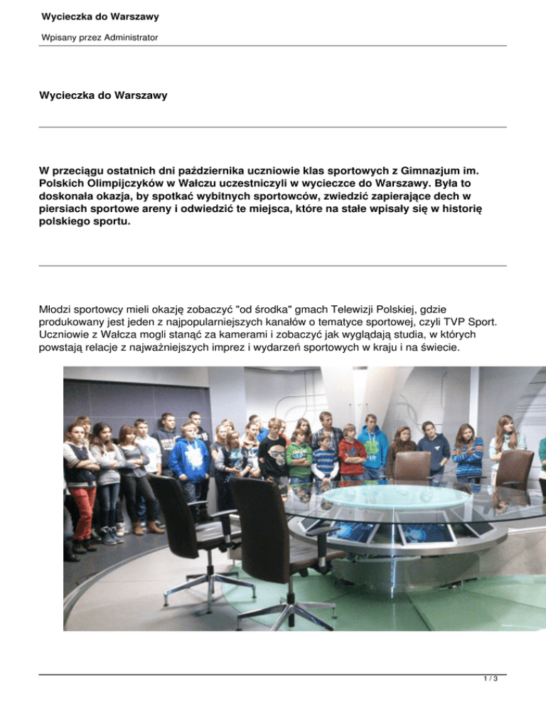 Wycieczka do Warszawy Wpisany przez Administrator Wycieczka do Warszawy W przeciągu ostatnich dni października uczniowie klas sportowych z Gimnazjum im. Polskich Olimpijczyków w Wałczu uczestniczyli w wycieczce do Warszawy. Była to doskonała okazja, by spotkać wybitnych sportowców, zwiedzić zapierające dech w piersiach sportowe areny i odwiedzić te miejsca, które na stałe wpisały się w historię polskiego sportu. Młodzi sportowcy mieli okazję zobaczyć "od środka" gmach Telewizji Polskiej, gdzie produkowany jest jeden z najpopularniejszych kanałów o tematyce sportowej, czyli TVP Sport. Uczniowie z Wałcza mogli stanąć za kamerami i zobaczyć jak wyglądają studia, w których powstają relacje z najważniejszych imprez i wydarzeń sportowych w kraju i na świecie. 1/3 Wycieczka do Warszawy Wpisany przez Administrator Autor zdjęcia: ZSM nr 1 Gimnazjum w Wałczu nr 1 Wałcz Od Galeria zdjęć: http://www.walczanin.pl/zdjecia/19-zdjecia/307-wycieczka-do-warszawy-galeria Poza tym wycieczkowicze zawitali na stadion i w muzeum Legii Warszawa. Podczas wizyty na Łazienkowskiej młodzi sportowcy mogli wejść do szatni zawodników, usiąść na ławce rezerwowych czy na słynnej ”Żylecie”. Mogli także obejrzeć trening pierwszej drużyny Legii. Kolejnym punktem wycieczki była wizyta w Narodowym Centrum Sportu i zwiedzanie Stadionu Narodowego, który zrobił na wszystkich niesamowite wrażenie. Wałecka młodzież spotkała się również z byłym reprezentantem Polski, zawodnikiem takich klubów jak Feyenoord Rotterdam, PSV Eindhoven czy Trabzonspor - Tomaszem Iwanem. Po wizytach na stadionach przyszedł czas na Torwar i spotkanie Piotrem Marszałkiem, który jest Dyrektorem Centralnych Ośrodków Sportu. Ostatnim punktem wyjazdu była wizyta w budynku Polskiego Komitetu Olimpijskiego, gdzie znajduje się Muzeum Sportu i Turystyki. Zgromadzone tam pamiątki, eksponaty i trofea 2/3 Wycieczka do Warszawy Wpisany przez Administrator opowiadają o sukcesach polskich sportowców, ale także o samym Ruchu Olimpijskim w Polsce i na świecie. 3/3