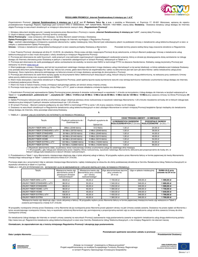 REGULAMIN PROMOCJI „Internet Światłowodowy 6 miesięcy po 1 zł II” 1. Organizatorem Promocji „Internet Światłowodowy 6 miesięcy po 1 zł II” jest IT Partners Telco Sp. z o.o. z siedzibą w Warszawie, ul. Żupnicza 17, 03-821 Warszawa, wpisaną do rejestru przedsiębiorców Krajowego Rejestru Sądowego pod numerem KRS nr 0000239000, NIP: 5262879935, REGON: 140219684, zwaną dalej: Dostawcą - Dostawca świadczy usługi dostępu do Internetu objęte Promocją na warunkach określonych w niniejszym dokumencie zwanym dalej: „Regulaminem Promocji”. 2. 1. Niniejszy dokument określa warunki i zasady korzystania przez Abonentów z Promocji o nazwie „Internet Światłowodowy 6 miesięcy po 1 zł II”, zwanej dalej Promocją. 2. Użyte w dalszej części Regulaminu Promocji terminy oznaczają: Okres Promocyjny – czas oznaczony (24 miesiące), na który Abonent zawarł Umowę z Dostawcą; Opłata Promocyjna kwota, jaką płaci Abonent za Usługę dostępu do Internetu wynikająca z Regulaminu Promocji; Ulga – wartość odpowiadająca zmniejszeniu wysokości abonamentu i opłaty instalacyjnej, który Abonent jest zobowiązany płacić na podstawie Umowy o świadczenie usług telekomunikacyjnych w sieci, w związku z zastosowaniem Opłaty Promocyjnej; Umowa – Umowa o świadczenie usług telekomunikacyjnych w sieci zawarta pomiędzy Dostawcą a Abonentem. Pozostałe terminy pisane wielką literą mają znaczenie określone w Regulaminie. 3. 1. Czas Trwania Promocji: obowiązuje od dnia 01.12.2015r. do odwołania. Okres czasu od daty rozpoczęcia Promocji do jej zakończenia, w którym Abonent podpisując Umowę o świadczenie usług telekomunikacyjnych w sieci może skorzystać z oferty określonej w niniejszym Regulaminie Promocji 2. Promocja jest skierowana do osób fizycznych, osób prawnych oraz jednostek organizacyjnych nieposiadających osobowości prawnej, którzy w okresie jej obowiązywania złożą zamówienie na Usługę dostępu do Internetu oferowaną przez Dostawcę w jednym z wariantów udostępnionych w ramach Promocji, wskazanych w Tabeli nr 1. 3. Promocja jest skierowana do osób posiadających adres zamieszkania lub siedziby na terenie sieci NAVU w technologii FTTH na obszarze Sandomierza. Dokładny zasięg terytorialny Promocji jest wskazany na stronie www.navu.pl. 4. Klient podpisując umowę z Dostawcą, jest lub był na przestrzeni ostatniego miesiąca abonentem innego dostawcy usług internetowych w tej samej lokalizacji, w której zakładana jest instalacja Dostawcy oraz posiada dokument potwierdzający ten fakt (np. faktura lub umowa, gdzie dane klienta lub współmałżonka i adres na dokumencie jest taki sam jak dane klienta i adres świadczenia usługi przez Dostawcę). Dane męża/żony abonenta widniejącego na fakturze/umowie od innego dostawcy uprawniają do skorzystania z Promocji. 5. Promocja jest skierowana do osób które wyrażą zgodę na otrzymywanie faktur elektronicznych dotyczących usług, których dotyczy Umowa, drogą elektroniczną, na wskazany przy zawieraniu Umowy adres poczty elektronicznej oraz za pośrednictwem EBOK. 6. Klient może skorzystać z warunków określonych w Regulaminie Promocji, jeżeli spełnia łącznie wyżej wymienione warunki oraz istnieją techniczne możliwości uruchomienia Usługi dostępu do Internetu w lokalizacji podanej przez Klienta. 7. Klient nie może w trakcie trwania umowy zmniejszyć wykupionego pakietu ani skrócić okresu trwania umowy. 8. Promocja może łączyć się tylko z Promocją „Unijny Fiber z eTV II”, jeżeli w okresie składania zmówienia będzie ona obowiązująca. 4. 1. Przedmiotem Promocji jest wprowadzenie Opłaty Promocyjnej przez pierwsze 6 okresów rozliczeniowych w wysokości 1 zł brutto za korzystanie z Usług dostępu do Internetu w taryfach wskazanych w Tabeli nr 1 o prędkościach „pobierania do” / „wysyłania do”: 2Mb/s / 512Kb/s lub 30 Mb/s / 2 Mb/s lub do 60 Mb/s / 5 Mb/s lub do 120 Mb/s / 10 Mb/s przy zawarciu Umowy na Okres Promocyjny 24 miesiące. 2. Opłata Promocyjna naliczana jest od dnia uruchomienia usługi i obejmuje pierwszy okres rozliczeniowy w wysokość należnego Abonamentu 1,00 zł brutto niezależnie od liczby dni w których Usługa była świadczona plus kolejnych 5 pełnych okresów rozliczeniowych po 1,00 zł brutto. 3. W ramach Promocji – Abonent zostanie podłączony do sieci NAVU w technologii FTTH w cenie 1,00 zł przy zawarciu Umowy na 24 miesiące. 4. Dostawca na warunkach określonych w Regulaminie świadczenia usług telekomunikacyjnych w sieci udostępni Abonentowi w ramach niniejszej Promocji bezpłatnie Sprzęt niezbędny do świadczenia Usługi dostępu do Internetu, który pozostaje własnością Dostawcy. 5. 1. TABELA 1. CENNIK USŁUG DOSTĘPU DO INTERNETU W RAMACH PROMOCJI: CZAS TRWANIA UMOWY – 24 MIESIĄCE Taryfa Prędkość pobierania do / Download do: UNIJNY FIBER MINI z eTV Prędkość wysyłania do / Upload do: 6 PIERWSZYCH OKRESÓW POZOSTAŁE OKRESY ROZLICZENIOWYCH (*) (brutto) ROZLICZENIOWE (brutto) (**) 2Mb/s (2048 kbit/s) 512 Kbit/s 1,00 zł UNIJNY FIBER STANDARD z eTV 30 Mb/s (30720 kbit/s) 2 Mb/s (2048 kbit/s) 1,00 zł 24,00 zł 39,00 zł UNIJNY FIBER STANDARD 30 Mb/s (30720 kbit/s) 2 Mb/s (2048 kbit/s) 1,00 zł 44,00 zł UNIJNY FIBER HOME z eTV 60 Mb/s (61440 kbit/s) 5 Mb/s (5210 kbit/s) 1,00 zł 49,00 zł UNIJNY FIBER HOME 60 Mb/s (61440 kbit/s) 5 Mb/s (5210 kbit/s) 1,00 zł 54,00 zł UNIJNY FIBER EXTRA z eTV 120 Mb/s (122880 kbit/s) 10 Mb/s (10240 kbit/s) 1,00 zł 84,00 zł UNIJNY FIBER EXTRA 120 Mb/s (122880 kbit/s) 10 Mb/s (10240 kbit/s) 1,00 zł 89,00 zł (*) Wysokość abonamentu stała, za pierwszy okres rozliczeniowy od dnia uruchomienia usługi do ostatniego dnia miesiąca. (**) W przypadku, gdy Usługa jest świadczona przez niepełny Okres rozliczeniowy, wysokość należnego Abonamentu obliczana jest proporcjonalnie do liczby dni, w których Usługa była świadczona w danym Okresie rozl