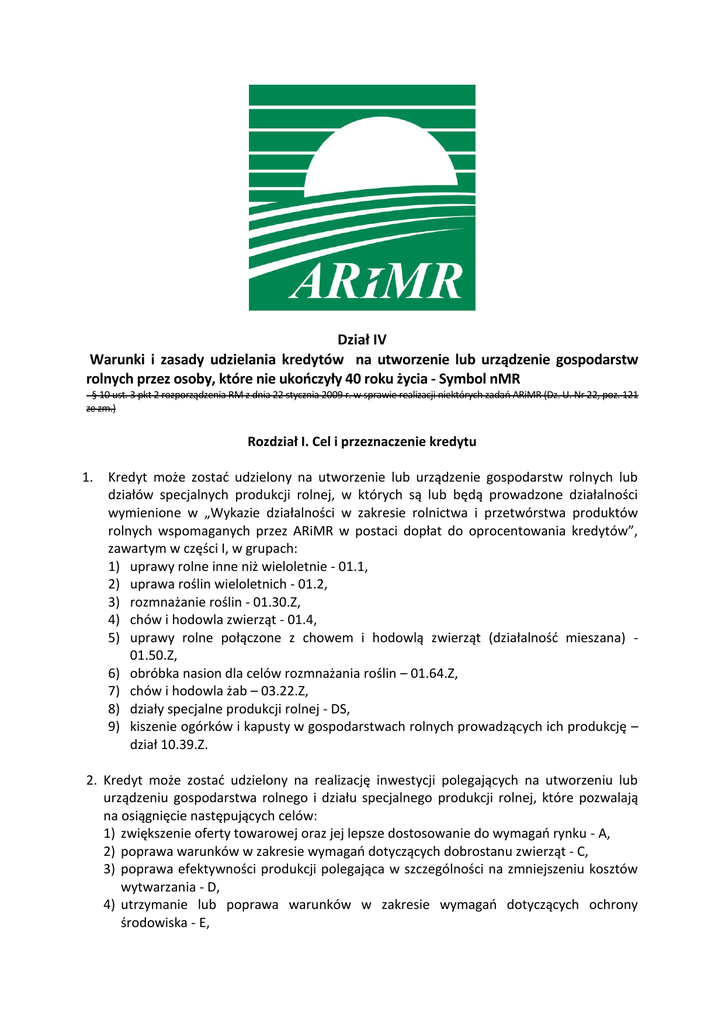 ączni1 do zarządzenia Nr.../2010 Prezesa ARiMR z dnia.......... Dział IV Warunki i zasady udzielania kredytów na utworzenie lub urządzenie gospodarstw rolnych przez osoby, które nie ukończyły 40 roku życia - Symbol nMR - § 10 ust. 3 pkt 2 rozporządzenia RM z dnia 22 stycznia 2009 r. w sprawie realizacji niektórych zadań ARiMR (Dz. U. Nr 22, poz. 121 ze zm.) Rozdział I. Cel i przeznaczenie kredytu 1. Kredyt może zostać udzielony na utworzenie lub urządzenie gospodarstw rolnych lub działów specjalnych produkcji rolnej, w których są lub będą prowadzone działalności wymienione w „Wykazie działalności w zakresie rolnictwa i przetwórstwa produktów rolnych wspomaganych przez ARiMR w postaci dopłat do oprocentowania kredytów”, zawartym w części I, w grupach: 1) uprawy rolne inne niż wieloletnie - 01.1, 2) uprawa roślin wieloletnich - 01.2, 3) rozmnażanie roślin - 01.30.Z, 4) chów i hodowla zwierząt - 01.4, 5) uprawy rolne połączone z chowem i hodowlą zwierząt (działalność mieszana) 01.50.Z, 6) obróbka nasion dla celów rozmnażania roślin – 01.64.Z, 7) chów i hodowla żab – 03.22.Z, 8) działy specjalne produkcji rolnej - DS, 9) kiszenie ogórków i kapusty w gospodarstwach rolnych prowadzących ich produkcję – dział 10.39.Z. 2. Kredyt może zostać udzielony na realizację inwestycji polegających na utworzeniu lub urządzeniu gospodarstwa rolnego i działu specjalnego produkcji rolnej, które pozwalają na osiągnięcie następujących celów: 1) zwiększenie oferty towarowej oraz jej lepsze dostosowanie do wymagań rynku - A, 2) poprawa warunków w zakresie wymagań dotyczących dobrostanu zwierząt - C, 3) poprawa efektywności produkcji polegająca w szczególności na zmniejszeniu kosztów wytwarzania - D, 4) utrzymanie lub poprawa warunków w zakresie wymagań dotyczących ochrony środowiska - E, 5) 6) 7) 8) poprawa jakości i promocja produktów rolnych - H, poprawa struktury agrarnej - K, poprawa warunków pracy oraz lepsze wykorzystanie zasobów pracy - O, tworzenie bazy surowcowej upraw roślin energetycznych – P. 3. Powierzchnia użytków rolnych tworzonego gospodarstwa rolnego nie może być mniejsza od ogłoszonej na podstawie przepisów o płatnościach w ramach systemów wsparcia bezpośredniego średniej powierzchni użytków rolnych w gospodarstwach rolnych w danym województwie. 4. Zakup użytków rolnych w celu urządzenia gospodarstwa rolnego mającego powierzchnię ogólną co najmniej 1 ha lub powierzchnię użytków rolnych nie mniejszą niż 1 ha przeliczeniowy, obliczoną według zasad stosowanych przy naliczaniu podatku rolnego, musi doprowadzić do powstania gospodarstwa rolnego o powierzchni nie mniejszej od ogłoszonej na podstawie przepisów o płatnościach w ramach systemów wsparcia bezpośredniego średniej powierzchni użytków rolnych w gospodarstwach rolnych w danym województwie. 5. Kredyt może zostać przeznaczony na sfinansowanie następujących inwestycji: 1) budowę, przebudowę, remont połączony z: a) modernizacją budynków lub budowli służących do produkcji rolnej, przechowywania, magazynowania, przygotowywania produktów rolnych do sprzedaży, w tym sprzedaży bezpośredniej, wraz ze zlokalizowanymi w tych budynkach pomieszczeniami higieniczno-sanitarnymi, b) zakupem, montażem instalacji technicznej, wyposażeniem, kosztami rozbiórki i unieszkodliwienia materiałów szkodliwych pochodzących z rozbiórki, jeżeli rozbiórka jest niezbędna w celu realizacji inwestycji, 2) zakup lub instalację maszyn, urządzeń lub wyposażenia służącego do prowadzenia produkcji rolnej, przechowywania, magazynowania, przygotowywania produktów rolnych do sprzedaży, w tym sprzedaży bezpośredniej, obejmujących w szczególności: sprzęt do uprawy, pielęgnacji, ochrony, nawożenia oraz zbioru roślin, ciągniki rolnicze, przyczepy rolnicze, maszyny lub urządzenia do przygotowywania, przechowywania, czyszczenia, sortowania, kalibrowania lub konfekcjonowania produktów rolnych, maszyny lub urządzenia do przygotowywania lub składowania pasz, maszyny lub urządzenia do pojenia zwierząt i zadawania pasz, urządzenia do pozyskiwania lub przechowywania mleka, 3) zakup użytków rolnych, 4) zakup budynków lub budowli służących do produkcji rolnej, przechowywania, magazynowania, przygotowywania produktów rolnych do sprzedaży, w tym sprzedaży bezpośredniej, wraz ze zlokalizowanymi w tych budynkach pomieszczeniami higieniczno-sanitarnymi, 5) zakładanie lub wyposażanie sadów lub plantacji wieloletnich, w tym plantacji roślin energetycznych, 6) wyposażanie pastwisk lub wybiegów dla zwierząt, w szczególności koszty grodzenia lub budowy wiat, 7) budowę ujęć wody, zakup i instalację urządzeń do uzdatniania, rozprowadzania lub magazynowania wody, lub do nawodnień ciśnieniowych, 8) zakup lub budowę budynków lub budowli lub zakup i instalację maszyn lub urządzeń służących ochronie środowiska lub poprawie warunków utrzymania zwierząt, w tym do składowania, oczyszczania lub separowania odchodów zwierzęcych lub odpadów, mycia lub czyszczenia sprzętu do produkcji rolnej, zakup pomieszczeń myjni dla zwierząt na potrzeby produkcji prowadzonej w gospodarstwie rolnym, budowę oczyszczalni i podczyszczalni ścieków przez gospodarstwa rolne i działy specjalne produkcji rolnej, 9) zakup i instalację lub budowę innych niż wymienione w pkt 7 i 8 elementów infrastruktury technicznej wpływających bezpośrednio na warunki prowadzenia działalności rolniczej, w tym urządzeń do pozyskiwania energii odnawialnej lub utwardzania placów manewrowych, wykonanie melioracji szczegółowych, zakup i budowa kotłowni ogrzewającej budynki lub budowle do produkcji roślinnej i zwierzęcej, zakup i montaż ogrodzenia gospodarstwa rolnego lub działu specjalnego produkcji rolnej, 10) zakup komputerów i oprogramowań służących ułatwieniu prowadzonej działalności rolniczej, w