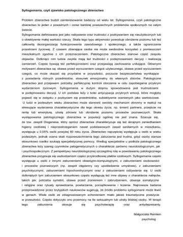 Syllogomania, czyli zjawisko patologicznego zbieractwa Problem zbieractwa budził zainteresowanie badaczy od wielu lat. Syllogomania, czyli patologiczne zbieractwo to jeden z poważnych i coraz bardziej powszechnych problemów społecznych na całym świecie. Syllogomania definiowana jest jako nabywanie oraz trudności z pozbywaniem się nieużytecznych lub o obiektywnie małej wartości rzeczy. Skala tego typu aktywności powoduje obniżenie poziomu lub też całkowitą dezorganizację funkcjonowania zawodowego i społecznego, a także ograniczanie przestrzeni życiowej. Z czasem zbierająca osoba nie może swobodnie korzystać z pomieszczeń mieszkalnych zgodnie z ich przeznaczeniem. Patologiczne zbieractwo stanowi część zespołu objawów. Dotknięci nim ludzie zwykle mają też trudności z podejmowaniem decyzji i realizacją zamierzeń. Często bywają też perfekcjonistami oraz przejawiają zachowania unikające. Głównymi motywami zbieractwa są: obawa przed wyrzuceniem czegoś użytecznego, obawa przed wyrzuceniem czegoś, co może okazać się przydatne w przyszłości, poczucie bezpieczeństwa wynikające z posiadania różnych przedmiotów, stosunek emocjonalny do własnych zbiorów. Patologiczne zbieractwo jest przejawem potrzeby perfekcyjnej kontroli otoczenia w celu zapobiegania przykrym wydarzeniom życiowym. Syllogomania w dużym stopniu spowodowana jest trudnościami w podejmowaniu decyzji. U ich podstaw leży z kolei antycypacja przykrych emocji, które mogłyby pojawić się w związku z pozbyciem się przedmiotów, subiektywnie ocenianych jako wartościowe. U ludzi w podeszłym wieku zbieractwo może stanowić swoisty mechanizm obronny w reakcji na stresujące wydarzenia charakterystyczne dla tego okresu życia, np. śmierć partnera, przejście na rentę lub emeryturę, utratę zdrowia lub obniżenie poziomu procesów poznawczych. Skala występowania patologicznego zbieractwa w populacji ogólnej nie jest znana. Szacuje się, że tzw. zespół Diogenesa, który oprócz zbieractwa charakteryzuje się też skrajnym zaniedbaniem higieny osobistej i nieprzestrzeganiem nawet podstawowych zasad sanitarnych w mieszkaniu, występuje u 0,05% osób powyżej 60 roku życia. Zbieractwo najczęściej występuje u osób w wieku podeszłym, jednak ocena skali rozpowszechnienia tego zaburzenia jest trudna, gdyż osoby starsze stosunkowo rzadko szukają specjalistycznej pomocy. Według specjalistów u podłoża patologicznego zbieractwa leży szereg czynników patogenetycznych o charakterze zarówno neurobiologicznym, jak i psychospołecznym. Z perspektywy neurobiologicznej szczególną rolę w powstawaniu patologicznego zbieractwa przypisuje się uszkodzeniom części przyśrodkowej płatów czołowych. Syllogomania często występuje u osób z innymi zaburzeniami obsesyjno-kompulsyjnymi, z zaburzeniami osobowości i procesów poznawczych (np. zespół otępienny czy upośledzenie umysłowe), z zaburzeniami psychotycznymi, zaburzeniami hipochondrycznymi oraz z zaburzeniami odżywiania się. U osób dotkniętych tym zaburzeniem stosunkowo często występują też inne objawy o charakterze natręctw, takich jak: potrzeba symetrii, obawa przed zranieniem i zabrudzeniem, obsesje somatyczne i religijne oraz rytuały sprawdzania, powtarzania, porządkowania i liczenia. Najnowsze badania przeprowadzone przez brytyjskich naukowców sugerują, że źródło problemu syllogomanii może tkwić w genach. Wiele osób ze zdiagnozowanym schorzeniem miało jakieś traumatyczne przeżycie w przeszłości. Często dotyczyło ono przemocy na tle seksualnym lub utraty bliskiej osoby. W terapii tego zaburzenia stosuje się psychoterapię oraz antydepresanty. Małgorzata Remlein psycholog