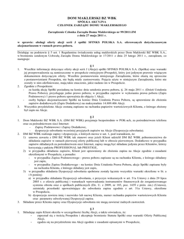 DOM MAKLERSKI BZ WBK SPÓŁKA AKCYJNA CZŁONEK ZARZĄDU DOMU MAKLERSKIEGO Zarządzenie Członka Zarządu Domu Maklerskiego nr 99/2011/JM z dnia 27 maja 2011 r. w sprawie: obsługi oferty akcji serii J spółki SFINKS POLSKA S.A. oferowanych dotychczasowym akcjonariuszom w ramach prawa poboru. Działając na podstawie § 5 ust. 1 Regulaminu świadczenia usług maklerskich przez Dom Maklerski BZ WBK S.A., w brzmieniu ustalonym Uchwałą Zarządu Domu Maklerskiego nr 17/2011 z dnia 25 lutego 2011 r., zarządzam, co następuje: 1. 2. 3. 1. 2. 3. 1. §1 Wszelkie informacje dotyczące oferty akcji serii J (Akcje) spółki SFINKS POLSKA S.A. (Spółka) oraz warunki jej przeprowadzenia są zamieszczone w prospekcie emisyjnym (Prospekt), który jest jedynym prawnie wiąŜącym dokumentem dotyczącym oferty. Wszelkie postanowienia niniejszego Zarządzenia, które okaŜą się sprzeczne z postanowieniami Prospektu, nie będą miały zastosowania. Pojęcia uŜyte w niniejszym Zarządzeniu, które nie zostały w nim zdefiniowane, mają takie znaczenie, jakie nadano im w Prospekcie. Zgodnie z Prospektem: - za kaŜdą akcję Spółki posiadaną na koniec dnia ustalenia prawa poboru, tj. 26 maja 2011 r. (Dzień Ustalenia Prawa Poboru), przysługuje jedno prawo poboru; w przypadku zapisów w wykonaniu prawa poboru (Zapis Podstawowy) 1 prawo poboru upowaŜnia do objęcia 1 Akcji, - osoby będące akcjonariuszami Spółki na koniec Dnia Ustalenia Prawa Poboru, są uprawnione do złoŜenia zapisów dodatkowych (Zapis Dodatkowy) na maksymalnie 14.889.406 Akcji. Wszystkie przydzielone Akcje zostaną zapisane na rachunku papierów wartościowych Klienta, z którego złoŜony był zapis na Akcje. §2 Dom Maklerski BZ WBK S.A. (DM BZ WBK) przyjmuje bezpośrednio w POK-ach, za pośrednictwem telefonu oraz za pośrednictwem sieci Internet: - Zapisy Podstawowe i Zapisy Dodatkowe, - dyspozycje odwołania wcześniej przyjętych zapisów na Akcje (Dyspozycja odwołania). DM BZ WBK realizuje zapisy i dyspozycje, o których mowa w ust. 1, pod warunkiem, Ŝe: 1) umowa zawarta z DM BZ WBK tak stanowi oraz jeŜeli Klient udzielił DM BZ WBK pełnomocnictwa do składania zapisów w ramach pierwszej oferty publicznej lub w obrocie pierwotnym. Dodatkowo w przypadku zapisów składanych za pośrednictwem sieci Internet, zapisy mogą być składane jedynie przez Klientów, którzy korzystają z pakietu PROFESSIONAL lub PRESTIGE, 2) w przypadku składania zapisów, Klient jest uprawniony do złoŜenia zapisu na Akcje zgodnie z zasadami określonymi w Prospekcie, a ponadto: - w przypadku Zapisu Podstawowego - prawa poboru zapisane są na rachunku Klienta, z którego składany jest zapis, - w przypadku Zapisu Dodatkowego - na koniec Dnia Ustalenia Prawa Poboru, akcje Spółki zapisane były na rachunku Klienta, z którego składany jest zapis, 3) w przypadku składania Dyspozycji odwołania spełnione zostały łącznie wszystkie warunki określone w lit. a i b poniŜej: a) w przypadku składania Dyspozycji odwołania, z przyczyn wskazanych w art. 51a Ustawy z dnia 29 lipca 2005 r. o ofercie publicznej i warunkach wprowadzania instrumentów finansowych do zorganizowanego systemu obrotu oraz o spółkach publicznych (Dz. U. z 2009, nr 185, poz. 1439 z późn. zm.) (Ustawa), zaistniały przesłanki upowaŜniające do odwołania zapisu zgodnie z art. 51a Ustawy, określone w Prospekcie, b) dyspozycja zawiera imię i nazwisko lub nazwę Klienta, numer rachunku papierów wartościowych Klienta oraz parametry odwoływanej Dyspozycji zapisu. Składane przez Klienta zapisy oraz Dyspozycje odwołania nie mogą zawierać Ŝadnych zastrzeŜeń. §3 Składając zapis Klient określa w szczególności liczbę Akcji, a takŜe oświadcza, Ŝe: zapoznał się z treścią Prospektu i akceptuje brzmienie Statutu Spółki oraz warunki Oferty Publicznej Akcji, zgadza się na przydzielenie mu Akcji zgodnie z zasadami opisanymi w Prospekcie, - 2. 3. 1. 2. 1. 2. 3. 4. 1. 2. wyraŜa zgodę na przetwarzanie danych osobowych w zakresie niezbędnym do przeprowadzenia Oferty Publicznej Akcji, przyjmuje do wiadomości, Ŝe przysługuje mu prawo wglądu do swoich danych osobowych i ich poprawiania oraz, Ŝe dane na formularzu zapisu zostały podane dobrowolnie, przyjmuje do wiadomości i potwierdza, Ŝe wyraŜa zgodę na przekazywanie objętych tajemnicą zawodową swoich danych osobowych oraz informacji związanych z dokonanym przez siebie zapisem na Akcje, przez podmiot przyjmujący zapis, Krajowemu Depozytowi Papierów Wartościowych S.A. (zwanemu dalej: „KDPW”), Oferującemu (Trigon Domowi Maklerskiemu S.A. z siedzibą w Krakowie, nr KRS: 0000033118) i Emitentowi (w tym osobom fizycznym działającym w imieniu KDPW, Emitenta lub Oferującego przy przeprowadzaniu Oferty Publicznej Akcji), w zakresie niezbędnym do przeprowadzenia emisji i Oferty Publicznej Akcji oraz, Ŝe upowaŜnia te podmioty do otrzymania tych informacji, - zapoznał się z treścią niniejszego Zarządzenia oraz wyraŜa zgodę na jego brzmienie. Składając Dyspozycję odwołania Klient potwierdza, Ŝe: - zapoznał się z treścią niniejszego Zarządzenia oraz zna warunki realizacji Dyspozycji odwołania określone w § 2 niniejszego Zarządzenia i wyraŜa zgodę na ich brzmienie, - przyjął do wiadomości, Ŝe w przypadku zrealizowania Dyspozycji odwołania, zapis, którego ta Dyspozycja dotyczy, zostanie odwołany, - przyjął do wiadomości, Ŝe złoŜenie Dyspozycji odwołania jest nieodwołalne. DM BZ WBK nie ponosi odpowiedzialności za przydzielenie mniejszej liczby Akcji niŜ określona w zapisie lub za nieprzydzielenie ich w ogóle, zgodnie z odpowiednimi zapisami Prospektu. §4 Środki na opłacenie zapisu DM BZ WBK pobiera z rachunku Klienta, z którego składany jest zapis, w chwili składania tego zapisu. Na opłacenie zapisu wykorzystane mogą być jedynie wolne środki finansowe. W systemie “Inwestor online” środki takie oznaczone są jako “Środki pod wypła