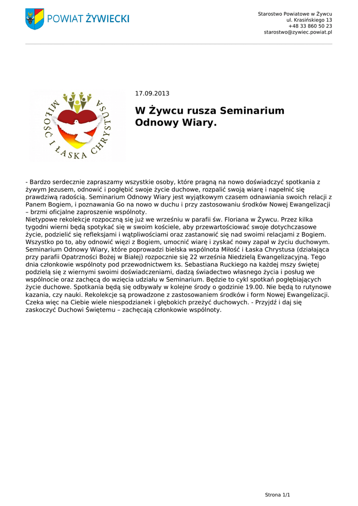 Starostwo Powiatowe w Żywcu ul. Krasińskiego 13 +48 33 860 50 23 [email protected] 17.09.2013 W Żywcu rusza Seminarium Odnowy Wiary. - Bardzo serdecznie zapraszamy wszystkie osoby, które pragną na nowo doświadczyć spotkania z żywym Jezusem, odnowić i pogłębić swoje życie duchowe, rozpalić swoją wiarę i napełnić się prawdziwą radością. Seminarium Odnowy Wiary jest wyjątkowym czasem odnawiania swoich relacji z Panem Bogiem, i poznawania Go na nowo w duchu i przy zastosowaniu środków Nowej Ewangelizacji – brzmi oficjalne zaproszenie wspólnoty. Nietypowe rekolekcje rozpoczną się już we wrześniu w parafii św. Floriana w Żywcu. Przez kilka tygodni wierni będą spotykać się w swoim kościele, aby przewartościować swoje dotychczasowe życie, podzielić się refleksjami i wątpliwościami oraz zastanowić się nad swoimi relacjami z Bogiem. Wszystko po to, aby odnowić więzi z Bogiem, umocnić wiarę i zyskać nowy zapał w życiu duchowym. Seminarium Odnowy Wiary, które poprowadzi bielska wspólnota Miłość i Łaska Chrystusa (działająca przy parafii Opatrzności Bożej w Białej) rozpocznie się 22 września Niedzielą Ewangelizacyjną. Tego dnia członkowie wspólnoty pod przewodnictwem ks. Sebastiana Ruckiego na każdej mszy świętej podzielą się z wiernymi swoimi doświadczeniami, dadzą świadectwo własnego życia i posług we wspólnocie oraz zachęcą do wzięcia udziału w Seminarium. Będzie to cykl spotkań pogłębiających życie duchowe. Spotkania będą się odbywały w kolejne środy o godzinie 19.00. Nie będą to rutynowe kazania, czy nauki. Rekolekcje są prowadzone z zastosowaniem środków i form Nowej Ewangelizacji. Czeka więc na Ciebie wiele niespodzianek i głębokich przeżyć duchowych. - Przyjdź i daj się zaskoczyć Duchowi Świętemu – zachęcają członkowie wspólnoty. Strona 1/1 Powered by TCPDF (www.tcpdf.org)