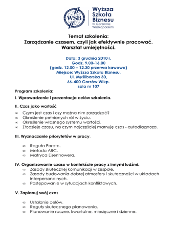 Temat szkolenia: Zarządzanie czasem, czyli jak efektywnie pracować. Warsztat umiejętności. Data: 3 grudnia 2010 r. Godz. 9.00-16.00 (godz. 12.00 – 12.30 przerwa kawowa) Miejsce: Wyższa Szkoła Biznesu, Ul. Myśliborska 30, 66-400 Gorzów Wlkp. sala nr 107 Program szkolenia: I. Wprowadzenie i prezentacja celów szkolenia. II. Czas jako wartość • • • • Czym jest czas i czy można nim zarządzać? Określenie pełnionych ról w życiu. Określenie własnego systemu wartości. Złodzieje czasu, na czym najczęściej marnuję czas - autodiagnoza. III. Wyznaczanie priorytetów w pracy. • • • Reguła Pareto. Metoda ABC. Matryca Eisenhowera. IV. Organizowanie czasu w kontekście pracy z innymi ludźmi. • Zasady skutecznej komunikacji w zespole. • Zasady budowania dobrej atmosfery i skuteczności w układach interpersonalnych. • Postępowanie w sytuacjach konfliktowych. V. Zaplanuj swój czas. • • • Ustalanie celów. Reguły skutecznego planowania. Planowanie roczne, kwartalne, miesięczne i dzienne. VI. Sposoby motywowania samego siebie • • • Technika automotywacji. Wizualizacja przyszłości. Zasada małych kroków w odniesieniu do nie lubianych zadań. Adresaci szkolenia: Szkolenie przeznaczone jest dla osób, które chcą podnieść jakość własnej pracy, a także funkcjonowania w życiu codziennym poprzez wdrożenie podstawowych zasad zarządzania czasem. Cele /korzyści z udziału w szkoleniu: Uzyskasz: - umiejętność określania ważnych celów i priorytetów, umiejętność planowania w codziennej pracy, umiejętność bezkonfliktowej organizacji relacji ze współpracownikami, umiejętność asertywnego radzenie sobie z "pożeraczami czasu". Metody: Szkolenie prowadzone jest metodami angażującymi wszystkich uczestników: wykłady, dyskusje, ćwiczenia indywidualne i zespołowe. Prowadzący: Małgorzata Kobryń: pedagog, specjalista psychoterapii uzależnień, pracownik Poradni Psychologiczno-Pedagogicznej; wieloletnie doświadczenie w pracy szkoleniowej i terapeutycznej. Cena: 400,00 brutto Zgłoszenia przyjmowane są do 26.11.2010 r. pod numerem tel. 95 733 66 68 lub na adres e-mail: [email protected]