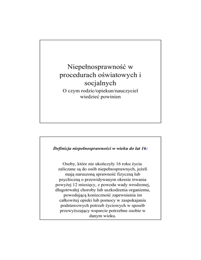 Niepełnosprawność w procedurach oświatowych i socjalnych O czym rodzic/opiekun/nauczyciel wiedzieć powinien Definicja niepełnosprawności w wieku do lat 16: Osoby, które nie ukończyły 16 roku Ŝycia zaliczane są do osób niepełnosprawnych, jeŜeli mają naruszoną sprawność fizyczną lub psychiczną o przewidywanym okresie trwania powyŜej 12 miesięcy, z powodu wady wrodzonej, długotrwałej choroby lub uszkodzenia organizmu, powodującą konieczność zapewnienia im całkowitej opieki lub pomocy w zaspokajaniu podstawowych potrzeb Ŝyciowych w sposób przewyŜszający wsparcie potrzebne osobie w danym wieku. Od 1.01.2002 r. orzekaniem o niepełnosprawności dzieci do lat 16 zajmują się Zespoły ds. Orzekania o Niepełnosprawności - wcześniej zaświadczenie potwierdzające niepełnosprawność wydawał lekarz ubezpieczenia zdrowotnego. Zespoły orzekają na podstawie opinii (dokumentacji medycznej) wydanej przez lekarza, pierwsze kroki naleŜy więc skierować do specjalisty opiekującego się dzieckiem. Wniosek o wydanie orzeczenia składa się w instytucji: POWIATOWY ZESPÓŁ DO SPRAW ORZEKANIA O NIEPEŁNOSPRAWNOŚCI Właściwy ze względu na miejsce zamieszkania Wnioskodawca bierze udział w posiedzeniu składu orzekającego. O jego terminie jest powiadamiany najpóźniej na 14 dni przed wyznaczoną datą posiedzenia. • Do wniosku załącza się zaświadczenie lekarskie zawierające opis stanu zdrowia, wydane przez lekarza, pod którego opieką lekarską znajduje się osoba zainteresowana, oraz inne posiadane dokumenty, w tym medyczne, umoŜliwiające ustalenie stopnia niepełnosprawności. • Zaświadczenie lekarskie powinno być wydane nie wcześniej niŜ na 30 dni przed dniem złoŜenia wniosku. • Wniosek jest rozpatrywany nie później niŜ w ciągu 2 miesięcy od dnia jego złoŜenia. W przypadkach bardziej skomplikowanych wniosek jest rozpatrywany nie później niŜ w ciągu 3 miesięcy od daty złoŜenia wniosku. Przy ocenie niepełnosprawności dziecka bierze się pod uwagę 1. 2. 3. przewidywany okres trwania upośledzenia stanu zdrowia niezdolność dziecka do zaspokajania podstawowych potrzeb Ŝyciowych, takich jak: samoobsługa, poruszanie się, komunikowanie z otoczeniem, które powodują konieczność zapewnienia mu stałej opieki lub pomocy, w sposób przewyŜszający zakres opieki nad zdrowym dzieckiem w danym wieku, znaczne zaburzenia funkcjonowania organizmu, wymagającego systematycznych i częstych zabiegów leczniczych i rehabilitacyjnych w domu i poza domem. Do stanów chorobowych, które uzasadniają konieczność stałej opieki lub pomocy dziecku, naleŜą: 1. 2. wady wrodzone i schorzenia o róŜnej etiologii prowadzące do niedowładów, poraŜenia kończyn lub zmian w narządzie ruchu, upośledzające w znacznym stopniu zdolność chwytną rąk lub utrudniające samodzielne poruszanie się, wrodzone lub nabyte cięŜkie choroby metaboliczne, układu krąŜenia, oddechowego, moczowego, pokarmowego, układu krzepnięcia i inne znacznie upośledzające sprawność organizmu, wymagające systematycznego leczenia w domu i okresowo leczenia szpitalnego, 3. upośledzenie umysłowe, począwszy od upośledzenia w stopniu umiarkowanym, 4. psychozy i zespoły psychotyczne, 5. zespół autystyczny, 6. padaczka z częstymi napadami lub wyraźnymi następstwami psychoneurologicznymi, 7. nowotwory złośliwe i choroby rozrostowe układu krwiotwórczego do 5 lat od zakończenia leczenia 8. 9. głuchoniemota, głuchota lub obustronne upośledzenie słuchu niepoprawiające się w wystarczającym stopniu po zastosowaniu aparatu słuchowego lub implantu ślimakowego. wrodzone lub nabyte wady narządu wzroku powodujące znaczne ograniczenie jego sprawności, prowadzące do obniŜenia ostrości wzroku w oku lepszym do 5/25 lub 0,2 według Snellena po wyrównaniu wady wzroku szkłami korekcyjnymi, lub ograniczenie pola widzenia do przestrzeni zawartej w granicach 30 stopni, Świadczenia socjalne dla osób niepełnosprawnych i ich rodzin JeŜeli wychowujesz dziecko niepełnosprawne (tj. z orzeczoną niepełnosprawnością), masz prawo do ubiegania się o świadczenia rodzinne (zasiłek pielęgnacyjny, zasiłek rodzinny wraz z dodatkami, świadczenie pielęgnacyjne). Świadczenia te mają na celu pokrycie, choćby częściowe, wydatków związanych z wychowywaniem dziecka niepełnosprawnego. • ZASIŁEK PIELĘGNACYJNY Zasiłek pielęgnacyjny (153 zł miesięcznie) przyznawany jest zarówno dzieciom, jak i dorosłym, niezaleŜnie od dochodów rodziny. Podstawą do jego przyznania jest m.in. złoŜenie wniosku oraz udokumentowanie niepełnosprawności danej osoby. • ZASIŁEK RODZINNY WRAZ Z DODATKAMI Zasiłek rodzinny wraz z dodatkami przyznawany jest na okres zasiłkowy trwający od września do końca sierpnia roku kolejnego. W przypadku, gdy w rodzinie jest dziecko legitymujące się orzeczeniem o niepełnosprawności (dla dzieci do 16 r.Ŝ. lub orzeczeniem o umiarkowanym albo znacznym stopniu niepełnosprawności (dla osób powyŜej16 r.Ŝ), zasiłek rodzinny przysługuje, jeŜeli dochód rodziny w przeliczeniu na osobę nie przekracza 583 zł. Zasiłek rodzinny przysługuje do ukończenia przez dziecko: 18 r.Ŝ. lub do końca nauki w szkole (nie dłuŜej niŜ do ukończenia 21 r.Ŝ.), do 24 r.Ŝ., jeŜeli kontynuuje naukę w szkole lub w szkole wyŜszej i posiada orzeczenie o umiarkowanym albo znacznym stopni niepełnosprawności. Od listopada 2009 r. wysokość zasiłku rodzinnego wypłacanego miesięcznie wynosi: 68 zł na dziecko do 5 r. Ŝ.; 91 zł na dziecko w wieku 6-18 lat i 98 zł na dziecko w wieku 19-24 lata. Do zasiłku rodzinnego przysługują dodatki z tytułu m.in.: -opieki nad dzieckiem w okresie korzystania z urlopu wychowawczego (400 zł miesięcznie; maksymalnie przez 72 miesiące by sprawować opiekę nad dzieckiem z orzeczoną niepełnosprawnością albo o znacznym stopniu niepełnosprawności), -kształcenia i rehabilitacji dziecka n