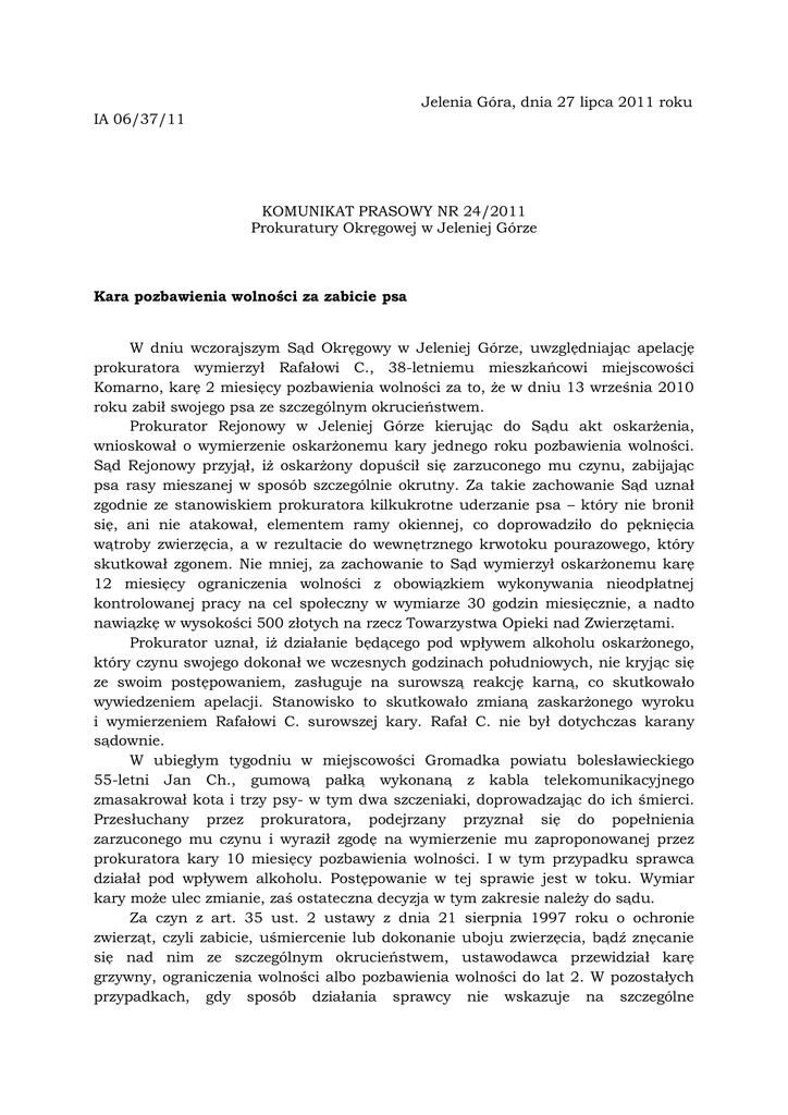 Jelenia Góra, dnia 27 lipca 2011 roku IA 06/37/11 KOMUNIKAT PRASOWY NR 24/2011 Prokuratury Okręgowej w Jeleniej Górze Kara pozbawienia wolności za zabicie psa W dniu wczorajszym Sąd Okręgowy w Jeleniej Górze, uwzględniając apelację prokuratora wymierzył Rafałowi C., 38-letniemu mieszkańcowi miejscowości Komarno, karę 2 miesięcy pozbawienia wolności za to, że w dniu 13 września 2010 roku zabił swojego psa ze szczególnym okrucieństwem. Prokurator Rejonowy w Jeleniej Górze kierując do Sądu akt oskarżenia, wnioskował o wymierzenie oskarżonemu kary jednego roku pozbawienia wolności. Sąd Rejonowy przyjął, iż oskarżony dopuścił się zarzuconego mu czynu, zabijając psa rasy mieszanej w sposób szczególnie okrutny. Za takie zachowanie Sąd uznał zgodnie ze stanowiskiem prokuratora kilkukrotne uderzanie psa – który nie bronił się, ani nie atakował, elementem ramy okiennej, co doprowadziło do pęknięcia wątroby zwierzęcia, a w rezultacie do wewnętrznego krwotoku pourazowego, który skutkował zgonem. Nie mniej, za zachowanie to Sąd wymierzył oskarżonemu karę 12 miesięcy ograniczenia wolności z obowiązkiem wykonywania nieodpłatnej kontrolowanej pracy na cel społeczny w wymiarze 30 godzin miesięcznie, a nadto nawiązkę w wysokości 500 złotych na rzecz Towarzystwa Opieki nad Zwierzętami. Prokurator uznał, iż działanie będącego pod wpływem alkoholu oskarżonego, który czynu swojego dokonał we wczesnych godzinach południowych, nie kryjąc się ze swoim postępowaniem, zasługuje na surowszą reakcję karną, co skutkowało wywiedzeniem apelacji. Stanowisko to skutkowało zmianą zaskarżonego wyroku i wymierzeniem Rafałowi C. surowszej kary. Rafał C. nie był dotychczas karany sądownie. W ubiegłym tygodniu w miejscowości Gromadka powiatu bolesławieckiego 55-letni Jan Ch., gumową pałką wykonaną z kabla telekomunikacyjnego zmasakrował kota i trzy psy- w tym dwa szczeniaki, doprowadzając do ich śmierci. Przesłuchany przez prokuratora, podejrzany przyznał się do popełnienia zarzuconego mu czynu i wyraził zgodę na wymierzenie mu zaproponowanej przez prokuratora kary 10 miesięcy pozbawienia wolności. I w tym przypadku sprawca działał pod wpływem alkoholu. Postępowanie w tej sprawie jest w toku. Wymiar kary może ulec zmianie, zaś ostateczna decyzja w tym zakresie należy do sądu. Za czyn z art. 35 ust. 2 ustawy z dnia 21 sierpnia 1997 roku o ochronie zwierząt, czyli zabicie, uśmiercenie lub dokonanie uboju zwierzęcia, bądź znęcanie się nad nim ze szczególnym okrucieństwem, ustawodawca przewidział karę grzywny, ograniczenia wolności albo pozbawienia wolności do lat 2. W pozostałych przypadkach, gdy sposób działania sprawcy nie wskazuje na szczególne okrucieństwo, zgodnie z treścią przepisu art. 35 ust. 1, za wymienione zachowania sąd może wymierzyć karę grzywny, ograniczenia wolności, albo pozbawienia wolności do jednego roku. W obu sytuacjach sąd może wymierzyć nawiązkę w wysokości od 25 złotych do 2500 złotych na cel związany z ochroną zwierząt. Ściganie tych czynów odbywa się z urzędu. Przypomnieć należy, iż zgodnie z treścią art. 6 ust.1. wskazanej ustawy, nieuzasadnione lub niehumanitarne zabijanie zwierząt oraz znęcanie się nad nimi jest zabronione. Przez znęcanie się nad zwierzętami w ujęciu ustawy należy rozumieć zadawanie albo świadome dopuszczanie do zadawania bólu lub cierpień, a w szczególności: umyślne zranienie lub okaleczenie zwierzęcia, nie stanowiące dozwolonego prawem zabiegu lub doświadczenia na zwierzęciu, znakowanie zwierząt stałocieplnych przez wypalanie lub wymrażanie, umyślne używanie do pracy lub w celach sportowych albo rozrywkowych zwierząt chorych, w tym rannych lub kulawych, albo zmuszanie ich do czynności mogących spowodować ból, bicie zwierząt przedmiotami twardymi i ostrymi lub zaopatrzonymi w urządzenia obliczone na sprawianie specjalnego bólu, bicie po głowie, dolnej części brzucha, dolnych częściach kończyn, przeciążanie zwierząt pociągowych i jucznych ładunkami w oczywisty sposób nie odpowiadający ich sile i kondycji lub stanowi dróg lub zmuszanie takich zwierząt do zbyt szybkiego biegu, transport zwierząt, w tym zwierząt hodowlanych, rzeźnych i przewożonych na targowiska, przenoszenie lub przepędzanie zwierząt w sposób powodujący ich zbędne cierpienie i stres, używanie uprzęży, pęt, stelaży, więzów lub innych urządzeń zmuszających zwierzę do przebywania w nienaturalnej pozycji, powodujących zbędny ból, uszkodzenia ciała albo śmierć, dokonywanie na zwierzętach zabiegów i operacji chirurgicznych przez osoby nie posiadające wymaganych uprawnień bądź niezgodnie z zasadami sztuki lekarsko-weterynaryjnej, bez zachowania koniecznej ostrożności i oględności oraz w sposób sprawiający ból, któremu można było zapobiec, złośliwe straszenie lub drażnienie zwierząt, utrzymywanie zwierząt w niewłaściwych warunkach bytowania, w tym utrzymywanie ich w stanie rażącego niechlujstwa oraz w pomieszczeniach albo klatkach uniemożliwiających im zachowanie naturalnej pozycji, porzucanie zwierzęcia, a w szczególności psa lub kota, przez właściciela bądź przez inną osobę, pod której opieką zwierzę pozostaje, stosowanie okrutnych metod w chowie lub hodowli zwierząt, trzymanie zwierząt na uwięzi, która powoduje u nich uszkodzenie ciała lub cierpienie oraz nie zapewnia możliwości niezbędnego ruchu, organizowanie walk zwierząt. Zwrot „ w szczególności” oznacza, że nie jest to zamknięty katalog zachowań, które mogą być uznane jako czynności, za które ustawodawca przewidział karę. Zasadą przy ocenie zachowań podejmowanych względem zwierząt powinno być dążenie do ustalenia, czy były one humanitarne. Zastępca Prokuratora Okręgowego Marcin Zarówny 2