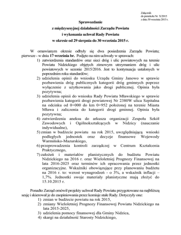 Sprawozdanie Załącznik do protokołu Nr X/2015 z dnia 30 września 2015 r. z międzysesyjnej działalności Zarządu Powiatu i wykonania uchwał Rady Powiatu w okresie od 29 sierpnia do 30 września 2015 r. W omawianym okresie odbyły się dwa posiedzenia Zarządu Powiatu; pierwsze - w dniu 17 września br. Podjęto na nim uchwały w sprawach: 1) zatwierdzenia standardów oraz sieci dróg i ulic powiatowych na terenie Powiatu Nidzickiego objętych zimowym utrzymaniem dróg i ulic powiatowych w sezonie 2015/2016. Jest to kontynuacja ustalonych w poprzednim roku standardów; 2) udzielenia opinii do wniosku Urzędu Gminy Janowo w sprawie pozbawienia dróg publicznych kategorii dróg gminnych poprzez wyłączenie z użytkowania jako drogi publicznej. Opinia była pozytywna; 3) udzielenia opinii do wniosku Rady Powiatu Mławskiego w sprawie pozbawienia kategorii drogi powiatowej Nr 2380W ulica Szpitalna na odcinku od 0+000 do km 0+952 położonej na terenie Miasta Mława i zaliczenia do kategorii drogi gminnej. Opinia była pozytywna; 4) zatwierdzenia aneksu do arkusza organizacji Zespołu Szkół Zawodowych i Ogólnokształcących w Nidzicy (nauczanie indywidualne), 5) zmian w budżecie powiatu na rok 2015, uwzględniającą wnioski podległych jednostek oraz decyzje finansowe Wojewody Warmińsko-Mazurskiego, 6) przeprowadzenia kontroli zarządczej w Centrum Kształcenia Praktycznego, 7) założeń i materiałów planistycznych do budżetu Powiatu Nidzickiego na 2016 r. oraz Wieloletniej Prognozy Finansowej na lata 2016-2025 oraz terminów ich opracowania przez jednostki organizacyjne. Wskaźniki obowiązujące przy planowaniu budżetu na 2016 r. to: wzrost wynagrodzeń - o 3%, a wskaźnik inflacji – 1,7%. Jednostki swoje materiały planistyczne mają złożyć do 15.10.2015 r. Ponadto Zarząd omówił projekty uchwał Rady Powiatu przygotowane na najbliższą sesję i skierował je do zaopiniowania przez komisje stałe Rady. Dotyczyły one: 1) zmian w budżecie powiatu na rok 2015, 2) zmiany Wieloletniej Prognozy Finansowej Powiatu Nidzickiego na lata 2015-2025, 3) udzielenia pomocy finansowej dla Gminy Nidzica, 4) skargi na działalność Starosty Nidzickiego, 5) powierzenia Gminie Nidzica zorganizowania dla uczniów nauki religii w pozaszkolnym punkcie katechetycznym przy Zborze Kościoła Chrześcijan Baptystów „Antiocha” w Nidzicy. W dalszej części obrad Zarząd zapoznał się z wnioskiem Przedsiębiorstwa Usług Gospodarki Komunalnej Sp. z o.o. w Nidzicy w sprawie uzgodnienia przebiegu przyłącza cieplnego na działkach o numerach ewidencyjnych 63/3 i 63/4, stanowiących własność Powiatu Nidzickiego, oddanych w trwały zarząd Zespołowi Szkół Ogólnokształcących w Nidzicy, oraz wyrażenia zgody w zakresie prawa do dysponowania nieruchomością na cele budowlane. Wyrażenie zgody na usytuowanie sieci następuje poprzez ustanowienie za wynagrodzeniem służebności przesyłu. Każda zaś dyspozycja nieruchomościami powiatu, w stosunku do nieruchomości, której wartość przekracza 50.000 zł, odbywa się po uzyskaniu przez Zarząd Powiatu pozytywnej opinii Komisji Rozwoju Gospodarczego, Budżetu i Finansów, Rolnictwa i Ochrony Środowiska. Opinia Komisji była pozytywna. Kolejnym tematem obrad było zaktualizowanie opłaty rocznej z tytułu trwałego zarządu nieruchomościami, stanowiącymi własność Powiatu Nidzickiego, dla Powiatowego Urzędu Pracy oraz Powiatowego Zarządu Dróg w Nidzicy. Zarząd Powiatu jest zobowiązany, aby takie opłaty pobierać i aktualizować, zgodnie z zasadami określonymi w ustawie o gospodarowaniu nieruchomościami. Opłata roczna dla PUP od tego roku wynosić będzie 777 zł, natomiast dla PZD - 3215 zł. Zarząd przyjął także informację o wynikach negocjacji wysokości odszkodowania za nieruchomość gruntową położoną w obrębie Piątki, która została wydzielona na poszerzenie istniejącej drogi powiatowej i z mocy prawa przeszła na własność Powiatu Nidzickiego. Wysokość stawki odszkodowania ustalono na 19 zł/m2, co za nieruchomość o pow. 0,0145 ha stanowi kwotę 2.755 zł. Następnie Zarząd zapoznał się z: 1) informacją Dyrektora Zespołu Szkół Rolniczych i Ogólnokształcących w Jagarzewie o zamiarze zawarcia w dniu 25 sierpnia 2015r. umowy na wynajęcie stołówki wraz z zapleczem kuchennym dla 45 osób. Dochód z najmu wyniósł 1.400,00 zł; 2) informacją Dyrektora Zespołu Szkół Rolniczych i Ogólnokształcących w Jagarzewie o zamiarze zawarcia umowy w dniu 22 września 2015 r. na wynajem stołówki wraz z zapleczem kuchennym w dniu 27 września br. oraz wynajem pokoi w Internacie dla około 30 osób w dniu 26 września br. Przewidywany łączny dochód z wynajmu to 1.650 zł; 3) Decyzją Burmistrza Nidzicy o zmianie ostatecznej decyzji nr 4/2015 z dnia 2 lipca 2015 r. o środowiskowych uwarunkowaniach dla inwestycji polegającej na przebudowie dróg powiatowych nr 1264 N Leszcz- Jankowice – Rączki – Moczysko; nr 1975 N droga nr 1264 N- droga krajowa nr 7; nr 1585 N Mielno – Rączki (dr. Nr 1264 N) w msc. Rączki. Zmiana polega na tym, że w ramach planowanej inwestycji przewiduje się wykonanie odprowadzenia wód opadowych z nawierzchni drogi na odcinku 2 ok. 500 m w terenie zabudowanym miejscowości Rączki – poprzez szczelną kanalizację deszczową do rzeki Nidy, zaś z pozostałego obszaru inwestycji – poprzez istniejące obustronne rowy do gruntu. Przed wylotem kanału deszczowego zamontowany zostanie osadnik zatrzymujący zawiesinę i piasek, a następnie separator substancji ropopochodnych; 4) Zawiadomieniem o wszczęciu postępowania administracyjnego w sprawie wydania decyzji o zezwoleniu na realizację inwestycji drogowej polegającej na budowie z przebudową ulic Kraszewskiego (droga wewnętrzna, która stanie się drogą publiczną) i 3 Maja (droga publiczna gminna nr 190502 N) w Nidzicy, wraz z odwodnieniem i oświetleniem ulicznym. Inwestorem jest Gmina Nidzica. Powia