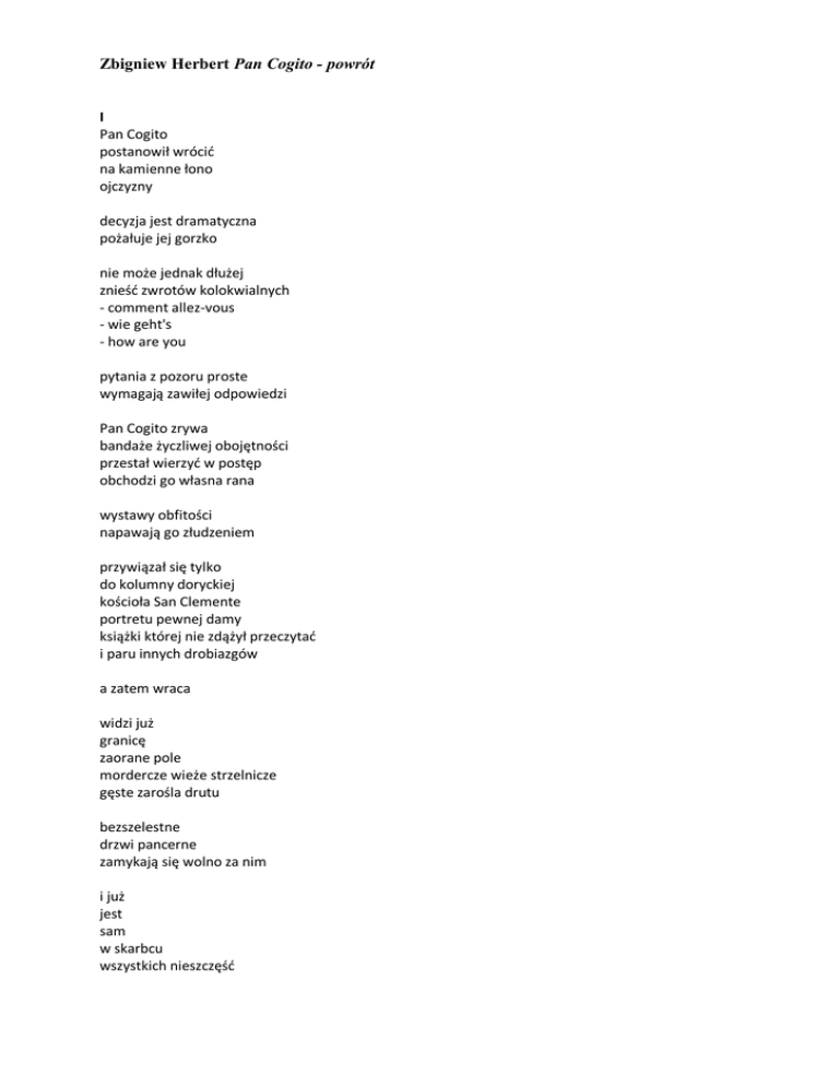 Zbigniew Herbert Pan Cogito - powrót I Pan Cogito postanowił wrócić na kamienne łono ojczyzny decyzja jest dramatyczna pożałuje jej gorzko nie może jednak dłużej znieść zwrotów kolokwialnych - comment allez-vous - wie geht's - how are you pytania z pozoru proste wymagają zawiłej odpowiedzi Pan Cogito zrywa bandaże życzliwej obojętności przestał wierzyć w postęp obchodzi go własna rana wystawy obfitości napawają go złudzeniem przywiązał się tylko do kolumny doryckiej kościoła San Clemente portretu pewnej damy książki której nie zdążył przeczytać i paru innych drobiazgów a zatem wraca widzi już granicę zaorane pole mordercze wieże strzelnicze gęste zarośla drutu bezszelestne drzwi pancerne zamykają się wolno za nim i już jest sam w skarbcu wszystkich nieszczęść II więc po co wraca pytają przyjaciele z lepszego świata mógłby tutaj pozostać jakoś się urządzić ranę powierzyć chemicznym wywabiaczom zostawić w poczekalni wielkich portów lotniczych więc po co wraca do wody dzieciństwa - do splątanych korzeni - do uścisku pamięci - do ręki twarzy spalonych na rusztach czasu pytania z pozoru proste wymagają zawiłej odpowiedzi może Pan Cogito wraca żeby dać odpowiedź na podszepty strachu na szczęście niemożliwe na uderzenie znienacka na podstępne pytanie