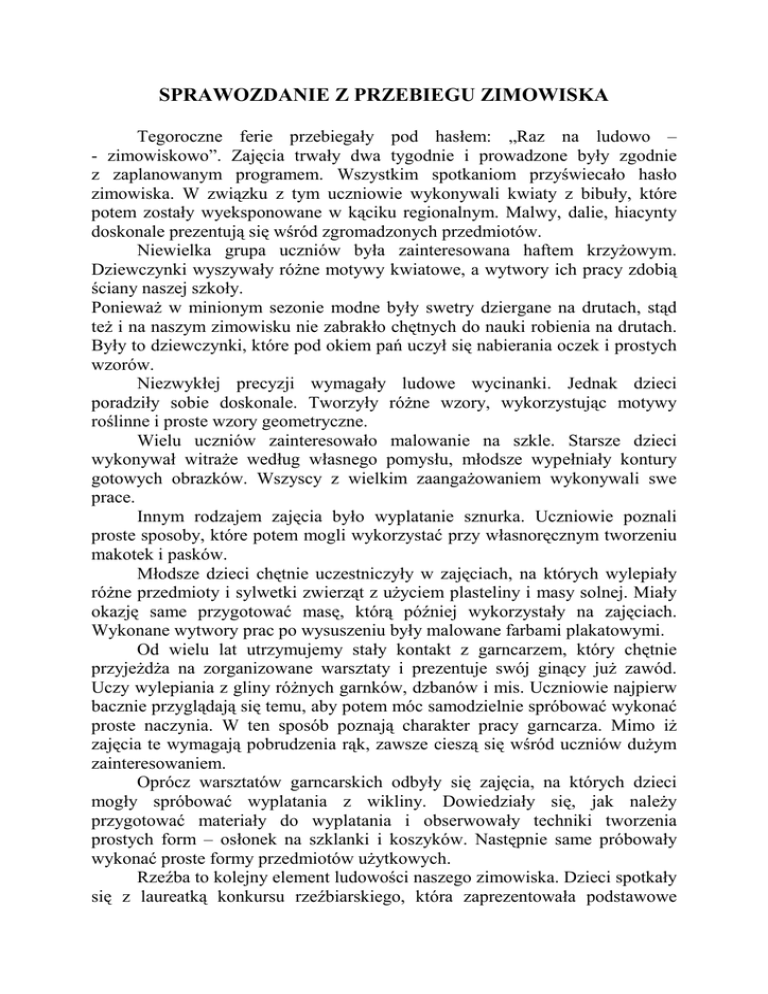 SPRAWOZDANIE Z PRZEBIEGU ZIMOWISKA Tegoroczne ferie przebiegały pod hasłem: „Raz na ludowo – - zimowiskowo”. Zajęcia trwały dwa tygodnie i prowadzone były zgodnie z zaplanowanym programem. Wszystkim spotkaniom przyświecało hasło zimowiska. W związku z tym uczniowie wykonywali kwiaty z bibuły, które potem zostały wyeksponowane w kąciku regionalnym. Malwy, dalie, hiacynty doskonale prezentują się wśród zgromadzonych przedmiotów. Niewielka grupa uczniów była zainteresowana haftem krzyżowym. Dziewczynki wyszywały różne motywy kwiatowe, a wytwory ich pracy zdobią ściany naszej szkoły. Ponieważ w minionym sezonie modne były swetry dziergane na drutach, stąd też i na naszym zimowisku nie zabrakło chętnych do nauki robienia na drutach. Były to dziewczynki, które pod okiem pań uczył się nabierania oczek i prostych wzorów. Niezwykłej precyzji wymagały ludowe wycinanki. Jednak dzieci poradziły sobie doskonale. Tworzyły różne wzory, wykorzystując motywy roślinne i proste wzory geometryczne. Wielu uczniów zainteresowało malowanie na szkle. Starsze dzieci wykonywał witraże według własnego pomysłu, młodsze wypełniały kontury gotowych obrazków. Wszyscy z wielkim zaangażowaniem wykonywali swe prace. Innym rodzajem zajęcia było wyplatanie sznurka. Uczniowie poznali proste sposoby, które potem mogli wykorzystać przy własnoręcznym tworzeniu makotek i pasków. Młodsze dzieci chętnie uczestniczyły w zajęciach, na których wylepiały różne przedmioty i sylwetki zwierząt z użyciem plasteliny i masy solnej. Miały okazję same przygotować masę, którą później wykorzystały na zajęciach. Wykonane wytwory prac po wysuszeniu były malowane farbami plakatowymi. Od wielu lat utrzymujemy stały kontakt z garncarzem, który chętnie przyjeżdża na zorganizowane warsztaty i prezentuje swój ginący już zawód. Uczy wylepiania z gliny różnych garnków, dzbanów i mis. Uczniowie najpierw bacznie przyglądają się temu, aby potem móc samodzielnie spróbować wykonać proste naczynia. W ten sposób poznają charakter pracy garncarza. Mimo iż zajęcia te wymagają pobrudzenia rąk, zawsze cieszą się wśród uczniów dużym zainteresowaniem. Oprócz warsztatów garncarskich odbyły się zajęcia, na których dzieci mogły spróbować wyplatania z wikliny. Dowiedziały się, jak należy przygotować materiały do wyplatania i obserwowały techniki tworzenia prostych form – osłonek na szklanki i koszyków. Następnie same próbowały wykonać proste formy przedmiotów użytkowych. Rzeźba to kolejny element ludowości naszego zimowiska. Dzieci spotkały się z laureatką konkursu rzeźbiarskiego, która zaprezentowała podstawowe narzędzia niezbędne w rzeźbiarstwie, a także opowiedziała o rodzajach drewna, w których najlepiej rzeźbić. Uczestnicy warsztatów podjęli próbę wykonania prostych rzeźb. W ten sposób przekonali się, że praca ta wymaga niebywałej precyzji i wielu cierpliwości ze strony artysty Nie obyło się również bez przygotowania potraw regionalnych. Grupa uczniów pod kierunkiem pani Alicji Celińskiej przygotowała ciasto, z którego potem piekła wspaniałe pączki, faworki i róże karnawałowe. Wszystkim smakowały własnoręczne wypieki, które dodawały siły w czasie dyskoteki. Dzieci miały też okazję poznać piosenki ludowe, które czasami miały okazję słyszeć na różnych uroczystościach rodzinnych. Od tej pory będą mogli włączać się w śpiew, kiedy nadarzy się ku temu okazja. Praca dziennikarza zawsze budzi wiele emocji, dlatego nie zabrakło chętnych do wzięcia udziału w warsztatach dziennikarskich. Dzieci poznały specyfikę tego zawodu. Nauczyły się jak należy przeprowadzać wywiad, a swoje umiejętności wykorzystały podczas swych własnych wywiadów z nauczycielem naszej szkoły i panią woźną, a także właścicielką miejscowego sklepu. Dowiedziały się na czym polega praca poszczególnych osób i jakiego nakładu pracy wymaga z ich strony. Przekonały się że zrobienie wywiadu wymaga przygotowania ze strony dziennikarza, który zadając przemyślane pytania uzyskuje oczekiwaną odpowiedź. W obecnym czasie dużym zainteresowaniem cieszą się zajęcia z komputerem. Dzieci chętnie surfowały po Internecie, wyszukiwał wiadomości tematyczne, wykonywały proste prezentacje, projektowały logo i hasło grupy. Z przyjemnością też grały na komputerze. Walentynkowa dyskoteka przyciągnęła zwolenników tańca współczesnego. W czasie jej trwania uczniowie wręczali sobie serduszka z życzeniami, a także wzięli udział w konkursie pod hasłem: „Romantyczne piosenki”, polegającym na śpiewaniu wybranych przez siebie fragmentów piosenek. Wyłonieni przez jury laureaci zostali nagrodzeni upominkami. Część zajęć naszego zimowiska odbyła się poza naszą szkołą. Mała grupa dzieci wzięła udział w spotkaniu integracyjnym z uczniami Szkoły Specjalnej w Łukowie. Wspólnie wykonywały prace plastyczne, wzięły udział w inscenizacji baśni „O smoku wawelskim”, a także zabawach ruchowych przy muzyce. Dla niektórych było to wielkie przeżycie, ponieważ na co dzień nie stykają się z dziećmi niepełnosprawnymi. Ponieważ nasza szkoła nie dysponuje salą gimnastyczną dlatego przez dwa dni dzieci mogły uczestniczyć w zajęciach na hali ZS w Staninie. Poznały zasady fair play podczas zajęć we współzawodnictwie. Mogły zmierzyć się z przeciwnikiem na macie podczas zapasów. Miały okazję wziąć udział w zajęciach ruchowych przy muzyce na Sali przygotowanej do tego typu ćwiczeń. Po tak wyczerpujących zajęciach udały się na obiad przygotowany przez kucharki miejscowej szkoły. Przez cały czas trwania zimowiska uczniowie korzystali z posiłków, które sami mieli okazję przygotowywać. Nie zabrakło chętnych do wzięcia udziału w różnorodnych zajęciach przygotowanych i opracowanych przez nauczycieli. Każdy z pewno