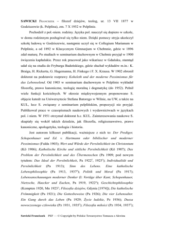 SAWICKI FRANCISZEK – filozof dziejów, teolog, ur. 13 VII 1877 w Godziszewie (k. Pelplina), zm. 7 X 1952 w Pelplinie. Pochodził z pol.-niem. rodziny. Języka pol. nauczył się dopiero w szkole, w domu rodzinnym posługiwał się tylko niem. Dzięki pomocy stryja ukończył szkołę ludową w Godziszewie, następnie uczył się w Collegium Marianum w Pelplinie, a od 1892 w Klasycznym Gimnazjum w Chełmnie, gdzie w 1896 zdał maturę. Po studiach w seminarium duchownym w Chełmie przyjął w 1900 święcenia kapłańskie. Przez rok pracował jako wikariusz w Gdańsku, stamtąd udał się na studia do Fryburga Badeńskiego, gdzie słuchał wykładów m.in.: K. Braiga, H. Rickerta, G. Hagemanna, H. Finkego i F. X. Krausa. W 1902 obronił doktorat na podstawie rozprawy Koheleth und der moderne Pessimismus für das Lebenselend. Od 1903 w seminarium duchownym w Pelplinie wykładał filozofię, prawo kanoniczne, teologię moralną i dogmatykę (do 1952). Pełnił wiele funkcji kościelnych. W okresie międzywojennym proponowano S. objęcie katedr na Uniwersytecie Stefana Batorego w Wilnie, na UW, a także na KUL, lecz S. związany z seminarium pelplińskim, propozycji nie przyjął. Publikował prace w czasopismach naukowych i wydawnictwach w językach pol. i niem. W 1951 otrzymał doktorat h.c. KUL. Zainteresowania naukowe S. skupiały się wokół takich dziedzin, jak filozofia, religioznawstwo, prawo kanoniczne, apologetyka, teologia i historia. Jest autorem kilkuset publikacji, ważniejsze z nich to: Der Prediger, Schopenhauer und Ed. v. Hartmann oder bibilischer und moderner Pessimismus (Fulda 1903); Wert und Würde der Persönlichkeit im Christentum (Kö 1906); Katholische Kirche und sittliche Persönlichkeit (Kö 1907); Das Problem der Persönlichkeit und des Übermenschen (Pa 1909; pod nowym tytułem: Das Ideal der Persönlichkeit, Pa 19222, 19253); Individualität und Persönlichkeit (Pa 1913); Sinn des Lebens. Eine katholische Lebensphilosophie (Pa 1913, 19376); Politik und Moral (Pa 1917); Lebensanschauungen moderner Denker (I: Vortäge über Kant, Schopenhauer, Nietzsche, Haecker und Eucken, Pa 1919, 19226); Geschichtsphilosophie (Kempten 1920, Mn 19233; Filozofia dziejów, Gdynia [1974]); Die katholische Frömmigkeit (Pa 1921); Die Gottesbeweise (Pa 1926); Die vier Lebensalter. Ein Gang durch das Leben (Pa 1929; Życie ludzkie, Pz 1936); Dusza nowoczesnego człowieka (Pz 1931, 19352); Filozofia miłości (Pz 1934, 19372); Sawicki Franciszek PEF — © Copyright by Polskie Towarzystwo Tomasza z Akwinu Dlaczego wierzę? (Pz 1935, Kr 19482); Filozofia życia (Pz 1936, 19463); Kryzys kultury a religia chrześcijańska (Pz [1937]); Fenomenologia wstydliwości (Wwa 1938, Wr 19863); Filozofia ducha w walce z filozofią życia (Pł 1938); Katolicyzm jako religia osobowości i społeczności (Wwa 1939); Osobowość chrześcijańska (Kr 1947); Deus Caritas est (Wł 1948, 19823); Gott ist in Liebe (Pa 1955). KONCEPCJA FILOZOFII I KONCEPCJA CZŁOWIEKA . S. nawiązywał do myśli klasycznej, średniowiecznej scholastyki, współczesnego mu neotomizmu, a także inspirował się filozofią Augustyna z Hippony i tradycją augustyńską. Filozofia była dla S. wiedzą obejmującą wszelkie poznawanie prawdy o bycie i jego zasadach, czyli scientia principiorum. Jej przedmiotem jest Bóg, człowiek oraz otaczający go świat. Aby zrozumieć rzeczywistość, należy badać ją, zwracając uwagę na jej ostateczne przyczyny: materialną, formalną, sprawczą, celową i wzorczą. W odróżnieniu od religii, która czerpie inspiracje z objawienia Bożego (będącego dla niej najważniejszym źródłem poznania), filozofia, analizując rzeczywistość, posługuje się światłem naturalnego rozumu i intuicją badacza. Filozofia nie jest jednak – jak głosili pozytywiści – uogólnieniem i podsumowaniem wyników badań nauk szczegółowych; badając rzeczywistość ludzką, filozof musi uwzględniać ten element natury człowieka, który nie jest przedmiotem badań dziedzin zajmujących się światem materii, tj. duszę. Dusza jest dla ludzkiej jednostki najważniejsza: jest receptorem wszelkich docierających do niej bodźców, zdarzeń, a także źródłem podejmowanych działań; jest podmiotem historii człowieka. Człowiek jest, wg S., bytem duchowo-cielesnym. Wszelkie teorie głoszące, że ludzkie życie psychiczne jest tylko funkcją materii, są fałszywe. Także gnostycyzm i manicheizm – teorie zakładające, że materia jest elementem złym (pochodzącym od szatana) – są błędne, gdyż wszystko, co istnieje, zostało stworzone przez Boga po to, aby służyło człowiekowi w jego doskonaleniu się moralnym i godziwym życiu. Ciało ludzkie jest nieodłącznym składnikiem natury człowieka, dlatego skrajna asceza, a także hedonizm są naganne moralnie i szkodliwe. Dusza ludzka jest nieśmiertelna, a ziemska egzystencja człowieka jest tylko etapem na drodze do życia wiecznego. O KATOLICKIEJ NAUCE SPOŁECZNEJ. Wg S., każda teoria społeczna i ustrojowa zakłada określony światopogląd, który wpływa na powstawanie ustrojów Sawicki Franciszek PEF — © Copyright by Polskie Towarzystwo Tomasza z Akwinu społecznych i kształtowanie ideologii elit rządzących. Dużą rolę w formowaniu się podstaw ustrojowych różnych państw odgrywają także religie, czego dowodzą dzieje wielu cywilizacji światowych oraz kultur (np. ind., żydowskiej, niem., wł., ros.). Sfery życia religijnego i społecznego w poszczególnych społecznościach państwowych wywierają na siebie wzajemny wpływ. Założenia katolickiej nauki społecznej opierają się na przyjętej metafizyce oraz teorii wartości zbudowanej na określonej antropologii i teologii. Katolicyzm opiera się na nauce ojców Kościoła oraz podstawach światopoglądowych wyrosłych na gruncie filozofii św. Augustyna z Hippony oraz św. Tomasza z Akwinu, a także innych myślicieli katolickich; odrzuca natomiast błędne koncepc