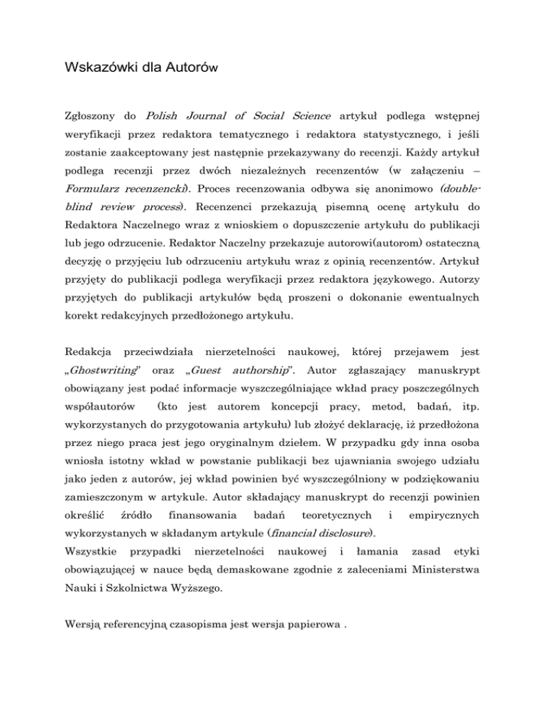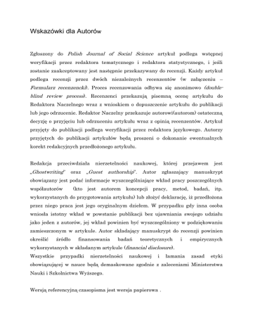 Wskazówki dla Autorów Zgłoszony do Polish Journal of Social Science artykuł podlega wstępnej weryfikacji przez redaktora tematycznego i redaktora statystycznego, i jeśli zostanie zaakceptowany jest następnie przekazywany do recenzji. Każdy artykuł podlega recenzji przez dwóch niezależnych recenzentów (w załączeniu – Formularz recenzencki). Proces recenzowania odbywa się anonimowo (doubleblind review process). Recenzenci przekazują pisemną ocenę artykułu do Redaktora Naczelnego wraz z wnioskiem o dopuszczenie artykułu do publikacji lub jego odrzucenie. Redaktor Naczelny przekazuje autorowi(autorom) ostateczną decyzję o przyjęciu lub odrzuceniu artykułu wraz z opinią recenzentów. Artykuł przyjęty do publikacji podlega weryfikacji przez redaktora językowego. Autorzy przyjętych do publikacji artykułów będą proszeni o dokonanie ewentualnych korekt redakcyjnych przedłożonego artykułu. Redakcja przeciwdziała „Ghostwriting” oraz nierzetelności „Guest naukowej, authorship”. której Autor przejawem zgłaszający jest manuskrypt obowiązany jest podać informacje wyszczególniające wkład pracy poszczególnych współautorów (kto jest autorem koncepcji pracy, metod, badań, itp. wykorzystanych do przygotowania artykułu) lub złożyć deklarację, iż przedłożona przez niego praca jest jego oryginalnym dziełem. W przypadku gdy inna osoba wniosła istotny wkład w powstanie publikacji bez ujawniania swojego udziału jako jeden z autorów, jej wkład powinien być wyszczególniony w podziękowaniu zamieszczonym w artykule. Autor składający manuskrypt do recenzji powinien określić źródło finansowania badań teoretycznych i empirycznych wykorzystanych w składanym artykule (financial disclosure). Wszystkie przypadki nierzetelności naukowej i łamania zasad etyki obowiązującej w nauce będą demaskowane zgodnie z zaleceniami Ministerstwa Nauki i Szkolnictwa Wyższego. Wersją referencyjną czasopisma jest wersja papierowa . Wskazówki redakcyjne 1) Redaktor tematyczny zatwierdza artykuły teoretyczne, doniesienia z badań empirycznych, przeglądy, raporty zgodne z teoretycznym profilem czasopisma. Wysłanie artykułu do redaktora tematycznego powinno być uważane za jednoznaczne z deklaracją, że artykuł ten nie był złożony do innego wydawcy. Otrzymane artykuły będą recenzowane i akceptowane do publikacji indywidualnie. 2) Polish Journal of Social Science jest otwarty na międzydyscyplinarną dyskusję dotyczącą szerokiego zakresu problemów społecznych (w tym filozofia, pedagogika, psychologia, socjologia, nauki polityczne). 3) Każdy rękopis powinien spełniać następujące wymogi: a. Powinien być przygotowany w formacie A4, w dwóch egzemplarzach (dodatkowo polscy autorzy proszeni są o przygotowanie 2 egzemplarzy rękopisu w JĘZYKU POLSKIM). Wymagana jest podwójna interlinia, druk jednostronny, czcionka Times New Roman, wielkość 12, maksymalnie 30 linii i 2000 znaków na stronę, margines 4 cm po lewej stronie. Zaleca się stosowanie stylu „normal”. Każdy rękopis powinien być wydrukowany w kolorystyce czarno-białej, prosimy o stosowanie dla grafik jedynie odcieni szarości. Artykuły i wynik badań empirycznych wraz z odnośnikami, bibliografią, rysunkami i tabelami nie powinny przekraczać 22 stron, a przeglądy nie powinny przekraczać 8 stron. b. Wszystkie rękopisy powinny zawierać odpowiedni tytuł odnoszący się w sposób jasny do treści. Raporty z badań empirycznych powinny zawierać: wyraźnie wydzielone wprowadzenie, zastosowane metody badawcze, wyniki oraz dyskusję. Ponumerowane rysunki, tabele i bibliografia powinny być przygotowane oddzielnie i umieszczone na końcu rękopisu wraz ze wskazaniem miejsca, w którym powinny być umieszczone w tekście. Rękopis powinien zawierać streszczenie w języku angielskim i polskim zawierające około 120 słów, umieszczone na oddzielnej stronie, a także informację o Autorze: tytuł publikacji, nazwisko Autora, stopień naukowy, afiliację, adres do korespondencji, nr telefonu i faksu, adres e-mail. c. Prace cytowane w tekście powinny być sporządzone w jednym formacie. Nazwisko powinno być podane jako pierwsze, następnie (w nawiasach) rok wydania np. (Bernie, Pietrulewicz, 1997). W przypadku publikacji w języku polskim należy obok tytułu oryginalnego w języku polskim podać w nawiasie jego angielskie tłumaczenie. Każda pozycja w bibliografii powinna być umieszczona w porządku alfabetycznym na końcu artykułu, zgodnie z następującym przykładem: Autor, A. A. (1999). Tutuł pracy. Miejsce wydania: Wydawca. Autor, A. A., Autor, B. B. & Autor, C. C. (1999). Tytuł artykułu. Tytuł Czasopisma, xx, xxx-xxx. Autor, A. A. (1999). Tytuł artykułu. W: A.Autor, B.Autor (red.). Tytuł pracy. Miejsce wydania: Wydawca. Autor, A.A. (1999). Tytuł pracy [Title of work]. Miejsce wydania: Wydawca. Cytowana bibliografia powinna być kompletna i sporządzona zgodnie z powyższym przykładem. 4) W przypadku zaakceptowania rękopisu do druku, powinien być on wysłany do autora celem dokonania korekty. Po korekcie, autor tak szybko jak możliwe, powinien przesłać końcową wersję na dyskietce lub płycie CD wraz z egzemplarzem drukowanym do Wydawcy. Formularz recenzencki. Recenzent: Redakcja Polish Journal of Social Science A B Kod artykułu………………. Formularz Recenzji Artykułu Zwracamy się z prośbą o recenzję artykułu, który wpłynął do Redakcji. Recenzja ta jest poufna. Proszę o ocenę według poniższego wzoru i przedstawienie szczegółowych, merytorycznych uwag na odwrocie lub dodatkowej kartce. Z poważaniem, Redaktor Naukowy Polish Journal of Social Science Mieczysław Plopa Recenzja dotyczy artykułu pod tytułem: Opinia Recenzenta: Kategoria oceny Ugruntowanie teoretyczne Klarowność wywodu Nowatorstwo/oryginalność Standardy metodologiczne Wartość informacyjna Znakomite Bardzo dobre Dobre Wystarczają ce Niewystarcz a