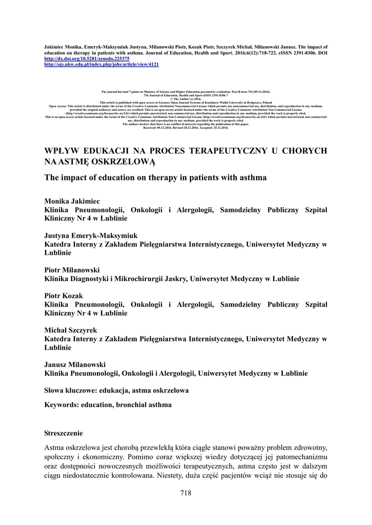 Jakimiec Monika, Emeryk-Maksymiuk Justyna, Milanowski Piotr, Kozak Piotr, Szczyrek Michał, Milanowski Janusz. The impact of education on therapy in patients with asthma. Journal of Education, Health and Sport. 2016;6(12):718-722. eISSN 2391-8306. DOI http://dx.doi.org/10.5281/zenodo.225375 http://ojs.ukw.edu.pl/index.php/johs/article/view/4121 The journal has had 7 points in Ministry of Science and Higher Education parametric evaluation. Part B item 754 (09.12.2016). 754 Journal of Education, Health and Sport eISSN 2391-8306 7 © The Author (s) 2016; This article is published with open access at Licensee Open Journal Systems of Kazimierz Wielki University in Bydgoszcz, Poland Open Access. This article is distributed under the terms of the Creative Commons Attribution Noncommercial License which permits any noncommercial use, distribution, and reproduction in any medium, provided the original author(s) and source are credited. This is an open access article licensed under the terms of the Creative Commons Attribution Non Commercial License (http://creativecommons.org/licenses/by-nc/4.0/) which permits unrestricted, non commercial use, distribution and reproduction in any medium, provided the work is properly cited. This is an open access article licensed under the terms of the Creative Commons Attribution Non Commercial License (http://creativecommons.org/licenses/by-nc/4.0/) which permits unrestricted, non commercial use, distribution and reproduction in any medium, provided the work is properly cited. The authors declare that there is no conflict of interests regarding the publication of this paper. Received: 05.12.2016. Revised 20.12.2016. Accepted: 25.12.2016. WPŁYW EDUKACJI NA PROCES TERAPEUTYCZNY U CHORYCH NA ASTMĘ OSKRZELOWĄ The impact of education on therapy in patients with asthma Monika Jakimiec Klinika Pneumonologii, Onkologii i Alergologii, Samodzielny Publiczny Szpital Kliniczny Nr 4 w Lublinie Justyna Emeryk-Maksymiuk Katedra Interny z Zakładem Pielęgniarstwa Internistycznego, Uniwersytet Medyczny w Lublinie Piotr Milanowski Klinika Diagnostyki i Mikrochirurgii Jaskry, Uniwersytet Medyczny w Lublinie Piotr Kozak Klinika Pneumonologii, Onkologii i Alergologii, Samodzielny Publiczny Szpital Kliniczny Nr 4 w Lublinie Michał Szczyrek Katedra Interny z Zakładem Pielęgniarstwa Internistycznego, Uniwersytet Medyczny w Lublinie Janusz Milanowski Klinika Pneumonologii, Onkologii i Alergologii, Uniwersytet Medyczny w Lublinie Słowa kluczowe: edukacja, astma oskrzelowa Keywords: education, bronchial asthma Streszczenie Astma oskrzelowa jest chorobą przewlekłą która ciągle stanowi poważny problem zdrowotny, społeczny i ekonomiczny. Pomimo coraz większej wiedzy dotyczącej jej patomechanizmu oraz dostępności nowoczesnych możliwości terapeutycznych, astma często jest w dalszym ciągu niedostatecznie kontrolowana. Niestety, duża część pacjentów wciąż nie stosuje się do 718 zaleceń lekarskich. Przyczyn tego zjawiska jest wiele. Nieprzestrzeganie zaleceń i brak kontroli choroby wynikają w znacznej mierze z niedoinformowania pacjenta, dlatego tak ważna jest edukacja chorych. Stanowi ona fundament, na którym budowana jest świadomość na temat choroby. Edukacja chorych na astmę jest również niezbędna dla poprawy komunikacji i wytworzenia wzajemnej więzi między lekarzem, pacjentem i jego rodziną, co ma kluczowy wpływ na powodzenie leczenia. Abstract Asthma is a chronic disease that still causes a serious health, social and economic burden. Despite the growing knowledge concerning the pathomechanism of the disease and the availability of modern therapeutic possibilities, asthma is often still inadequately controlled. Unfortunately, a large group of patients do not comply with medical recommendations. The reasons for this phenomenon are many. Non-compliance and lack of control of disease are often caused by the lack of information on the side of the patients, so it is important to educate them. It is the foundation on which the awareness of the disease is built. Education of patients with asthma is also essential to improve communication and relationship between the physician, the patient and his family, which is crucial to the success of treatment. Astma oskrzelowa jest heterogenną chorobą zwykle charakteryzującą się przewlekłym zapaleniem dróg oddechowych i występowaniem takich objawów, jak świszczący oddech, duszność, uczucie ściskania w klatce piersiowej i kaszel, o zmiennej częstości i nasileniu, związanych z różnego stopnia utrudnieniem wydechowego przepływu powietrza przez drogi oddechowe [1]. Stanowi poważny problem zdrowotny, społeczny i ekonomiczny. Obecnie zakłada się, że dotyczy ona ponad 4 mln Polaków, z czego tylko połowa została zdiagnozowana. Rośnie zapadalność na astmę, co wiąże się z procesem urbanizacji i industrializacji, wzrostem zanieczyszczenia powietrza, zmianami klimatycznymi, zmianami warunków i stylu życia oraz wzrostem higieny [2]. Pomimo dużej wiedzy na temat patomechanizmu choroby oraz dostępnych obecnie szerokich możliwości terapeutycznych, astma oskrzelowa jest w dalszym ciągu niedostatecznie kontrolowana, co wynika w znacznej mierze z niestosowania się pacjentów do zaleceń lekarskich. Przyczyny braku przestrzegania zaleceń są bardzo różnorodne; najważniejsze z nich zostały przedstawione w tabeli 1. Tabela 1. Najważniejsze przyczyny nieprzestrzegania zaleceń lekarskich przez pacjentów chorych na astmę [1]. ● Brak uzyskania przez pacjenta wyczerpujących informacji na temat choroby, jej patogenezy oraz dostępnych możliwości terapeutycznych ● Nieprawidłowe przyjmowanie leków wziewnych ● Obawa przed występowaniem działań niepożądanych leków ● Poczucie stygmatyzacji, negowanie przez pacjentów konieczności przewlekłego leczenia ● Ceny leków 719 W obecnym systemie opieki zdrowotnej w Polsce czas, który lekarz lub pielęgniarka mogą przeznaczyć n
