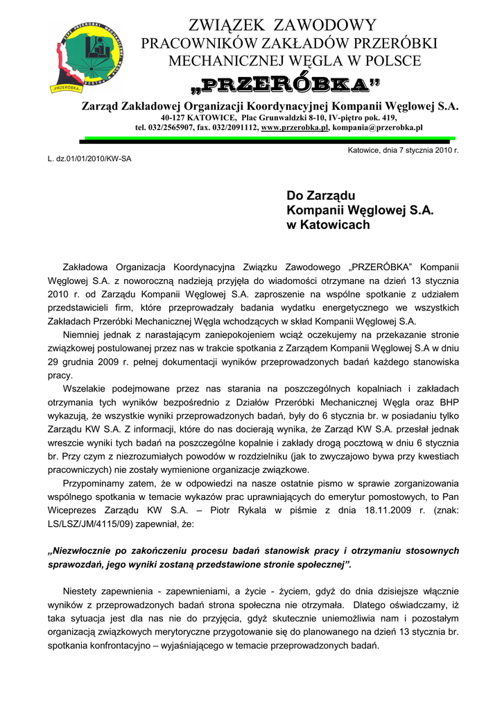 ZWIĄZEK ZAWODOWY PRACOWNIKÓW ZAKŁADÓW PRZERÓBKI MECHANICZNEJ WĘGLA W POLSCE „PRZERÓBKA” Zarząd Zakładowej Organizacji Koordynacyjnej Kompanii Węglowej S.A. 40-127 KATOWICE, Plac Grunwaldzki 8-10, IV-piętro pok. 419, tel. 032/2565907, fax. 032/2091112, www.przerobka.pl, [email protected] Katowice, dnia 7 stycznia 2010 r. L. dz.01/01/2010/KW-SA Do Zarządu Kompanii Węglowej S.A. w Katowicach Zakładowa Organizacja Koordynacyjna Związku Zawodowego „PRZERÓBKA” Kompanii Węglowej S.A. z noworoczną nadzieją przyjęła do wiadomości otrzymane na dzień 13 stycznia 2010 r. od Zarządu Kompanii Węglowej S.A. zaproszenie na wspólne spotkanie z udziałem przedstawicieli firm, które przeprowadzały badania wydatku energetycznego we wszystkich Zakładach Przeróbki Mechanicznej Węgla wchodzących w skład Kompanii Węglowej S.A. Niemniej jednak z narastającym zaniepokojeniem wciąŜ oczekujemy na przekazanie stronie związkowej postulowanej przez nas w trakcie spotkania z Zarządem Kompanii Węglowej S.A w dniu 29 grudnia 2009 r. pełnej dokumentacji wyników przeprowadzonych badań kaŜdego stanowiska pracy. Wszelakie podejmowane przez nas starania na poszczególnych kopalniach i zakładach otrzymania tych wyników bezpośrednio z Działów Przeróbki Mechanicznej Węgla oraz BHP wykazują, Ŝe wszystkie wyniki przeprowadzonych badań, były do 6 stycznia br. w posiadaniu tylko Zarządu KW S.A. Z informacji, które do nas docierają wynika, Ŝe Zarząd KW S.A. przesłał jednak wreszcie wyniki tych badań na poszczególne kopalnie i zakłady drogą pocztową w dniu 6 stycznia br. Przy czym z niezrozumiałych powodów w rozdzielniku (jak to zwyczajowo bywa przy kwestiach pracowniczych) nie zostały wymienione organizacje związkowe. Przypominamy zatem, Ŝe w odpowiedzi na nasze ostatnie pismo w sprawie zorganizowania wspólnego spotkania w temacie wykazów prac uprawniających do emerytur pomostowych, to Pan Wiceprezes Zarządu KW S.A. – Piotr Rykala w piśmie z dnia 18.11.2009 r. (znak: LS/LSZ/JM/4115/09) zapewniał, Ŝe: „Niezwłocznie po zakończeniu procesu badań stanowisk pracy i otrzymaniu stosownych sprawozdań, jego wyniki zostaną przedstawione stronie społecznej”. Niestety zapewnienia - zapewnieniami, a Ŝycie - Ŝyciem, gdyŜ do dnia dzisiejsze włącznie wyników z przeprowadzonych badań strona społeczna nie otrzymała. Dlatego oświadczamy, iŜ taka sytuacja jest dla nas nie do przyjęcia, gdyŜ skutecznie uniemoŜliwia nam i pozostałym organizacją związkowych merytoryczne przygotowanie się do planowanego na dzień 13 stycznia br. spotkania konfrontacyjno – wyjaśniającego w temacie przeprowadzonych badań. Tym bardziej, Ŝe dziwnym trafem we wszystkich kopalniach i zakładach Kompanii Węglowej S.A, ani jeden konserwator maszyn i urządzeń przeróbki mechanicznej węgla (ślusarz, spawacz, elektryk), a takŜe pracownik dozoru – zarówno jako kobieta, jak i męŜczyzna – nie przekroczył wydatku energetycznego, z którym związane jest zakwalifikowanie ich pracy do prac wykonywanych w szczególnych warunkach uprawniających do skorzystania z emerytur pomostowych. Wobec powyŜszego w trybie i na zasadach art. 28 ustawy o związkach zawodowych z dnia 23 maja 1991 r. Ŝądamy, aby najpóźniej do dnia 11 stycznia 2010 r. Zarząd KW S.A. przesłał stronie związkowej droga elektroniczną obiecane wyniki przeprowadzonych badań wraz z podaniem: 1) wszystkich chronometraŜy badanych stanowisk pracy, które proponowane były przez poszczególne Działy ZPMW w raz z ich uproszenie przez firmy wykonujące badania, 2) nazwy lub nazw uŜywanych podczas badań mierników wydatku energetycznego wraz z certyfikatem i akredytacją CIOP dopuszczalności do stosowania oraz zakresem błędu pomiarowego przepływu powietrza i obliczania wydatku energetycznego, 3) danych antropometrycznych i wieku badanych pracowników (masy ciała, wzrostu, wieku oraz staŜu pracy i płci), 4) podaniem automatycznie określonej temperatury otoczenia oraz współczynnik dla ciśnienia atmosferycznego uśrednionego na obszar Polski w dniu pomiaru. 5) rozmiarów zastosowanych półmasek do twarzy i zapewnieniem, Ŝe były one rozmiarowo dostosowywane i zmieniane względem parametrów twarzy badanych pracowników, 6) wyników dokonanych pomiarów z uwzględnieniem powyŜszych danych na stanowiskach pracy, automatycznie obliczonych i wyświetlanych na miernikach następujących wartości: • wentylację minutową, w litrach, • średni minutowy wydatek energetyczny brutto, w kilodŜulach, kilokaloriach lub w watach na metr kwadratowy (kJ, kcal lub W/m2), • średni minutowy wydatek energetyczny efektywny (netto), w kilodŜulach, kilokaloriach lub w watach na metr kwadratowy (kJ, kcal lub W/m2), 7) sumowanych wartości wydatku energetycznego dla poszczególnych czynności przemnoŜonych przez czas ich trwania, tzw. efektywnych wydatków energetyczny na zmianę roboczą – wszystkich badanych stanowisk pracy. 8) porównania sprawdzającego poprawność uzyskanych wyników pomiarów na przykład z metodą G. Lehmanna lub inną. Przypominamy, iŜ zgodnie z art. 28 ustawy o związkach zawodowych: „Pracodawca jest obowiązany udzielić na Ŝądanie związku zawodowego informacji niezbędnych do prowadzenia działalności związkowej, w szczególności informacji dotyczących warunków pracy i zasad wynagradzania”. Z racji tego, Ŝe wyniki przeprowadzonych badań wydatku energetycznego ponad wszelką wątpliwość wchodzą w zakres warunków pracy, to uznajemy nasze Ŝądanie w tym względzie za w pełni zasadne i oczekujemy ich otrzymania. Do wiadomości: • Załóg ZPMW KW S.A., • Mediów. Z powaŜaniem 2