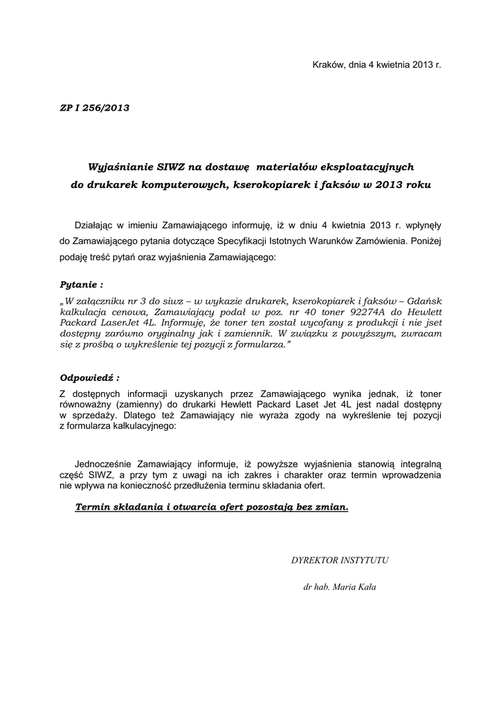 Kraków, dnia 4 kwietnia 2013 r. ZP I 256/2013 Wyjaśnianie SIWZ na dostawę materiałów eksploatacyjnych do drukarek komputerowych, kserokopiarek i faksów w 2013 roku Działając w imieniu Zamawiającego informuję, iŜ w dniu 4 kwietnia 2013 r. wpłynęły do Zamawiającego pytania dotyczące Specyfikacji Istotnych Warunków Zamówienia. PoniŜej podaję treść pytań oraz wyjaśnienia Zamawiającego: Pytanie : „W załączniku nr 3 do siwz – w wykazie drukarek, kserokopiarek i faksów – Gdańsk kalkulacja cenowa, Zamawiający podał w poz. nr 40 toner 92274A do Hewlett Packard LaserJet 4L. Informuję, Ŝe toner ten został wycofany z produkcji i nie jset dostępny zarówno oryginalny jak i zamiennik. W związku z powyŜszym, zwracam się z prośbą o wykreślenie tej pozycji z formularza.” Odpowiedź : Z dostępnych informacji uzyskanych przez Zamawiającego wynika jednak, iŜ toner równowaŜny (zamienny) do drukarki Hewlett Packard Laset Jet 4L jest nadal dostępny w sprzedaŜy. Dlatego teŜ Zamawiający nie wyraŜa zgody na wykreślenie tej pozycji z formularza kalkulacyjnego: Jednocześnie Zamawiający informuje, iŜ powyŜsze wyjaśnienia stanowią integralną część SIWZ, a przy tym z uwagi na ich zakres i charakter oraz termin wprowadzenia nie wpływa na konieczność przedłuŜenia terminu składania ofert. Termin składania i otwarcia ofert pozostają bez zmian. DYREKTOR INSTYTUTU dr hab. Maria Kała