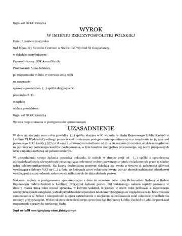 Sygn. akt XI GC 1209/14 WYROK W IMIENIU RZECZYPOSPOLITEJ POLSKIEJ Dnia 17 czerwca 2015 roku Sąd Rejonowy Szczecin-Centrum w Szczecinie, Wydział XI Gospodarczy, w składzie następującym: Przewodniczący: SSR Anna Górnik Protokolant: Anna Sabinicz, po rozpoznaniu w dniu 17 czerwca 2015 roku na rozprawie sprawy z powództwa (...) spółki akcyjnej w K. przeciwko R. O. o zapłatę oddala powództwo. Sygn. akt XI GC 1209/14 Sprawa rozpoznawana w postępowaniu uproszczonym UZASADNIENIE W dniu 25 sierpnia 2010 roku powódka (...) spółka akcyjna w K. wniosła do Sądu Rejonowego Lublin-Zachód w Lublinie VI Wydziału Cywilnego pozew w elektronicznym postępowaniu upominawczym o zasądzenie na jej rzecz od pozwanego R. O. kwoty 3 577,02 zł wraz z ustawowymi odsetkami od dnia 26 sierpnia 2010 roku, a także o zasądzenie na jej rzecz od pozwanego kosztów postepowania, w tym kosztów zastępstwa procesowego, wg norm przepisanych wraz z opłatą skarbową od pełnomocnictwa. W uzasadnieniu swego żądania powódka wskazała, iż nabyła w drodze cesji od (...) spółki z ograniczoną odpowiedzialnością wierzytelność przysługującą cedentowi wobec pozwanego z tytułu świadczonych przez tę spółkę usług telekomunikacyjnych. Na kwotę dochodzoną pozwem składają się kwota 2 670,70 zł należności głównej wynikająca z faktury VAT nr (...) z dnia 10 listopada 2007 roku oraz kwota 907,27 złotych należności odsetkowej wynikającej z sumy odsetek ustawowych naliczonych do dnia złożenia pozwu. Nakazem zapłaty w postępowaniu upominawczym z dnia 10 września 2010 roku Referendarz Sądowy w Sądzie Rejonowym Lublin-Zachód w Lublinie uwzględnił żądanie pozwu. Od wskazanego nakazu zapłaty pozwany w dniu 5 marca 2014 roku wniósł sprzeciw, w którym wskazał, iż jeszcze w 2008 roku próbował u ówczesnego wierzyciela spłacić zaległości, jednak przedstawiciel operatora telekomunikacyjnego ze względu na m.in. brak miejsca zamieszkania w Polsce i niezgodność miejsca zatrudnienia z miejscem zameldowania miał odmówić przedłużenia umowy i przyjęcia opłat. Wobec skutecznie wniesionego sprzeciwu Sąd Rejonowy Lublin-Zachód w Lublinie przekazał rozpoznanie sprawy do tutejszego Sądu. Sąd ustalił następujący stan faktyczny: Pozwany R. O. w ramach prowadzonej wówczas pod nazwą Firma Handlowo Usługowa (...) O. R. działalności gospodarczej zawarł w dniu 5 lutego 2002 roku z (...) spółką z ograniczoną odpowiedzialnością umowę o świadczenie usług telekomunikacyjnych dotyczącą numeru (...). Dowód: Umowa – k. 131 Oświadczenie – k. 135 Oświadczenie – k. 136 Decyzja – k. 139 Zaświadczenie – k. 140 Zaświadczenie – k. 141 W dniu 29 listopada 2002 R. O. zawarł w ramach prowadzonej przez siebie działalności gospodarczej z (...) spółką z ograniczoną odpowiedzialnością umowę o świadczenie usług telekomunikacyjnych dotyczącą numeru (...). Dowód: Umowa – k. 144 W dniu 26 listopada 2004 roku strony sporządziły aneks do umowy o świadczenie usług telekomunikacyjnych dotyczącej numeru (...). W §1 pkt 1 wskazano, że umowa zostaje zawarta na czas określony 24 miesięcy. W §4 pkt 1 umowy postanowiono, że w okresie pierwszych 24 miesięcy abonent zobowiązuje się nie wypowiadać umowy. Abonent w tym zakresie zobowiązuje się w szczególności do: utrzymywania aktywnego numeru w sieci Idea, niedokonywania odłączenia czasowego na życzenie abonenta, nie dokonywania zmiany abonenta. W §5 wskazano, iż w przypadku nie dotrzymania przez abonenta jednego z warunków określonych w §4, co będzie traktowane jako wypowiedzenie umowy przez abonenta z przyczyn leżących po jego stronie lub w razie rozwiązania umowy o świadczenie usług telekomunikacyjnych przez (...) Centertel z przyczyn leżących po stronie abonenta, określonych w Regulaminie Świadczenia Usług (...), abonent zobowiązuje się do zapłaty opłaty specjalnej za niedotrzymanie warunków umowy w wysokości 2775,00 zł. W §6 umowy abonent oświadczył, iż akceptuje ofertę, warunki aneksu do umowy, regulaminy i aneksy wskazane w aneksie oraz potwierdził odbiór telefonu. Dowód: Aneks – k. 149 W dniu 19 września 2006 roku strony sporządziły kolejny aneks do umowy o świadczenie usług telekomunikacyjnych dotyczącej numeru (...). W §1 pkt. 1 wskazano, że umowa zostaje zawarta na czas określony 24 miesięcy, w pkt. 2 wskazano, że okres 24 miesięcy jest liczony od dnia 28 listopada 2006 roku. W §4 pkt 1 umowy postanowiono, że w okresie pierwszych 24 miesięcy abonent zobowiązuje się nie wypowiadać umowy. Abonent w tym zakresie zobowiązuje się w szczególności do: utrzymywania aktywnego numeru w sieci O., niedokonywania odłączenia czasowego na życzenie abonenta, nie dokonywania zmiany abonenta. W §5 wskazano, iż w przypadku nie dotrzymania przez abonenta jednego z warunków określonych w §4, co będzie traktowane jako wypowiedzenie umowy przez abonenta z przyczyn leżących po jego stronie lub w razie rozwiązania umowy o świadczenie usług telekomunikacyjnych przez (...) Centertel z przyczyn leżących po stronie abonenta, określonych w Regulaminie Świadczenia Usług (...), abonent zobowiązuje się do zapłaty opłaty specjalnej za niedotrzymanie warunków umowy w wysokości 2 106,73 zł. W §6 umowy abonent oświadczył, iż akceptuje ofertę, warunki aneksu do umowy, regulaminy i aneksy wskazane w aneksie oraz potwierdził odbiór telefonu. Dowód: Aneks – k. 142 W dniu 19 czerwca 2004 pozwany R. O. zawarł w ramach prowadzonej przez siebie działalności gospodarczej z (...) spółką z ograniczoną odpowiedzialnością umowę o świadczenie usług telekomunikacyjnych dotyczącą numeru (...). Dowód: Umowa – k. 119 W dniu 15 kwietnia 2006 roku strony sporządziły aneks do umowy o świadczenie usług telekomunikacyjnych dotyczącej numeru (...). W §1 pkt. 1 wskazano, że umowa zostaje zawarta na czas określony 24 miesięc