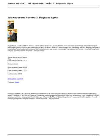 Pomoce szkolne : Jak wytresowa? smoka 2. Magiczna lupka Jak wytresowa? smoka 2. Magiczna lupka Czy Czkawce i innym Je?d?com Smoków uda si? ocali? wiosk? Berk i jej mieszka?ców przed zamiarami tajemniczego wroga? Przekonaj si? sam! Do ksi??eczki do??czona jest magiczna lupka, która pozwoli Ci rozwi?za? umieszczone w ksi??ce zadania i sp?dzi? fantastyczne chwile w towarzystwie Twoich ulubionych bohaterów! Do??cz do Czkawki i jego kumpli – przekonaj si?, jak wspania?e s? smoki – rozwi?zuj ?amig?ówki, odkrywaj tajemnice i przede wszystkim… baw si? dobrze! Ocena: Nie ma jeszcze oceny Cena Cena netto po rabacie: 3,61 € Cena po rabacie Cena sprzeda?y brutto: 3,94 € Cena sprzeda?y netto: 3,61 € Kwota podatku: 0,33 € Zadaj pytanie o produkt Producent: Ameet Szczegó?y produktu Czy Czkawce i innym Je?d?com Smoków uda si? ocali? wiosk? Berk i jej mieszka?ców przed zamiarami tajemniczego wroga? Przekonaj si? sam! Do ksi??eczki do??czona jest magiczna lupka, która pozwoli Ci rozwi?za? umieszczone w ksi??ce zadania i sp?dzi? fantastyczne chwile w towarzystwie Twoich ulubionych bohaterów! Do??cz do Czkawki i jego kumpli – przekonaj si?, jak wspania?e s? smoki – rozwi?zuj ?amig?ówki, odkrywaj tajemnice i przede wszystkim… baw si? dobrze! 1 / 1 Powered by TCPDF (www.tcpdf.org)