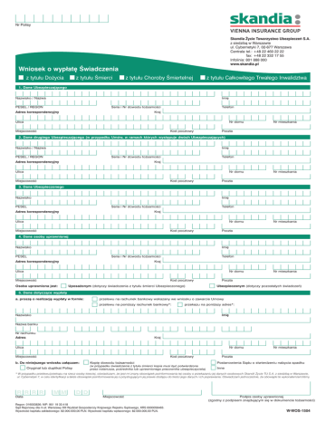 Nr Polisy Skandia ˚ycie Towarzystwo Ubezpieczeƒ S.A. z siedzibà w Warszawie ul. Cybernetyki 7, 02-677 Warszawa Centrala tel.: +48 22 460 22 22 fax: +48 22 332 17 55 Infolinia: 801 888 000 www.skandia.pl Wniosek o wypłat´ Âwiadczenia z tytułu Do˝ycia z tytułu Âmierci z tytułu Choroby Âmiertelnej z tytułu Całkowitego Trwałego Inwalidztwa 1. Dane Ubezpieczajàcego Nazwisko / Nazwa Imi´ PESEL / REGON Telefon Seria i Nr dowodu to˝samoÊci Kraj Adres korespondencyjny Ulica Nr domu MiejscowoÊç Kod pocztowy Nr mieszkania Poczta 2. Dane drugiego Ubezpieczajàcego (w przypadku Umów, w ramach których wyst´puje dwóch Ubezpieczajàcych) Nazwisko / Nazwa Imi´ PESEL / REGON Telefon Seria i Nr dowodu to˝samoÊci Kraj Adres korespondencyjny Ulica Nr domu MiejscowoÊç Kod pocztowy Nr mieszkania Poczta 3. Dane Ubezpieczonego Nazwisko Imi´ PESEL Telefon Seria i Nr dowodu to˝samoÊci Kraj Adres korespondencyjny Ulica Nr domu MiejscowoÊç Kod pocztowy Nr mieszkania Poczta 4. Dane osoby uprawnionej Nazwisko Imi´ PESEL Telefon Seria i Nr dowodu to˝samoÊci Kraj Adres korespondencyjny Ulica Nr domu MiejscowoÊç Osoba uprawniona jest: Kod pocztowy Uposa˝onym (dotyczy Êwiadczenia z tytułu Êmierci Ubezpieczonego) Nr mieszkania Poczta Ubezpieczonym (dotyczy pozostałych Êwiadczeƒ) 5. Dane dotyczàce wypłaty a. prosz´ o realizacj´ wypłaty w formie: przelewu na rachunek bankowy wskazany we wniosku o zawarcie Umowy przelewu na poni˝szy rachunek bankowy*: przekazu na poni˝szy adres*: Nazwisko Imi´ Nazwa banku Nr rachunku Adres Kraj Ulica Nr domu MiejscowoÊç b. Do niniejszego wniosku załàczam: Oryginał lub duplikat Polisy Kod pocztowy Kopi´ dowodu to˝samoÊci (w przypadku Êwiadczenia z tytułu Êmierci kopia musi byç potwierdzona przez notariusza, poÊrednika lub uprawnionego pracownika ubezpieczyciela) Nr mieszkania Poczta Postanowienia Sàdu o stwierdzeniu nabycia spadku Inne * W przypadku przelewu/przekazu na rzecz osoby trzeciej, oÊwiadczam, ˝e jest mi znany obowiàzek poinformowania tej osoby o przekazaniu jej danych osobowych Skandii ˚ycie TU S.A. z siedzibà w Warszawie, ul. Cybernetyki 7, w celu identyfikacji a tak˝e obowiàzek poinformowania jej o przys∏ugujàcym jej prawie dost´pu do treÊci jego danych i ich poprawiania. OÊwiadczam jednoczeÊnie, ˝e obowiàzki te wykona∏em/am/liÊmy. Data MiejscowoÊç Regon: 016003836; NIP: 951 19 33 418 Sàd Rejonowy dla m.st. Warszawy XIII Wydział Gospodarczy Krajowego Rejestru Sàdowego, KRS 0000056463. WysokoÊç kapitału zakładowego: 82.000.000,00 PLN. WysokoÊç kapitału wpłaconego: 82.000.000,00 PLN. Podpis osoby uprawnionej (zgodny z podpisem znajdujàcym si´ w dokumencie to˝samoÊci) W-WOS-1504