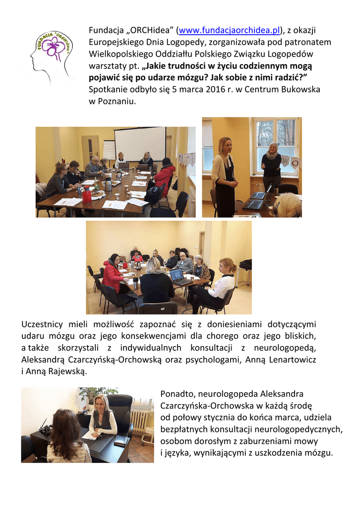 Fundacja „ORCHidea” (www.fundacjaorchidea.pl), z okazji Europejskiego Dnia Logopedy, zorganizowała pod patronatem Wielkopolskiego Oddziałłu Polskiego Związku Logopedów warsztaty pt. „Jakie trudności w życiu codziennym mogą pojawić się po udarze mózgu? Jak sobie z nimi radzić?” Spotkanie odbyło się 5 marca 2016 r. w Centrum Bukowska w Poznaniu. Uczestnicy mieli możliwość zapoznać się z doniesieniami dotyczącymi udaru mózgu oraz jego konsekwencjami dla chorego oraz jego bliskich, a także skorzystali z indywidualnych konsultacji z neurologopedą, Aleksandrą Czarczyńską-Orchowską oraz psychologami, Anną Lenartowicz i Anną Rajewską. Ponadto, neurologopeda Aleksandra Czarczyńska-Orchowska w każdą środę od połowy stycznia do końca marca, udziela bezpłatnych konsultacji neurologopedycznych, osobom dorosłym z zaburzeniami mowy i języka, wynikającymi z uszkodzenia mózgu.
