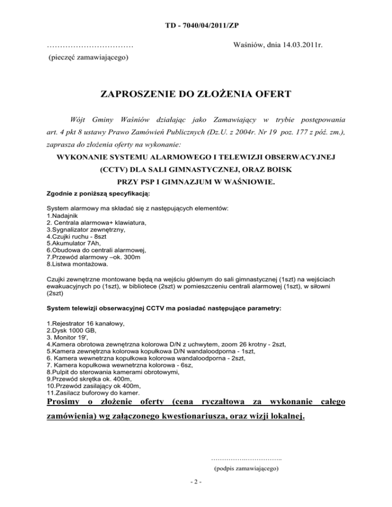 TD - 7040/04/2011/ZP …………………………… Waśniów, dnia 14.03.2011r. (pieczęć zamawiającego) ZAPROSZENIE DO ZŁOśENIA OFERT Wójt Gminy Waśniów działając jako Zamawiający w trybie postępowania art. 4 pkt 8 ustawy Prawo Zamówień Publicznych (Dz.U. z 2004r. Nr 19 poz. 177 z póź. zm.), zaprasza do złoŜenia oferty na wykonanie: WYKONANIE SYSTEMU ALARMOWEGO I TELEWIZJI OBSERWACYJNEJ (CCTV) DLA SALI GIMNASTYCZNEJ, ORAZ BOISK PRZY PSP I GIMNAZJUM W WAŚNIOWIE. Zgodnie z poniŜszą specyfikacją: System alarmowy ma składać się z następujących elementów: 1.Nadajnik 2. Centrala alarmowa+ klawiatura, 3.Sygnalizator zewnętrzny, 4.Czujki ruchu - 8szt 5.Akumulator 7Ah, 6.Obudowa do centrali alarmowej, 7.Przewód alarmowy –ok. 300m 8.Listwa montaŜowa. Czujki zewnętrzne montowane będą na wejściu głównym do sali gimnastycznej (1szt) na wejściach ewakuacyjnych po (1szt), w bibliotece (2szt) w pomieszczeniu centrali alarmowej (1szt), w siłowni (2szt) System telewizji obserwacyjnej CCTV ma posiadać następujące parametry: 1.Rejestrator 16 kanałowy, 2.Dysk 1000 GB, 3. Monitor 19', 4.Kamera obrotowa zewnętrzna kolorowa D/N z uchwytem, zoom 26 krotny - 2szt, 5.Kamera zewnętrzna kolorowa kopułkowa D/N wandaloodporna - 1szt, 6. Kamera wewnetrzna kopułkowa kolorowa wandaloodporna - 2szt, 7. Kamera kopułkowa wewnetrzna kolorowa - 6sz, 8.Pulpit do sterowania kamerami obrotowymi, 9.Przewód skrętka ok. 400m, 10.Przewód zasilający ok 400m, 11.Zasilacz buforowy do kamer. Prosimy o złoŜenie oferty (cena ryczałtowa za wykonanie całego zamówienia) wg załączonego kwestionariusza, oraz wizji lokalnej. …………….…………….. (podpis zamawiającego) -2- TD - 7040/04/2011/ZP Załącznik do: „zaproszenia do złoŜenia oferty” nr. TD -7040/04/2011/ZP z dnia: 14.03.2011r KWESTIONARIUSZ OFERTOWY na wykonanie zadania do 14 000 Euro, zgodnie z art. 4 pkt 8 ustawy Prawo Zamówień Publicznych (Dz.U. z 2004r. Nr 19 poz. 177 z póź. zm.) I. Nazwa i adres Zamawiającego Urząd Gminy w Waśniowie, ul Rynek 24, 27 – 425 Waśniów II. Opis przedmiotu zamówienia WYKONANIE SYSTEMU ALARMOWEGO I TELEWIZJI OBSERWACYJNEJ (CCTV) DLA SALI GIMNASTYCZNEJ, ORAZ BOISK PRZY PSP I GIMNAZJUM W WAŚNIOWIE. III. Forma złoŜenia oferty Ofertę na Kwestionariuszu ofertowym naleŜy złoŜyć do dnia 21.03.2011r. do godziny 1530 w siedzibie Zamawiającego, pok. Nr 16 w jednej z trzech wybranych form: 1. pisemnej (osobiście, listownie) na adres Zamawiającego, 2. faksem na numer: 041 26 46 038 3. w wersji elektronicznej (z wykorzystaniem kwalifikowanego podpisu cyfrowego) na adres: [email protected] IV. Nazwa i adres Wykonawcy Nazwa ………………………………………………………………….. Adres …………………………………………………………………… NIP ……………………………………………………………………... REGON ………………………………………………………………… V. Cena oferty cena ryczałtowa za wykonanie całego zamówienia Cena Netto Podatek VAT Cena Brutto Oświadczamy, Ŝe zapoznaliśmy się z opisem przedmiotu zamówienia i nie wnosimy do niego zastrzeŜeń. ………………………….. …………………………. (pieczęć Wykonawcy) (podpis Wykonawcy) -3-