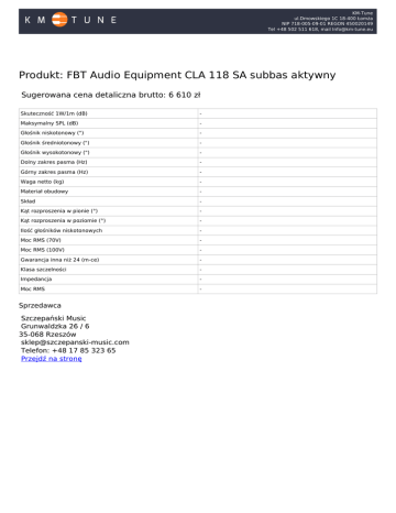 KM-Tune ul.Dmowskiego 1C 18-400 Łomża NIP 718-005-09-01 REGON 450020149 Tel +48 502 511 618, mail [email protected] Produkt: FBT Audio Equipment CLA 118 SA subbas aktywny Sugerowana cena detaliczna brutto: 6 610 zł Skuteczność 1W/1m (dB) - Maksymalny SPL (dB) - Głośnik niskotonowy (") - Głośnik średniotonowy (") - Głośnik wysokotonowy (") - Dolny zakres pasma (Hz) - Górny zakres pasma (Hz) - Waga netto (kg) - Materiał obudowy - Skład - Kąt rozproszenia w pionie (°) - Kąt rozproszenia w poziomie (°) - Ilość głośników niskotonowych - Moc RMS (70V) - Moc RMS (100V) - Gwarancja inna niż 24 (m-ce) - Klasa szczelności - Impedancja - Moc RMS - o Sprzedawca Szczepański Music Grunwaldzka 26 / 6 35-068 Rzeszów [email protected] Telefon: +48 17 85 323 65 Przejdź na stronę Powered by TCPDF (www.tcpdf.org)