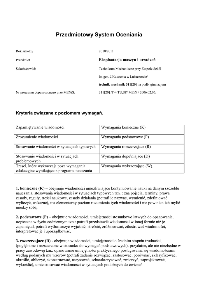 Przedmiotowy System Oceniania Rok szkolny 2010/2011 Przedmiot Eksploatacja maszyn i urzadzeń Szkoła/zawód: Technikum Mechaniczne przy Zespole Szkół im.gen. J.Kustronia w Lubaczowie/ technik mechanik 311[20] na podb. gimnazjum Nr programu dopuszczonego prze MENiS: 311[20] /T-4,TU,SP/ MEiN / 2006.02.06. Kryteria związane z poziomem wymagań. Zapamiętywanie wiadomości Wymagania konieczne (K) Zrozumienie wiadomości Wymagania podstawowe (P) Stosowanie wiadomości w sytuacjach typowych Wymagania rozszerzajace (R) Stosowanie wiadomości w sytuacjach problemowych Tresci, które wykraczają poza wymagania edukacyjne wynikające z programu nauczania Wymagania dope³niajace (D) Wymagania wykraczające (W). 1. konieczne (K) – obejmuje wiadomości umożliwiające kontynuowanie nauki na danym szczeblu nauczania, stosowania wiadomości w sytuacjach typowych tzn. : zna pojęcia, terminy, prawa zasady, reguły, treści naukowe, zasady działania (potrafi je nazwać, wymienić, zdefiniować wyliczyć, wskazać), ma elementarny poziom rozumienia tych wiadomości i nie powinien ich mylić miedzy sobą, 2. podstawowe (P) – obejmuje wiadomości, umiejętności stosunkowo łatwych do opanowania, użyteczne w życiu codziennym tzn.: potrafi przedstawić wiadomości w innej formie niż je zapamiętał, potrafi wytłumaczyć wyjaśnić, streścić, zróżnicować, zilustrować wiadomości, interpretować je i uporządkować, 3. rozszerzajace (R) - obejmuje wiadomości, umiejętności o średnim stopniu trudności, (pogłębione i rozszerzone w stosunku do wymagań podstawowych), przydatne, ale nie niezbędne w pracy zawodowej tzn.: opanowanie umiejętności praktycznego posługiwania się wiadomościami według podanych mu wzorów (potrafi zadanie rozwiązać, zastosować, porównać, sklasyfikować, określić, obliczyć, skonstruować, narysować, scharakteryzować, zmierzyć, zaprojektować, wykreślić), umie stosować wiadomości w sytuacjach podobnych do ćwiczeń 4. dopełniające (D) – obejmuje wiadomości i umiejętności trudne do opanowania, twórcze naukowo, specjalistyczne zawodowo, stanowiące rozwinięcie wymagań rozszerzających, mogą wykraczać poza program nauczania, tzn.: opanowanie przez ucznia umiejętności formułowania problemów, dokonywania analizy i syntezy nowych zjawisk (potrafi udowodnić, przewidzieć, oceniać, wykryć, zanalizować, zaproponować, zaplanować), umie formułować plan działania, tworzyć oryginalne rozwiązania. 5. Kryteria wymagań na poszczególne oceny dopuszczający wymagania konieczne dostateczny wymagania podstawowe dobry wymagania rozszerzające bardzo dobry wymagania dopełniające celujący wymagania wykraczające K K+P K+P+R K+P+R+D K+P+R+D+W Treść Wymagania edukacyjne Wprowadzenie do eksploatacji 1Zna podstawowe pojęcia dotyczące eksploatacji obiektów technicznych K Procesy destrukcyjne w eksploatacji 1) Rozróżnia rodzaje zużycia materiałów konstrukcyjnych metalowych 2) Określa przyczyny zużycia urządzeń mechanicznych 3) Zna rodzaje tarcia i smarowania 4) Charakteryzuje starzenie fizyczne i moralne maszyn 5) Zna metody zapobiegające nadmiernemu zużyciu 6) Analizuje rodzaje zużycia 7) Porównuje rodzaje smarowania i wyciąga wnioski K K P R R D D Diagnostyka techniczna 1) Zna pojęcie diagnostyki jako proces pozyskiwania informacji i oceny 2) Zna przepisy BHP podczas badań diagnostycznych maszyn i urządzeń 3) Zna rodzaje badań diagnostycznych 4) Potrafi scharakteryzować czynności diagnostyczne 5) Dobiera przyrządy i narzędzia diagnostyczne K K P R D Użytkowanie maszyn i urządzeń 1) Wymienia urządzenia ze względu na rodzaj wykonywanego procesu roboczego 2) Zna zasady BHP oraz ochrony przeciwpożarowej podczas użytkowania maszyn i urządzeń 3) Zna parametry związane z użytkowaniem maszyn i urządzeń 4) Zna warunki techniczne użytkowania 5) Wie jaką rolę pełni Urząd Dozoru Technicznego w użytkowaniu maszyn i urządzeń K K P R D Obsługa maszyn i urządzeń 1) Planuje obsługę techniczną maszyny lub urządzenia na podstawie Dokumentacji TechnicznoRuchowej 2) Opracowuje harmonogram czynności obsługowych maszyny lub urządzenia K P 3) Dobiera narzędzia do wykonywania wybranych czynności obsługowych 4) Opracowuje plan konserwacji maszyny i urządzenia R D Naprawa maszyn i urządzeń 1) Charakteryzuje podstawowe metody naprawy i regeneracji elementów maszyn 2) Opracowuje proces technologiczny regeneracji części maszyny 3) Sporządza schemat demontażu, montażu 4) Wykorzystuje dokumentację techniczną do planowania procesów naprawy i konserwacji maszyn i urządzeń 5) Opracowuje proces naprawy części maszyny z wykorzystaniem obróbki skrawaniem, obróbki plastycznej, spajania i nakładania powłok ochronnych K P R D D Logistyka w eksploatacji 1) Planuje części zamienne, materiały eksploatacyjne i narzędzia do naprawy maszyny lub urządzenia 2) Zna organizację zaopatrywania 3) Zna metody zarządzania materiałami, energią i informacją 4) Zna organizację magazynowania K P P R Recykling w eksploatacji 1) Charakteryzuje proces likwidacji maszyny 2) Zna pojęcie i rodzaje recyklingu 3) Wie jaki wpływ wywiera recykling na środowisko 4) Opracowuje procedury likwidacji maszyny lub urządzenia K P R D Organizacja obsługi i naprawy maszyn i urządzeń 1) Charakteryzuje organizację i zadania służb utrzymania ruchu w przedsiębiorstwie 2) Charakteryzuje organizację i wyposażenie stanowisk i stacji diagnostycznych 3) Wie jaka jest organizacja i wyposażenie stanowisk obsługowych 4) Zna rodzaje organizacji napraw K P R D
