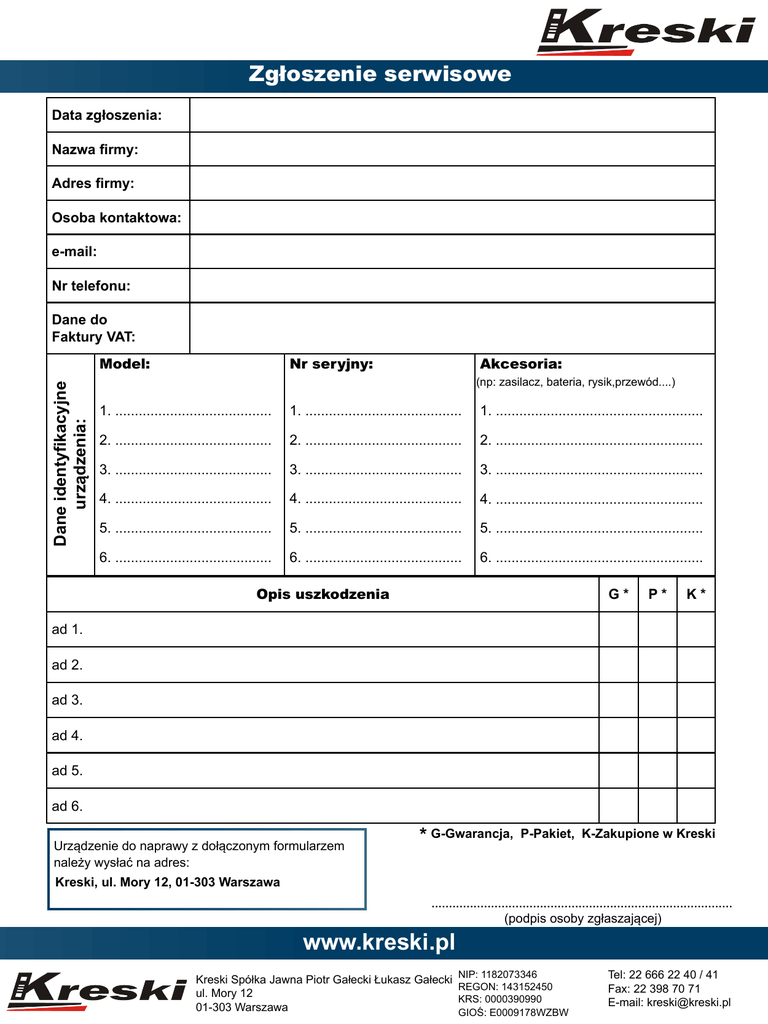 Zgłoszenie serwisowe Data zgłoszenia: Nazwa firmy: Adres firmy: Osoba kontaktowa: e-mail: Nr telefonu: Dane do Faktury VAT: Dane identyfikacyjne urządzenia: Model: Nr seryjny: Akcesoria: (np: zasilacz, bateria, rysik,przewód....) 1. ........................................ 1. ........................................ 1. ..................................................... 2. ........................................ 2. ........................................ 2. ..................................................... 3. ........................................ 3. ........................................ 3. ..................................................... 4. ........................................ 4. ........................................ 4. ..................................................... 5. ........................................ 5. ........................................ 5. ..................................................... 6. ........................................ 6. ........................................ 6. ..................................................... Opis uszkodzenia G* P* K* ad 1. ad 2. ad 3. ad 4. ad 5. ad 6. Urządzenie do naprawy z dołączonym formularzem należy wysłać na adres: * G-Gwarancja, P-Pakiet, K-Zakupione w Kreski Kreski, ul. Mory 12, 01-303 Warszawa ...................................................................................... www.kreski.pl Kreski Spółka Jawna Piotr Gałecki Łukasz Gałecki ul. Mory 12 01-303 Warszawa (podpis osoby zgłaszającej) NIP: 1182073346 REGON: 143152450 KRS: 0000390990 GIOŚ: E0009178WZBW Tel: 22 666 22 40 / 41 Fax: 22 398 70 71 E-mail: [email protected]