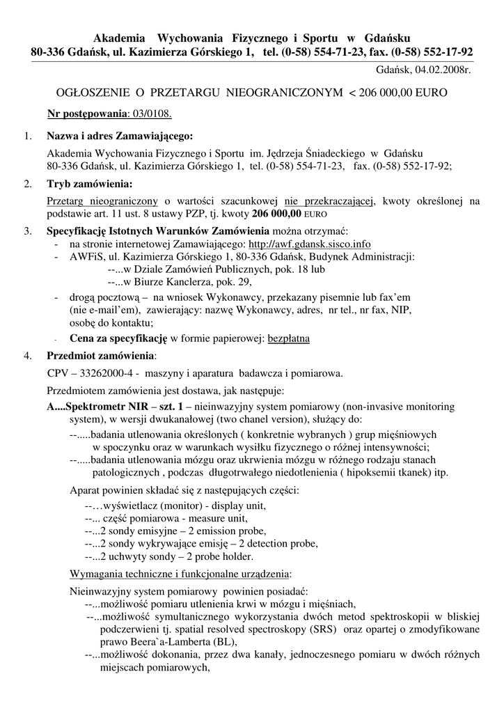 Akademia Wychowania Fizycznego i Sportu w Gdańsku 80-336 Gdańsk, ul. Kazimierza Górskiego 1, tel. (0-58) 554-71-23, fax. (0-58) 552-17-92 Gdańsk, 04.02.2008r. OGŁOSZENIE O PRZETARGU NIEOGRANICZONYM < 206 000,00 EURO Nr postępowania: 03/0108. 1. Nazwa i adres Zamawiającego: Akademia Wychowania Fizycznego i Sportu im. Jędrzeja Śniadeckiego w Gdańsku 80-336 Gdańsk, ul. Kazimierza Górskiego 1, tel. (0-58) 554-71-23, fax. (0-58) 552-17-92; 2. Tryb zamówienia: Przetarg nieograniczony o wartości szacunkowej nie przekraczającej, kwoty określonej na podstawie art. 11 ust. 8 ustawy PZP, tj. kwoty 206 000,00 EURO 3. Specyfikację Istotnych Warunków Zamówienia moŜna otrzymać: - na stronie internetowej Zamawiającego: http://awf.gdansk.sisco.info - AWFiS, ul. Kazimierza Górskiego 1, 80-336 Gdańsk, Budynek Administracji: --...w Dziale Zamówień Publicznych, pok. 18 lub --...w Biurze Kanclerza, pok. 29, - drogą pocztową – na wniosek Wykonawcy, przekazany pisemnie lub fax’em (nie e-mail’em), zawierający: nazwę Wykonawcy, adres, nr tel., nr fax, NIP, osobę do kontaktu; Cena za specyfikację w formie papierowej: bezpłatna 4. Przedmiot zamówienia: CPV – 33262000-4 - maszyny i aparatura badawcza i pomiarowa. Przedmiotem zamówienia jest dostawa, jak następuje: A....Spektrometr NIR – szt. 1 – nieinwazyjny system pomiarowy (non-invasive monitoring system), w wersji dwukanałowej (two chanel version), słuŜący do: --.....badania utlenowania określonych ( konkretnie wybranych ) grup mięśniowych w spoczynku oraz w warunkach wysiłku fizycznego o róŜnej intensywności; --.....badania utlenowania mózgu oraz ukrwienia mózgu w róŜnego rodzaju stanach patologicznych , podczas długotrwałego niedotlenienia ( hipoksemii tkanek) itp. Aparat powinien składać się z następujących części: --…wyświetlacz (monitor) - display unit, --... część pomiarowa - measure unit, --...2 sondy emisyjne – 2 emission probe, --...2 sondy wykrywające emisję – 2 detection probe, --...2 uchwyty sondy – 2 probe holder. Wymagania techniczne i funkcjonalne urządzenia: Nieinwazyjny system pomiarowy powinien posiadać: --...moŜliwość pomiaru utlenienia krwi w mózgu i mięśniach, --...moŜliwość symultanicznego wykorzystania dwóch metod spektroskopii w bliskiej podczerwieni tj. spatial resolved spectroskopy (SRS) oraz opartej o zmodyfikowane prawo Beera`a-Lamberta (BL), --...moŜliwość dokonania, przez dwa kanały, jednoczesnego pomiaru w dwóch róŜnych miejscach pomiarowych, --...moŜliwość pomiaru jednoczesnego stęŜenia HbO2/ HbH, wskaźnika natlenowania tkanki (TOI) w % oraz wskaźnika hemoglobiny w tkance (THI), --...moŜliwość odbioru sygnału: bezpośrednio na wyświetlaczu, przez cyfrowy interfejs na komputerze w trybie on-line (aktywny), przez cyfrowy interfejs w trybie off-line (nieaktywny), przez wyjście analogowe, --...moŜliwość zmiany szybkości `próbkowania sygnału`, --...głowicę sensora/lasera oraz światłowody wielokrotnego uŜytku, --...moŜliwość rozbudowy o kolejne kanały pomiarowe, --...bezpieczeństwo radiacji osoby badanej – klasa 1, --...bezpieczeństwo laserowych diod zgodne z wymogami IEC. Zamawiający preferuje Spektrometr NIRO-200 firmy HAMAMATSU, Japan. Oferty równowaŜne. Zamawiający dopuszcza złoŜenie oferty równowaŜnej, tj. zaproponowanie innego urządzenia niŜ preferowany Spektrometr NIRO-200. W takim przypadku Zamawiający stawia jednak warunek: oferowany `równowaŜny` spektrometr, nie moŜe być pod względem technicznym niŜszej klasy niŜ spektrometr preferowany oraz nie moŜe posiadać od niego gorszej funkcjonalności. Oferując aparat `równowaŜny` Wykonawca zobowiązany jest do podania producenta i typu (modelu) tego urządzenia, jego szczegółowych danych technicznych oraz funkcjonalnych po to, aby Zamawiający mógł ocenić czy rzeczywiście jest to urządzenie `równowaŜne` czy moŜe tylko gorszej jakości `zamiennik`. W przypadku wątpliwości, na Wykonawcy będzie spoczywać trud udowodnienia, Ŝe oferowany produkt jest równowaŜny. Zamawiający wymaga dostarczenia urządzenia fabrycznie nowego. Urządzenie musi posiadać certyfikat bezpieczeństwa elektrycznego CE i co najmniej jeden odpowiedni certyfikat medyczny. B....Kabel RS232C – szt. 1; C....Specjalistyczne oprogramowanie uŜytkowe współpracujące z ww. spektrometrem (online software analysing program) słuŜące m. in. do: --...kierowania pracą aparatu, --...gromadzenia wyników badań, --...analizy wyników badań, Oprogramowanie musi ponadto umoŜliwiać import i export plików danych, w tym export do plików tekstowych, Microsoft Excel lub XML. Oprogramowanie musi być firmowane przez producenta spektrometru. Oprogramowanie musi posiadać odpowiednie licencje uŜytkownika. Miejsce dostawy: AWFiS, 80-336 Gdańsk, ul. Kazimierza Górskiego 1, Zamawiający określa, Ŝe Ŝadna pozycja/część zamówienia nie moŜe być powierzona podwykonawcom, 4.1. Nie dopuszcza się składania ofert częściowych. 5. Nie dopuszcza się składania ofert wariantowych. 6. Termin wykonania/realizacji zamówienia: max 2 miesiące od dnia podpisania umowy, 7. Warunki udziału w postępowaniu: 1...Warunkami udziału w postępowaniu o udzielenie zamówienia są: 1.1... spełnianie przez Wykonawcę wymagań wynikających z art. 22 ust.1 p.1-4 (p. 4 - w powiązaniu z przesłankami wykluczenia wg art. 24) ustawy Prawo zamówień publicznych, 2...Ocena spełnienia ww. warunków dokonana zostanie w oparciu o informacje zawarte w nw. dokumentach i oświadczeniach, złoŜonych przez Wykonawcę, zgodnie z formułą `spełnia nie spełnia`. Z treści załączonych dokumentów musi wynikać jednoznacznie, iŜ Wykonawca spełnił ww. warunki. 3... W celu potwierdzenia spełnienia ww. warunków udziału w postępowaniu Wykonawca złoŜy: 1... OŚWIADCZENIE, zgodnie z art. 44 ustawy Prawo zamówień publicznych, o spełnianiu wymagań wynikających z art. 22 