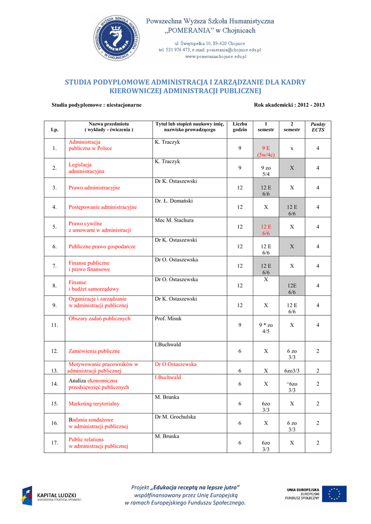 STUDIA PODYPLOMOWE ADMINISTRACJA I ZARZĄDZANIE DLA KADRY KIEROWNICZEJ ADMINISTRACJI PUBLICZNEJ Studia podyplomowe : niestacjonarne Lp. 1. Nazwa przedmiotu ( wykłady - ćwiczenia ) Administracja publiczna w Polsce Rok akademicki : 2012 - 2013 Tytuł lub stopień naukowy imię, nazwisko prowadzącego Liczba godzin 1 semestr 2 semestr Punkty ECTS 9 9E (5w/4c) x 4 9 9 zo 5/4 X 4 12 12 E 6/6 X 4 12 X 12 E 6/6 4 12 12 E 6/6 X 4 12 12 E 6/6 X 4 12 12 E 6/6 X X 4 12E 6/6 4 K. Traczyk K. Traczyk 2. Legislacja administracyjna 3. Prawo administracyjne 4. Postępowanie administracyjne 5. Prawo cywilne z umowami w administracji 6. Publiczne prawo gospodarcze 7. Finanse publiczne i prawo finansowe 8. Finanse i budżet samorządowy Dr K. Ostaszewski Dr. Ł. Domański Mec M. Stachura Dr K. Ostaszewski 9. Dr O. Ostaszewska Dr O. Ostaszewska 12 Organizacja i zarządzanie w administracji publicznej Dr K. Ostaszewski Obszary zadań publicznych Prof. Misuk 11. 12 X 12 E 6/6 4 9 9 * zo 4/5 X 4 6 X 6 zo 3/3 2 6 X 6zo3/3 2 6 X ^6zo 3/3 2 6 6zo 3/3 X 2 6 X 6 zo 3/3 2 6 6zo 3/3 X 2 I.Buchwald 12. Zamówienia publiczne 13. Motywowanie pracowników w administracji publicznej 14. Analiza ekonomiczna przedsięwzięć publicznych 15. Marketing terytorialny 16. Badania sondażowe w administracji publicznej 17. Public relations w administracji publicznej Dr O.Ostaszewska I.Buchwald M. Brunka Dr M. Grochulska M. Brunka Projekt „Edukacja receptą na lepsze jutro” współfinansowany przez Unię Europejską w ramach Europejskiego Funduszu Społecznego. 18. Techniki mediacji i negocjacji 19. Projektowanie programów publicznych 20. Seminarium dyplomowe Dr Dorota Bronk M. Grochulska 6 X 6 zo 3/3 2 6 X 6zo 3/3 2 6 X 6 zo 3/3 4 165 87 78 8 - 87 44 39 5 87 78 43 39 3 78 50 % 50 % 8 165 - 87 30 78 30 P. Zalewski Prof. A. Misiuk razem : zajęcia dydaktyczne liczba godzin ćwiczenia egzaminy (E) ECTS Razem : studia podyplomowe liczba godzin ECTS Projekt „Edukacja receptą na lepsze jutro” współfinansowany przez Unię Europejską w ramach Europejskiego Funduszu Społecznego. 60 60