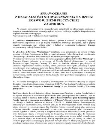 SPRAWOZDANIE Z DZIAŁALNOŚCI STOWARZYSZENIA NA RZECZ ROZWOJU ZIEMI PILCZYCKIEJ ZA 2008 ROK W okresie sprawozdawczym ukierunkowano działalność na aktywizację społeczną i integrację mieszkańców oraz promocję regionu poprzez: realizację projektów i organizowanie imprez kulturalno-edukacyjnych. NajwaŜniejsze z nich w kolejności chronologicznej: I. „Powroty sentymentalne” naszej krajanki, poetki i malarki Władysławy Szproch pozwoliły na zapoznanie się z jej bogatą twórczością literacką i plastyczną. Był to piękny wieczór wspomnień, przy wtórze gitary i ballad w wykonaniu Małgorzaty Biesagi, zorganizowany z okazji Święta Kobiet. II. „Tradycje i Zwyczaje Wielkanocne” mogliśmy sobie przypomnieć za sprawą występu uczniów ze Szkoły Podstawowej w Pilczycy pod opieką pani Haliny Pniewskiej, oraz Zespołu Obrzędowego z Lasocina, który zaszczycił nas swoim gościnnym występem. W marcu Stowarzyszenie przystąpiło do realizacji projektu „Remont Świetlicy Wiejskiej” w Pilczycy, (lokalu będącego w uŜyczeniu od Urzędu Gminy) sfinansowany w ramach Świętokrzyskiego Programu Odnowy Wsi oraz ze środków własnych pozyskanych od sponsora. Wymieniono stolarkę okienną, drzwi, połoŜono nowe tynki, posadzkę z płytek ceramicznych oraz wykonano pokrycie dachu. NaleŜy podkreślić bardzo duŜy wkład pracy członków Stowarzyszenia i OSP przy remoncie i porządkowaniu pomieszczeń i terenu wokół obiektu. Prace remontowe zakończono dn. 20 maja 2008. Lokal wyposaŜono w niezbędne meble: biurka, stoliki komputerowe, fotele, krzesła, które pozyskano nieodpłatnie z Urzędu Marszałkowskiego. III. W okresie wakacyjnym, z inicjatywy Stowarzyszenia w Świetlicy odbywały się zajęcia dla dzieci i młodzieŜy, finansowane z funduszu GKRPA. Pani Barbara Pawelczyk prowadziła zajęcia: „Wakacyjna Przygoda z Teatrem i Poezją”, a pan Stanisław Górski „ Warsztaty plastyczne”. IV. Po uzyskaniu decyzji Świętokrzyskiego Konserwatora Zabytków o wpisie Anioła Śmierci do rejestru zabytków i zezwoleń na prowadzenie prac, przystąpiliśmy do Konkursu Ofert na realizację zadań w zakresie dóbr kultury: „Prace konserwatorskie przy kamiennej figurze Anioła Śmierci z cmentarza parafialnego w Pilczycy”. Stowarzyszenie otrzymało na ten cel dotację z budŜetu państwa w kwocie: 5588,00 zł. Wkład Własny Stowarzyszenia, obliczony po zakończeniu prac, wyniósł 2651,62 zł. Stowarzyszenie miało równieŜ duŜy udział rzeczowy w przedsięwzięciu. Pan Stanisław Górski wykonał nieodpłatnie renowację podstawy pomnika, poprzez demontaŜ, oczyszczenie, zamontowanie płyt postumentu i cokołu. Zgodnie z umową zawartą z Sołtysem wsi Pilczyca, kilku mieszkańców pracowało przy demontaŜu figury i przygotowaniu do transportu, przewiezieniu płyt do renowacji, wykonaniu fundamentu, uzupełnieniu cokołu, uporządkowaniu terenu wokół pomnika oraz przy montaŜu figury po konserwacji. Koszty organizacyjne pokryte zostały w całości ze środków prywatnych zarządzającej projektem. Urząd Gminy w Słupi partycypował w tym przedsięwzięciu poprzez sfinansowanie kosztów transportu i części materiałów budowlanych. V. W okresie od 01.09.2008-31.12.08 Stowarzyszenie realizowało projekt w ramach Programu Integracji Społecznej ze środków PPWOW „Integracja społeczna osób starszych, samotnych i niepełnosprawnych poprzez kultywowanie tradycji” W ramach projektu odbyły się: 1.Zajęcia teatralne 2. „Michałki” tradycyjne impreza odpustowa połączona z oficjalnym otwarciem Świetlicy Wiejskiej, występami artystycznymi i zabawą taneczną. 3.Kurs Tańca Ludowego prowadzony przez choreografa – Małgorzatę Soboń, pracownika GOK w Łopusznie. Forma zajęć cieszyła się duŜą popularnością wśród uczestników, jako bardzo atrakcyjny sposób spędzania wolnego czasu. 4. Warsztaty Rzeźbiarskie, prowadzone przez absolwenta ASP w Poznaniu, nauczyciela sztuki w gimnazjum w Słupi- Stanisława Górskiego, były czymś zupełnie nowym dla uczestników, a co za tym idzie niezwykle ciekawym i kształcącym pod względem artystycznym i poznawczym. 5. Jesienne spotkania ze sztuką i tradycją są kontynuacją wspólnego spędzania jesiennych wieczorów, podczas których wykonywano razem róŜnego rodzaju prace, wymieniano się doświadczeniami i umiejętnościami, a nade wszystko rozmawiano ze sobą. a) „Zaśpiewajmy to jeszcze raz”- przygotowania do występu zespołu ludowego na otwartej dla publiczności imprezie. b) „Kwiaty Pamięci” Kolejne wspólne wieczory poświęciliśmy na wspomnienia tych, którzy zasłuŜyli się dla naszego regionu. i wykonanie wiązanek na ich groby. c) Wykonywanie ozdób choinkowych i kwiatów z bibuły „w stylu naszej babci” pod kierunkiem instruktora: pani Barbary Pawelczyk, która objaśniała uczestnikom nie tylko sposób ich wykonania, ale równieŜ ich przeznaczenie (wystrój domów, ołtarzyków, kapliczek przydroŜnych). d) „Nasz Śpiewnik” opracowany w ramach projektu zbiór 36 piosenek wykonywanych w naszym regionie, został wydrukowany w 50 egzemplarzach. 6. Spotkanie Andrzejkowe -dnia 29 listopada 2008 zorganizowano spotkanie z okazji św. Andrzeja dla dzieci i młodzieŜy szkolnej. Były wróŜby, gry, konkursy z nagrodami, zabawa taneczna oraz poczęstunek. 7. Wystawa prac. Uczestnicy warsztatów plastycznych oraz Jesiennych spotkań ze sztuką i tradycją przygotowali swoje prace wykonane podczas zajęć na wystawę, która została zaprezentowana na spotkaniu podsumowującym realizacje projektów w ramach Programu Integracji Społecznej zorganizowanym przez Urząd Gminy oraz w Świetlicy Wiejskiej w Pilczycy. 8. śyczenia dla osób samotnych, starszych i niepełnosprawnych. Uczestnicy zajęć przekazali swoim sąsiadom oraz pensjonariuszom DPS Ŝyczenia i własnoręcznie wykonane ozdoby. 9. Na zakończenie projektu uczestnicy zajęć otrzymali Zaświadczenia o udzial