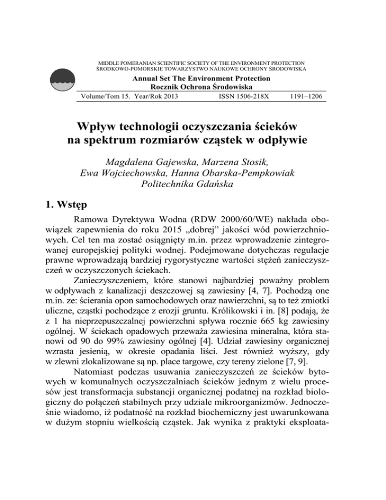 MIDDLE POMERANIAN SCIENTIFIC SOCIETY OF THE ENVIRONMENT PROTECTION ŚRODKOWO-POMORSKIE TOWARZYSTWO NAUKOWE OCHRONY ŚRODOWISKA Annual Set The Environment Protection Rocznik Ochrona Środowiska Volume/Tom 15. Year/Rok 2013 ISSN 1506-218X 1191–1206 Wpływ technologii oczyszczania ścieków na spektrum rozmiarów cząstek w odpływie Magdalena Gajewska, Marzena Stosik, Ewa Wojciechowska, Hanna Obarska-Pempkowiak Politechnika Gdańska 1. Wstęp Ramowa Dyrektywa Wodna (RDW 2000/60/WE) nakłada obowiązek zapewnienia do roku 2015 „dobrej” jakości wód powierzchniowych. Cel ten ma zostać osiągnięty m.in. przez wprowadzenie zintegrowanej europejskiej polityki wodnej. Podejmowane dotychczas regulacje prawne wprowadzają bardziej rygorystyczne wartości stężeń zanieczyszczeń w oczyszczonych ściekach. Zanieczyszczeniem, które stanowi najbardziej poważny problem w odpływach z kanalizacji deszczowej są zawiesiny [4, 7]. Pochodzą one m.in. ze: ścierania opon samochodowych oraz nawierzchni, są to też zmiotki uliczne, cząstki pochodzące z erozji gruntu. Królikowski i in. [8] podają, że z 1 ha nieprzepuszczalnej powierzchni spływa rocznie 665 kg zawiesiny ogólnej. W ściekach opadowych przeważa zawiesina mineralna, która stanowi od 90 do 99% zawiesiny ogólnej [4]. Udział zawiesiny organicznej wzrasta jesienią, w okresie opadania liści. Jest również wyższy, gdy w zlewni zlokalizowane są np. place targowe, czy tereny zielone [7, 9]. Natomiast podczas usuwania zanieczyszczeń ze ścieków bytowych w komunalnych oczyszczalniach ścieków jednym z wielu procesów jest transformacja substancji organicznej podatnej na rozkład biologiczny do połączeń stabilnych przy udziale mikroorganizmów. Jednocześnie wiadomo, iż podatność na rozkład biochemiczny jest uwarunkowana w dużym stopniu wielkością cząstek. Jak wynika z praktyki eksploata- 1192 M. Gajewska, M. Stosik, E. Wojciechowska, H. Obarska-Pempkowiak cyjnej, pewna część substancji organicznej i związków biogennych o różnym stopniu zdyspergowania nie jest usuwana w procesach oczyszczania i jest odprowadzana do odbiorników przyczyniając się do ich eutrofizacji [3, 10, 13, 15, 17]. Na cząstkach zawiesiny są zaadsorbowane inne zanieczyszczenia, np. związki organiczne, metale ciężkie, tłuszcze, oleje mineralne i ortofosforany [5, 19]. Według Garbarczyk [4] z zawiesiną ogólną skojarzonych jest do 92% substancji organicznych (ChZT i BZT5) i do 80% azotu ogólnego a także do 99% węglowodorów i ołowiu. Zatem usuwanie zawiesin w procesach sedymentacji pozwala na jednoczesne obniżenie stężeń innych zanieczyszczeń m.in. niebezpiecznych dla środowiska metali ciężkich [12]. Ostatnio zwrócono uwagę, że bardzo istotnym czynnikiem jest też wielkość cząstek zawiesin, gdyż różne rodzaje zanieczyszczeń adsorbują się na cząstkach o różnej wielkości. Jak podaje Sansalone i in. [16] metale ciężkie są na ogół zaadsorbowane na cząstkach o średnicach mniejszych od 0,63 μm. Zwykle zanieczyszczenia są zaadsorbowane na frakcjach najdrobniejszych (co wynika z ich większej powierzchni właściwej). Według badań Garbarczyk [4] z najdrobniejszą (poniżej 10 μm) i najgrubszą (powyżej 250 μm ) frakcją zawiesin skojarzonych jest najwięcej zanieczyszczeń. Zatem skład granulometryczny zawiesin może mieć bardzo istotne znaczenie dla efektywności oczyszczania ścieków oraz jakości odpływu z oczyszczalni. Może być przydatnym narzędziem wspomagającym projektowanie systemów oczyszczania ścieków w celu lepszej ochrony wód powierzchniowych przed odprowadzeniem niedostatecznie oczyszczonych ścieków. Celem prowadzonych badań było określenie wpływu technologii oczyszczania różnych rodzajów ścieków na spektrum rozmiarów cząstek w oczyszczonych ściekach. Badania prowadzono w dwóch komunalnych oczyszczalniach ścieków, oczyszczalni ścieków przemysłowych oraz w systemie hydrotechniczno-hydrofitowym przeznaczonym do oczyszczania wód potoku zasilanych ściekami opadowymi. Wpływ technologii oczyszczania ścieków na spektrum… 1193 2. Metodyka badań 2.1. Obiekty badań Materiał badawczy stanowiły ścieki bytowe (dwie oczyszczalnie miejskie), ścieki przemysłowe (trzy niezależne ciągi oczyszczania wód i ścieków) oraz wody Potoku Swelina, do którego odprowadzane są ścieki deszczowe. Schemat kolejnych stopni oczyszczania w analizowanych obiektach wraz z miejscem poboru próbek przedstawiono na rys. 1. Oczyszczalnie ścieków komunalnych W analizowanych komunalnych oczyszczalniach ścieków w Słupsku i Gdańsku udział ścieków przemysłowych nie przekracza 10% ilości oczyszczanych ścieków. W obu oczyszczalniach stopień mechaniczny stanowią kraty, piaskowniki i osadniki wstępne. W stopniu biologicznym zachodzi efektywne usuwanie substancji organicznej i związków biogennych. Średni dobowy przepływ dla oczyszczalni w Słupsku wynosi 19 647 m3/d, (co odpowiada 200 000 OLM – Obliczeniowej Liczbie Mieszkańców), a dla Gdańska w okresie poboru próbek wynosił od 93 900 do 97 070 m3/d, (co odpowiada 500 000 OLM). Pobierano próbki chwilowe i całodobowe oczyszczonych ścieków, po uprzednim uśrednieniu. Oczyszczalnie ścieków deszczowych i przemysłowych na terenie rafinerii Wody drenażowe i wody deszczowe czyste, które nie miały kontaktu z częścią produkcyjną rafinerii poddawane są mechanicznochemicznemu oczyszczaniu w następujących urządzeniach: separator, flokulator, flotator i osadnik. Osadnik stanowi zbiornik ziemny o pojemności 12000 m3, skąd wody odprowadzane są do odbiornika (Kanału Rozwójki). Doprowadzana ilość wód wynosi od 200 do 780 m3/h co odpowiada retencji wód w opisanym układzie od 5,8 do 14,3 godziny. Próbki ścieków pobierane były na dopływie i odpływie ze zbiornika ziemnego. Dwa pozostałe ciągi technologiczne realizowały oczyszczanie ścieków w tej samej technologii, w następujących po so