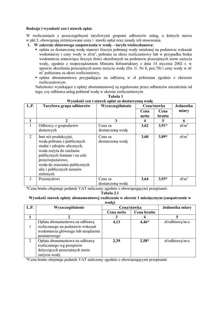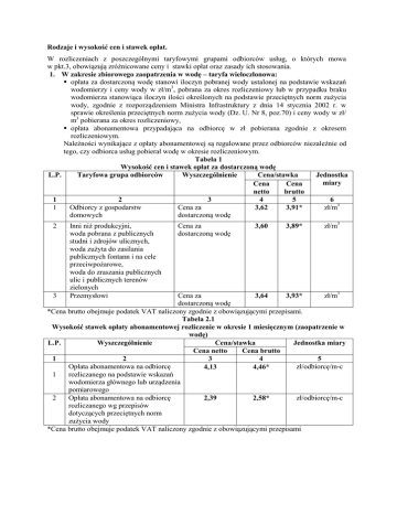 Rodzaje i wysokość cen i stawek opłat. W rozliczeniach z poszczególnymi taryfowymi grupami odbiorców usług, o których mowa w pkt.3, obowiązują zróżnicowane ceny i stawki opłat oraz zasady ich stosowania. 1. W zakresie zbiorowego zaopatrzenia w wodę – taryfa wieloczłonowa: opłata za dostarczoną wodę stanowi iloczyn pobranej wody ustalonej na podstawie wskazań wodomierzy i ceny wody w zł/m3, pobrana za okres rozliczeniowy lub w przypadku braku wodomierza stanowiąca iloczyn ilości określonych na podstawie przeciętnych norm zużycia wody, zgodnie z rozporządzeniem Ministra Infrastruktury z dnia 14 stycznia 2002 r. w sprawie określenia przeciętnych norm zużycia wody (Dz. U. Nr 8, poz.70) i ceny wody w zł/ m3 pobierana za okres rozliczeniowy, opłata abonamentowa przypadająca na odbiorcę w zł pobierana zgodnie z okresem rozliczeniowym. Należności wynikające z opłaty abonamentowej są regulowane przez odbiorców niezależnie od tego, czy odbiorca usług pobierał wodę w okresie rozliczeniowym. Tabela 1 Wysokość cen i stawek opłat za dostarczoną wodę L.P. Taryfowa grupa odbiorców Wyszczególnienie Cena/stawka Jednostka miary Cena Cena netto brutto 1 2 3 4 5 6 1 Odbiorcy z gospodarstw Cena za zł/m3 3,62 3,91* domowych dostarczoną wodę 2 Inni niż produkcyjni, woda pobrana z publicznych studni i zdrojów ulicznych, woda zużyta do zasilania publicznych fontann i na cele przeciwpożarowe, woda do zraszania publicznych ulic i publicznych terenów zielonych Przemysłowi Cena za dostarczoną wodę 3,60 3,89* zł/m3 Cena za zł/m3 3,64 3,93* dostarczoną wodę *Cena brutto obejmuje podatek VAT naliczony zgodnie z obowiązującymi przepisami. Tabela 2.1 Wysokość stawek opłaty abonamentowej rozliczenie w okresie 1 miesięcznym (zaopatrzenie w wodę) L.P. Wyszczególnienie Cena/stawka Jednostka miary Cena netto Cena brutto 1 2 3 4 5 Opłata abonamentowa na odbiorcę zł/odbiorcę/m-c 4,13 4,46* 1 rozliczanego na podstawie wskazań wodomierza głównego lub urządzenia pomiarowego 2 Opłata abonamentowa na odbiorcę zł/odbiorcę/m-c 2,39 2,58* rozliczanego wg przepisów dotyczących przeciętnych norm zużycia wody *Cena brutto obejmuje podatek VAT naliczony zgodnie z obowiązującymi przepisami 3 Tabela 2.2 Wysokość stawek opłaty abonamentowej rozliczenie w okresie 2 miesięcznym (zaopatrzenie w wodę) L.P. Wyszczególnienie Cena/stawka Jednostka miary Cena netto Cena brutto 1 2 3 4 5 Opłata abonamentowa na odbiorcę zł/odbiorcę/2 m-ce 6,05 6,53* 1 rozliczanego na podstawie wskazań wodomierza głównego lub urządzenia pomiarowego 2 Opłata abonamentowa na odbiorcę zł/odbiorcę/2 m-ce 4,31 4,65* rozliczanego wg przepisów dotyczących przeciętnych norm zużycia wody *Cena brutto obejmuje podatek VAT naliczony zgodnie z obowiązującymi przepisami 2. W zakresie zbiorowego odprowadzania ścieków – taryfa wieloczłonowa: opłata za odprowadzone ścieki stanowi iloczyn ilości ścieków, ustalony na podstawie wskazań urządzeń pomiarowych lub jako ilość równą dostarczonej wody i ceny za odprowadzenie ścieków w zł/ m3. opłata abonamentowa przypadająca na odbiorcę w zł pobierana zgodnie z okresem rozliczeniowym. Należności wynikające z opłaty abonamentowej są regulowane przez odbiorców niezależnie od tego, czy odbiorca usług pobierał wodę w okresie rozliczeniowym. Tabela 3 Wysokość cen i stawek opłat za odprowadzane ścieki L.P. Taryfowa grupa odbiorców Wyszczególnienie Cena/stawka Jednostka miary Cena Cena netto brutto 1 2 3 4 5 6 Dostawcy ścieków z gospodarstw Cena za zł/m3 3,43 3,70* 1 domowych, inni niż produkcyjni, odprowadzane ścieki przemysłowi *Cena brutto obejmuje podatek VAT naliczony zgodnie z obowiązującymi przepisami Tabela 4.1 Wysokość stawek opłaty abonamentowej rozliczenie w okresie 1 miesięcznym (odprowadzanie ścieków) L.P. Wyszczególnienie Cena/stawka Jednostka miary Cena netto Cena brutto 1 2 3 4 5 Opłata abonamentowa na odbiorcę 1 rozliczanego na podstawie urządzenia zł/odbiorcę/m-c 2,00 2,16* pomiarowego lub wodomierza głównego 2 Opłata abonamentowa na odbiorcę rozliczanego wg urządzenia zł/odbiorcę/m-c 2,21 2,39* pomiarowego lub wodomierza głównego z uwzględnieniem wskazań wodomierza dodatkowego mierzącego ilość wody bezpowrotnie zużytej 3 Opłata abonamentowa na odbiorcę rozliczanego wg urządzenia zł/odbiorcę/m-c 4,21 4,55* pomiarowego lub wodomierza przy ujęciu własnym Opłata abonamentowa na odbiorcę rozliczanego wg przepisów dotyczących zł/odbiorcę/m-c 2,47 2,67* przeciętnych norm zużycia wody *Cena brutto obejmuje podatek VAT naliczony zgodnie z obowiązującymi przepisami Tabela 4.2 Wysokość stawek opłaty abonamentowej rozliczenie w okresie 2 miesięcznym (odprowadzanie ścieków) L.P. Wyszczególnienie Cena/stawka Jednostka miary Cena netto Cena brutto 1 2 3 4 5 Opłata abonamentowa na odbiorcę 1 rozliczanego na podstawie urządzenia zł/odbiorcę/2m-ce 4,00 4,32* pomiarowego lub wodomierza głównego 2 Opłata abonamentowa na odbiorcę rozliczanego wg urządzenia zł/odbiorcę/2m-ce 2,21 2,39* pomiarowego lub wodomierza głównego z uwzględnieniem wskazań wodomierza dodatkowego mierzącego ilość wody bezpowrotnie zużytej 3 Opłata abonamentowa na odbiorcę rozliczanego wg urządzenia zł/odbiorcę/2m-ce 6,21 6,71* pomiarowego lub wodomierza przy ujęciu własnym 4 Opłata abonamentowa na odbiorcę rozliczanego wg przepisów dotyczących zł/odbiorcę/2m-ce 4,47 4,83* przeciętnych norm zużycia wody *Cena brutto obejmuje podatek VAT naliczony zgodnie z obowiązującymi przepisami Do cen i stawek opłat określonych w taryfie dolicza się podatek od towarów i usług 4 w wysokości określonej odrębnymi przepisami. Stawka opłaty za przyłączenie do urządzeń wodociągowo-kanalizacyjnych: 1. Urządzenie wodociągowe- 98,91 zł netto + VAT = 106,82 zł brutto* 2. Urządzenie kanalizacyjne- 98,91 zł netto + VAT = 106,82 zł brutto* *C