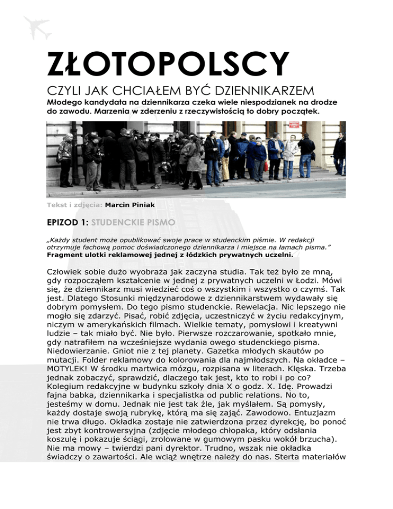 ZŁOTOPOLSCY CZYLI JAK CHCIAŁEM BYĆ DZIENNIKARZEM Młodego kandydata na dziennikarza czeka wiele niespodzianek na drodze do zawodu. Marzenia w zderzeniu z rzeczywistością to dobry początek. Tekst i zdjęcia: Marcin Piniak EPIZOD 1: STUDENCKIE PISMO „Każdy student może opublikować swoje prace w studenckim piśmie. W redakcji otrzymuje fachową pomoc doświadczonego dziennikarza i miejsce na łamach pisma.” Fragment ulotki reklamowej jednej z łódzkich prywatnych uczelni. Człowiek sobie dużo wyobraża jak zaczyna studia. Tak też było ze mną, gdy rozpocząłem kształcenie w jednej z prywatnych uczelni w Łodzi. Mówi się, że dziennikarz musi wiedzieć coś o wszystkim i wszystko o czymś. Tak jest. Dlatego Stosunki międzynarodowe z dziennikarstwem wydawały się dobrym pomysłem. Do tego pismo studenckie. Rewelacja. Nic lepszego nie mogło się zdarzyć. Pisać, robić zdjęcia, uczestniczyć w życiu redakcyjnym, niczym w amerykańskich filmach. Wielkie tematy, pomysłowi i kreatywni ludzie – tak miało być. Nie było. Pierwsze rozczarowanie, spotkało mnie, gdy natrafiłem na wcześniejsze wydania owego studenckiego pisma. Niedowierzanie. Gniot nie z tej planety. Gazetka młodych skautów po mutacji. Folder reklamowy do kolorowania dla najmłodszych. Na okładce – MOTYLEK! W środku martwica mózgu, rozpisana w literach. Klęska. Trzeba jednak zobaczyć, sprawdzić, dlaczego tak jest, kto to robi i po co? Kolegium redakcyjne w budynku szkoły dnia X o godz. X. Idę. Prowadzi fajna babka, dziennikarka i specjalistka od public relations. No to, jesteśmy w domu. Jednak nie jest tak źle, jak myślałem. Są pomysły, każdy dostaje swoją rubrykę, którą ma się zająć. Zawodowo. Entuzjazm nie trwa długo. Okładka zostaje nie zatwierdzona przez dyrekcję, bo ponoć jest zbyt kontrowersyjna (zdjęcie młodego chłopaka, który odsłania koszulę i pokazuje ściągi, zrolowane w gumowym pasku wokół brzucha). Nie ma mowy – twierdzi pani dyrektor. Trudno, wszak nie okładka świadczy o zawartości. Ale wciąż wnętrze należy do nas. Sterta materiałów z każdym tygodniem staje się coraz grubsza. Wreszcie na kolejnym kolegium redakcyjnym zjawia się ten wspomniany i z miejsca oferuje nam swoją „pomoc”. Na początek mówi, że nie można robić dobrego pisma nie studiując dziennikarstwa. No proszę! Później powiada, że wszystkie artykuły są fatalne. W tekstach nie ma piramidy (odwrócona piramida – najważniejsze na początku, głównie w informacji), wszystko jest źle napisane, zredagowane, konieczne są jego konsultacje. Później każdemu z osobna mówi, że jego artykuł nie jest taki zły. Trzeba dopracować i będzie cacy. Miał facet jeden cel, czyli zniechęcić nas do pisania. Prawie mu się udało. Mnie głównie zniechęcił do samego siebie. Na pohybel doświadczonym dziennikarzom. Dostaliśmy zlecenia na wywiad z jednym z profesorów. Wywiadów z profesorami na liście tego, co mamy napisać, było całe mnóstwo. Robiłem wywiad razem z kolegą. Profesor autoryzował wywiad kilka razy. Zadaliśmy mu kilka pytań odnośnie poziomu kształcenia w prywatnych uczelniach. Wywiad się nie ukazał. Okazało się, że to całe pismo jest jedynie po to, aby wysyłać je do szkół średnich jako reklamówki. W numerze, który stworzyliśmy było połowę reklam a praktycznie cała reszta to wspomniane wywiady z profesorami uczelni. Na okładce szczęśliwi studenci. Tu się liczy tylko kasa. Choć wszyscy udają, że jest inaczej. EPIZOD 2: ZOSTAĆ RADIOWCEM Radio, to nie lada gratka dla kandydata na dziennikarza. Szkoła załatwiła nam praktyki w jednej z komercyjnych stacji radiowych w Łodzi. Myśleliśmy – wyzwanie trzeba podjąć, nauczyć się czegoś w prawdziwych mediach. Jaka różnica w porównaniu z pisemkiem dla licealistów. Redakcja to gwar, mnóstwo ludzi, czuć było już smak tego dziennikarskiego życia. Wreszcie jakiś zwrot w dobrą stronę. Dostaliśmy czas antenowy. Mogliśmy robić, co chcemy. Pomagali nam radiowi weterani. To było coś! Wypytywałem dziennikarzy o ich drogi do sukcesu. Za oknem panorama miasta. Wspaniale. Minął rok szkolny, szkoła przestała płacić w praktykach nastąpiła przerwa. Koleżanka z uczelni poszła do radia, by porozmawiać o możliwości robienia czegoś więcej. Nie ma mowy. Nie płacą za was, to praktyk nie ma. Też próbowałem podjąć taką próbę negocjacji. Daremnie. Minęły wakacje. Ze szkoły napłynęły fundusze. Praktyki ruszyły pełną parą. Dostaliśmy cztery minuty, co drugi tydzień czasu antenowego. Typowa robota reporterska – mówiła nam szefowa informacji. Cztery minuty o tym samym. Radio się sformatowało, odeszli ludzie. Została reklama i muzyka. Rozmawiałem z reporterami. Jeden pracuje za darmo. Przepraszam – za satysfakcję. Koleżanka odchodzi, bo nie ma szans na etat. Nie ma szans na publicystykę. Tylko lista pop, kino pop, reklama pop. Nie ma kontrowersyjnych niusów. Nie ma śledztw i gorących tematów. Trzeba zarobić, żeby to wszystko utrzymać. W redakcyjnym telewizorze „Złotopolscy”. EPIZOD 3: AGENCJA PRASOWA Gazeta Wyborcza: „Agencja prasowa zatrudni niedoświadczonych dziennikarzy.” Spotkanie w jednej z kamienic na Piotrkowskiej. Wszedłem na górę. Młodzi niedoświadczeni już byli. Na ścianach przed „redakcją” przyczepione były zdjęcia znanych sportowców i ludzi show biznesu. Zrobione w stylu pism dla zmęczonych kobiet. W środku dwa biurka, komputery, gazety. Co mnie zdziwiło nikt nie dzwonił, inaczej sobie wyobrażałem agencję prasową. Na biurku książka „Abecadło dziennikarza”. To wszystko przypominało rekwizyty na potrzebę jakiegoś przestawienia. Pan szef agencji zaczął od prezentacji „swoich osiągnięć” przedstawiając nam segregatory ze swoją dziennikarską robotą. Przecież nie jest byle kim, pisał dla Dziennika Łódzkiego i Expressu Ilustrowanego. Powycinał nawet krótkie 