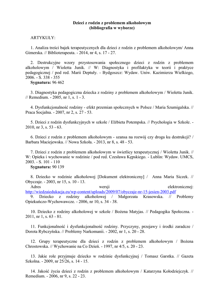 Dzieci z rodzin z problemem alkoholowym (bibliografia w wyborze) ARTYKUŁY: 1. Analiza treści bajek terapeutycznych dla dzieci z rodzin z problemem alkoholowym/ Anna Gimerska. // Biblioterapeuta. - 2014, nr 4, s. 17 - 27. 2. Destrukcyjne wzory przystosowania społecznego dzieci z rodzin z problemem alkoholowym / Wioletta Junik. // W: Diagnostyka i profilaktyka w teorii i praktyce pedagogicznej / pod red. Marii Deptuły. - Bydgoszcz: Wydaw. Uniw. Kazimierza Wielkiego, 2006. - S. 338 - 355 Sygnatura: 96 462 3. Diagnostyka pedagogiczna dziecka z rodziny z problemem alkoholowym / Wioletta Junik. // Remedium. - 2005, nr 1, s. 1 - 3. 4. Dysfunkcjonalność rodziny - efekt przemian społecznych w Polsce / Maria Szumigalska. // Praca Socjalna. - 2007, nr 2, s. 27 - 53. 5. Dzieci z rodzin dysfunkcyjnych w szkole / Elżbieta Potempska. // Psychologia w Szkole. 2010, nr 3, s. 53 - 63. 6. Dzieci z rodzin z problemem alkoholowym - szansa na rozwój czy droga ku destrukcji? / Barbara Maciejewska. // Nowa Szkoła. - 2013, nr 8, s. 48 - 53. 7. Dzieci z rodzin z problemem alkoholowym w świetlicy terapeutycznej / Wioletta Junik. // W: Opieka i wychowanie w rodzinie / pod red. Czesława Kępskiego. - Lublin: Wydaw. UMCS, 2003. - S. 101 - 110 Sygnatura: 90 139 8. Dziecko w rodzinie alkoholowej [Dokument elektroniczny] / Anna Maria Siczek. // Obyczaje. - 2003, nr 15, s. 10 - 13. Adres wersji elektronicznej: http://wiedzaiedukacja.eu/wp-content/uploads/2009/07/obyczaje-nr-15-jesien-2003.pdf 9. Dziecko z rodziny alkoholowej / Małgorzata Krasowska. // Problemy Opiekuńczo-Wychowawcze. - 2006, nr 10, s. 34 - 38. 10. Dziecko z rodziny alkoholowej w szkole / Bożena Matyjas. // Pedagogika Społeczna. 2011, nr 1, s. 63 - 81. 11. Funkcjonalność i dysfunkcjonalność rodziny. Przyczyny, przejawy i środki zaradcze / Dorota Rybczyńska. // Problemy Narkomanii. - 2002, nr 1, s. 20 - 28. 12. Grupy terapeutyczne dla dzieci z rodzin z problemem alkoholowym / Bożena Chrostowska. // Wychowanie na Co Dzień. - 1997, nr 4/5, s. 20 - 23. 13. Jakie role przyjmuje dziecko w rodzinie dysfunkcyjnej / Tomasz Garstka. // Gazeta Szkolna. - 2009, nr 25/26, s. 14 - 15. 14. Jakość życia dzieci z rodzin z problemem alkoholowym / Katarzyna Kołodziejczyk. // Remedium. - 2006, nr 9, s. 22 - 23. 15. Miejsce świetlicy socjoterapeutycznej w systemie pomocy dzieciom z rodzin dysfunkcyjnych / Maria Katarzyna Żywno. // Świat Problemów. - 2013, nr 5, s. 17 - 19. Adres wersji elektronicznej: http://www.swiatproblemow.pl/2013_05_2.html 16. "Na przekór przeciwnościom losu" - jak wzmacniać rezilienację dzieci z rodzin z problemem alkoholowym / Wioletta Junik. // Chowanna. - 2010, t. 1, s. 163 - 174, bibliogr. Adres wersji elektronicznej: http://www.sbc.org.pl/dlibra/docmetadata?id=20924&from=publication 17. Następstwa dysfunkcjonalności rodziny / Pod red. Marka Heinego.- Wrocław: Wydaw. UW, 1997 Sygnatura: 81 860 18. Obraz rodziny w percepcji dzieci w młodszym wieku szkolnym z rodzin z problemem alkoholowym / Małgorzata Chojak. // Alkoholizm i Narkomania. - 2008, nr 2, s. 153 - 171, bibliogr.. 19. Ochrona praw dziecka w rodzinie dysfunkcyjnej (dziecko - rodzina - państwo) / Marek Andrzejewski.- Kraków: Kantor Wydaw. ZAKAMYCZE, 2003 Sygnatura: 91 770 20. Potrzeby małego dziecka w rodzinie alkoholowej, przemocowej / Agnieszka Sołbut. // W: Świat małego dziecka. T. II / Red. nauk. Hanna Krauze-Sikorska, Michał Klichowski, Kinga Kuszak. - Poznań: Wydawnictwo Naukowe UAM, 2013. - S. 311 - 322 Sygnatura: 107 884 21. Praca z uczniem z rodziny z problemem alkoholowym : praca z uczniem ze SPE / Alicja Strzelecka-Lemiech // Głos Pedagogiczny. - 2013, nr 1, s. 13 - 15. 22. Program całorocznej profilaktyki (dla młodzieży upośledzonej umysłowo, pochodzącej z rodzin patologicznych i dysfunkcyjnych) / s. Krystyna Lesicka. // Wychowawca. - 2001, nr 2, s. 20 - 21. 23. Program zajęć socjoterapeutycznych dla dzieci z rodzin alkoholowych / Andrzej Bałandynowicz. // Problemy Alkoholizmu. - 2006, nr 1, s. /VI - IX/. 24. Przemoc wobec dzieci w rodzinach z problemem alkoholowym - wybrane problemy DDA / Dorota Górecka. // Świat Problemów. - 2014, nr 4, s. 36 - 39. 25. Rodzina alkoholowa a rozwój i wychowanie dzieci / Elzbieta Łuczak, Małgorzata Przybysz. // Opieka Wychowanie Terapia. - 2002, nr 2, s. 18 - 22. 26. Rodzina długotrwale bezrobotna jako rodzina dysfunkcyjna - charakterystyka i formy pomocy / Anna Marzec - Tarasińska. // W: Diagnostyka i profilaktyka w teorii i praktyce pedagogicznej / Pod. red. Marii Deptuły. - Bydgoszcz: Wydawnictwo UKW, 2006. - S. 273 290 Sygnatura: 106 340-1 27. Rodzina dysfunkcjonalna a zachowania agresywne dzieci w okresie dorastania / Władysława Łuszczuk. // Chowanna. - 2001, T.2, s. 7 - 18. 28. Rodzina dysfunkcyjna - przyczyny i ich charakterystyka / Sylwia Łakoma. // Problemy Opiekuńczo-Wychowawcze. - 2014, nr 7, s. 20 - 28. 29. Rodzina dysfunkcyjna / Mira Prajner. // Remedium. - 2002, nr 5, s. 18 - 19. 30. Rodzina dysfunkcyjna a wczesna edukacja jej dziecka / Lucyna Kuśmierczyk. // Nauczanie Początkowe. Kształcenie zintegrowane. - 2013/2014, nr 4, s. 50 - 69 31. Rodzina z problemem alkoholowym /Monika Wysota. // Sygnał. - 2014, nr 5, s. 46 - 49. 32. Rodzina z problemem alkoholowym w pracy socjalnej / Iwona Grzegorzewska. // Praca Socjalna. - 2012, nr 3, s. 18 - 25. 33. Ryzyko zamachów samobójczych u dzieci z rodzin alkoholowych / Luiza Monika Błaszczyk. // Nowa Szkoła. - 2005, nr 2, s. 33 - 36. 34. Sposoby adaptacji dzieci w rodzinie alkoholowej / Piotr Szczurkiewicz. // Świat Problemów. - 2016, nr 10, s. 33 - 36. 35. Strategie terapeutyczne dla dzieci z rodzin dysfunkcyjnych / Magdalena Goetz. // Świat Problemów. - 2014, nr 6, s. 14 - 17. 36. Struktura i funkcjonowanie systemu rodzinnego rodzin dysfunkcyjnych / Maria Ryś. // Probl. Pordanictwa Psychologiczno-Pedagogicznego. - 2003, nr 2, s. 29 - 48, bibliogr.. 37. System pomocy rodzinom z problemem alkoholowym / Agnieszk