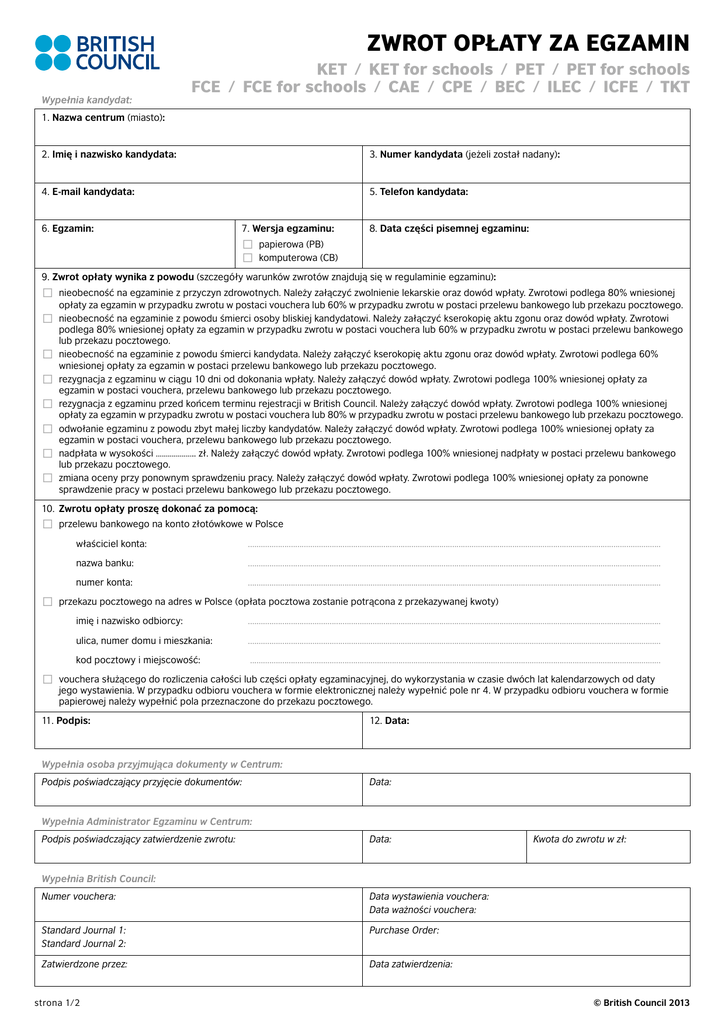 ZWROT OPŁATY ZA EGZAMIN Wypełnia kandydat: KET / KET for schools / PET / PET for schools FCE / FCE for schools / CAE / CPE / BEC / ILEC / ICFE / TKT 1. Nazwa centrum (miasto): 2. Imię i nazwisko kandydata: 3. Numer kandydata (jeżeli został nadany): 4. E-mail kandydata: 5. Telefon kandydata: 6. Egzamin: 7. Wersja egzaminu: 8. Data części pisemnej egzaminu: papierowa (PB) ¨ komputerowa (CB) ¨ 9. Zwrot opłaty wynika z powodu (szczegóły warunków zwrotów znajdują się w regulaminie egzaminu): nieobecność na egzaminie z przyczyn zdrowotnych. Należy załączyć zwolnienie lekarskie oraz dowód wpłaty. Zwrotowi podlega 80% wniesionej ¨ opłaty za egzamin w przypadku zwrotu w postaci vouchera lub 60% w przypadku zwrotu w postaci przelewu bankowego lub przekazu pocztowego. nieobecność na egzaminie z powodu śmierci osoby bliskiej kandydatowi. Należy załączyć kserokopię aktu zgonu oraz dowód wpłaty. Zwrotowi ¨ podlega 80% wniesionej opłaty za egzamin w przypadku zwrotu w postaci vouchera lub 60% w przypadku zwrotu w postaci przelewu bankowego lub przekazu pocztowego. nieobecność na egzaminie z powodu śmierci kandydata. Należy załączyć kserokopię aktu zgonu oraz dowód wpłaty. Zwrotowi podlega 60% ¨ wniesionej opłaty za egzamin w postaci przelewu bankowego lub przekazu pocztowego. rezygnacja z egzaminu w ciągu 10 dni od dokonania wpłaty. Należy załączyć dowód wpłaty. Zwrotowi podlega 100% wniesionej opłaty za ¨ egzamin w postaci vouchera, przelewu bankowego lub przekazu pocztowego. rezygnacja z egzaminu przed końcem terminu rejestracji w British Council. Należy załączyć dowód wpłaty. Zwrotowi podlega 100% wniesionej ¨ opłaty za egzamin w przypadku zwrotu w postaci vouchera lub 80% w przypadku zwrotu w postaci przelewu bankowego lub przekazu pocztowego. odwołanie egzaminu z powodu zbyt małej liczby kandydatów. Należy załączyć dowód wpłaty. Zwrotowi podlega 100% wniesionej opłaty za ¨ egzamin w postaci vouchera, przelewu bankowego lub przekazu pocztowego. nadpłata w wysokości ……………….. zł. Należy załączyć dowód wpłaty. Zwrotowi podlega 100% wniesionej nadpłaty w postaci przelewu bankowego ¨ lub przekazu pocztowego. zmiana oceny przy ponownym sprawdzeniu pracy. Należy załączyć dowód wpłaty. Zwrotowi podlega 100% wniesionej opłaty za ponowne ¨ sprawdzenie pracy w postaci przelewu bankowego lub przekazu pocztowego. 10. Zwrotu opłaty proszę dokonać za pomocą: przelewu bankowego na konto złotówkowe w Polsce ¨ właściciel konta: ................................................................................................................................................................................................. nazwa banku: ................................................................................................................................................................................................. numer konta: ................................................................................................................................................................................................. przekazu pocztowego na adres w Polsce (opłata pocztowa zostanie potrącona z przekazywanej kwoty) ¨ imię i nazwisko odbiorcy: ................................................................................................................................................................................................. ulica, numer domu i mieszkania: ................................................................................................................................................................................................. kod pocztowy i miejscowość: ................................................................................................................................................................................................ vouchera służącego do rozliczenia całości lub części opłaty egzaminacyjnej, do wykorzystania w czasie dwóch lat kalendarzowych od daty ¨ jego wystawienia. W przypadku odbioru vouchera w formie elektronicznej należy wypełnić pole nr 4. W przypadku odbioru vouchera w formie papierowej należy wypełnić pola przeznaczone do przekazu pocztowego. 11. Podpis: 12. Data: Wypełnia osoba przyjmująca dokumenty w Centrum: Podpis poświadczający przyjęcie dokumentów: Data: Wypełnia Administrator Egzaminu w Centrum: Podpis poświadczający zatwierdzenie zwrotu: Data: Kwota do zwrotu w zł: Wypełnia British Council: Numer vouchera: Data wystawienia vouchera: Data ważności vouchera: Standard Journal 1: Standard Journal 2: Purchase Order: Zatwierdzone przez: Data zatwierdzenia: strona 1/2 © British Council 2013 ZWROT OPŁATY ZA EGZAMIN KET / KET for schools / PET / PET for schools FCE / FCE for schools / CAE / CPE / BEC / ILEC / ICFE / TKT Dodatkowe informacje Formularz, wraz z dowodem wpłaty i ewentualnie dodatkowymi dokumentami, należy dostarczyć do Centrum Egzaminacyjnego British Council w mieście, w którym kandydat był zarejestrowany na egzamin. Dokumenty mogą być dostarczone osobiście albo przesłane listem, faksem lub jako zeskanowany załącznik do e-maila. Zwrot nastąpi w przeciągu 30 dni od daty otrzymania przez British Council zestawu poprawnie wypełnionych dokumentów. Dane teleadresowe Centrów znajdują się poniżej: BIAŁYSTOK LEGNICA SŁUPSK empik school ul. Sienkiewicza 3 15-432 Białystok tel.: 85 741 69 30, 605 152 814 fax: 85 741 69 30 e-mail: [email protected] Centrum Edukacji FISCHER ul. Najświętszej Marii Panny 5h 59-200 Legnica tel.: 605 05 05 98 e-mail: [email protected] Centrum Językowe OXFORD Al. 3 Maja 5 76-200 Słupsk tel./fax: 59 846 74 67 e-mail: [email protected] CZĘSTOCHOWA LUBLIN SZCZECIN English Language Courses British Centre ul. Dąbrowskiego 8/6 42-202 Częstochowa tel./fax: 34 361 59 14 e-mail: [email protected] Centrum Brytyjskie UMCS ul. Zuchów 2 20-047 Lubl