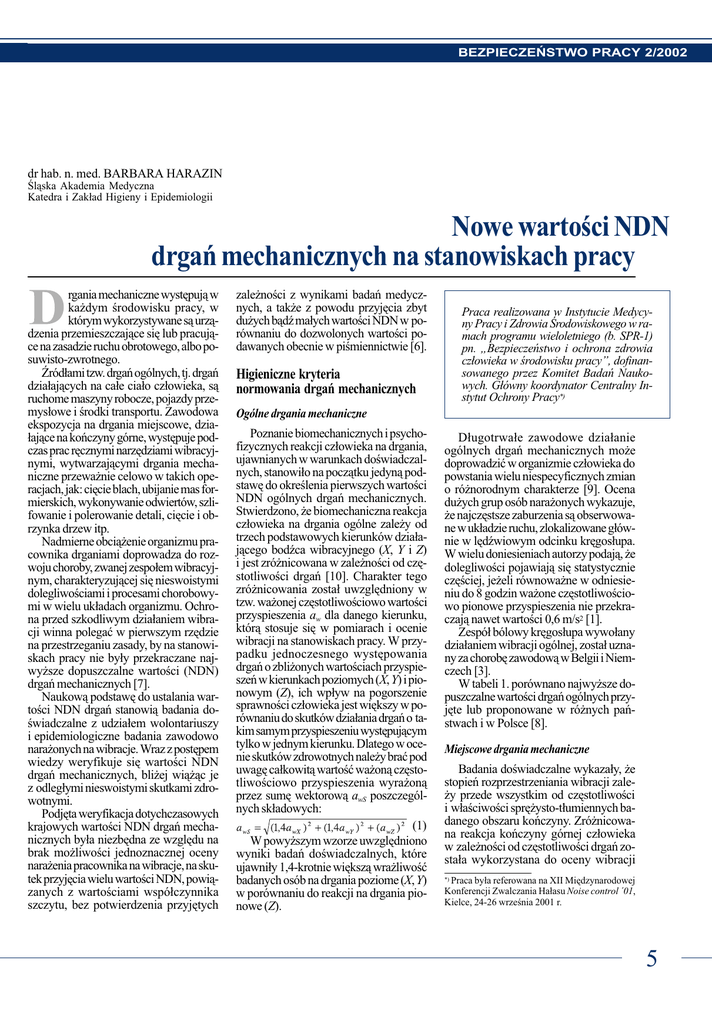 BEZPIECZEÑSTWO PRACY 2/2002 dr hab. n. med. BARBARA HARAZIN l¹ska Akademia Medyczna Katedra i Zak³ad Higieny i Epidemiologii Nowe wartoci NDN drgañ mechanicznych na stanowiskach pracy rgania mechaniczne wystêpuj¹ w ka¿dym rodowisku pracy, w którym wykorzystywane s¹ urz¹dzenia przemieszczaj¹ce siê lub pracuj¹ce na zasadzie ruchu obrotowego, albo posuwisto-zwrotnego. ród³ami tzw. drgañ ogólnych, tj. drgañ dzia³aj¹cych na ca³e cia³o cz³owieka, s¹ ruchome maszyny robocze, pojazdy przemys³owe i rodki transportu. Zawodowa ekspozycja na drgania miejscowe, dzia³aj¹ce na koñczyny górne, wystêpuje podczas prac rêcznymi narzêdziami wibracyjnymi, wytwarzaj¹cymi drgania mechaniczne przewa¿nie celowo w takich operacjach, jak: ciêcie blach, ubijanie mas formierskich, wykonywanie odwiertów, szlifowanie i polerowanie detali, ciêcie i obrzynka drzew itp. Nadmierne obci¹¿enie organizmu pracownika drganiami doprowadza do rozwoju choroby, zwanej zespo³em wibracyjnym, charakteryzuj¹cej siê nieswoistymi dolegliwociami i procesami chorobowymi w wielu uk³adach organizmu. Ochrona przed szkodliwym dzia³aniem wibracji winna polegaæ w pierwszym rzêdzie na przestrzeganiu zasady, by na stanowiskach pracy nie by³y przekraczane najwy¿sze dopuszczalne wartoci (NDN) drgañ mechanicznych [7]. Naukow¹ podstawê do ustalania wartoci NDN drgañ stanowi¹ badania dowiadczalne z udzia³em wolontariuszy i epidemiologiczne badania zawodowo nara¿onych na wibracje. Wraz z postêpem wiedzy weryfikuje siê wartoci NDN drgañ mechanicznych, bli¿ej wi¹¿¹c je z odleg³ymi nieswoistymi skutkami zdrowotnymi. Podjêta weryfikacja dotychczasowych krajowych wartoci NDN drgañ mechanicznych by³a niezbêdna ze wzglêdu na brak mo¿liwoci jednoznacznej oceny nara¿enia pracownika na wibracje, na skutek przyjêcia wielu wartoci NDN, powi¹zanych z wartociami wspó³czynnika szczytu, bez potwierdzenia przyjêtych zale¿noci z wynikami badañ medycznych, a tak¿e z powodu przyjêcia zbyt du¿ych b¹d ma³ych wartoci NDN w porównaniu do dozwolonych wartoci podawanych obecnie w pimiennictwie [6]. Higieniczne kryteria normowania drgañ mechanicznych Ogólne drgania mechaniczne Poznanie biomechanicznych i psychofizycznych reakcji cz³owieka na drgania, ujawnianych w warunkach dowiadczalnych, stanowi³o na pocz¹tku jedyn¹ podstawê do okrelenia pierwszych wartoci NDN ogólnych drgañ mechanicznych. Stwierdzono, ¿e biomechaniczna reakcja cz³owieka na drgania ogólne zale¿y od trzech podstawowych kierunków dzia³aj¹cego bodca wibracyjnego (X, Y i Z) i jest zró¿nicowana w zale¿noci od czêstotliwoci drgañ [10]. Charakter tego zró¿nicowania zosta³ uwzglêdniony w tzw. wa¿onej czêstotliwociowo wartoci przyspieszenia aw dla danego kierunku, któr¹ stosuje siê w pomiarach i ocenie wibracji na stanowiskach pracy. W przypadku jednoczesnego wystêpowania drgañ o zbli¿onych wartociach przyspieszeñ w kierunkach poziomych (X, Y) i pionowym (Z), ich wp³yw na pogorszenie sprawnoci cz³owieka jest wiêkszy w porównaniu do skutków dzia³ania drgañ o takim samym przyspieszeniu wystêpuj¹cym tylko w jednym kierunku. Dlatego w ocenie skutków zdrowotnych nale¿y braæ pod uwagê ca³kowit¹ wartoæ wa¿on¹ czêstotliwociowo przyspieszenia wyra¿on¹ przez sumê wektorow¹ awS poszczególnych sk³adowych: (1) W powy¿szym wzorze uwzglêdniono wyniki badañ dowiadczalnych, które ujawni³y 1,4-krotnie wiêksz¹ wra¿liwoæ badanych osób na drgania poziome (X, Y) w porównaniu do reakcji na drgania pionowe (Z). Praca realizowana w Instytucie Medycyny Pracy i Zdrowia rodowiskowego w ramach programu wieloletniego (b. SPR-1) pn. Bezpieczeñstwo i ochrona zdrowia cz³owieka w rodowisku pracy, dofinansowanego przez Komitet Badañ Naukowych. G³ówny koordynator Centralny Instytut Ochrony Pracy*) D³ugotrwa³e zawodowe dzia³anie ogólnych drgañ mechanicznych mo¿e doprowadziæ w organizmie cz³owieka do powstania wielu niespecyficznych zmian o ró¿norodnym charakterze [9]. Ocena du¿ych grup osób nara¿onych wykazuje, ¿e najczêstsze zaburzenia s¹ obserwowane w uk³adzie ruchu, zlokalizowane g³ównie w lêdwiowym odcinku krêgos³upa. W wielu doniesieniach autorzy podaj¹, ¿e dolegliwoci pojawiaj¹ siê statystycznie czêciej, je¿eli równowa¿ne w odniesieniu do 8 godzin wa¿one czêstotliwociowo pionowe przyspieszenia nie przekraczaj¹ nawet wartoci 0,6 m/s2 [1]. Zespó³ bólowy krêgos³upa wywo³any dzia³aniem wibracji ogólnej, zosta³ uznany za chorobê zawodow¹ w Belgii i Niemczech [3]. W tabeli 1. porównano najwy¿sze dopuszczalne wartoci drgañ ogólnych przyjête lub proponowane w ró¿nych pañstwach i w Polsce [8]. Miejscowe drgania mechaniczne Badania dowiadczalne wykaza³y, ¿e stopieñ rozprzestrzeniania wibracji zale¿y przede wszystkim od czêstotliwoci i w³aciwoci sprê¿ysto-t³umiennych badanego obszaru koñczyny. Zró¿nicowana reakcja koñczyny górnej cz³owieka w zale¿noci od czêstotliwoci drgañ zosta³a wykorzystana do oceny wibracji *) Praca by³a referowana na XII Miêdzynarodowej Konferencji Zwalczania Ha³asu Noise control ´01, Kielce, 24-26 wrzenia 2001 r. 5 BEZPIECZEÑSTWO PRACY 2/2002 Tabela 1 NAJWY¯SZE DOPUSZCZALNE WARTOCI OGÓLNYCH DRGAÑ MECHANICZNYCH STOSOWANE W WYBRANYCH PAÑSTWACH miejscowych na podstawie pomiarów tzw. wa¿onej czêstotliwociowo wartoci przyspieszenia aw. Ostatnie badania wykaza³y, ¿e podczas jednoczesnego dzia³ania drgañ w wielu kierunkach, reakcje cz³owieka najlepiej odzwierciedla wartoæ sumy wektorowej awS wa¿onych czêstotliwociowo sk³adowych przyspieszeñ w trzech kierunkach (awX, awY, lub awZ) [4]. Wzór na sumê wektorow¹ drgañ miejscowych przedstawia poni¿sze równanie: (2) Nadmierne i d³ugotrwa³e dzia³anie wibracji miejscowych mo¿e doprowadziæ do nieswoistych zmian chorobowych w uk³adzie naczyniowym, nerwowym, kostno  stawowym i miêniowym koñczyn górnych. W badaniach epidemiologicznych starano si