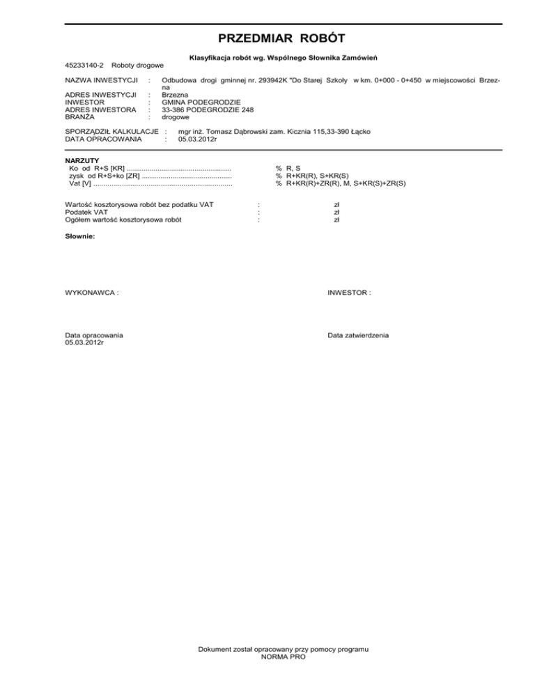 PRZEDMIAR ROBÓT Klasyfikacja robót wg. Wspólnego Słownika Zamówień 45233140-2 Roboty drogowe NAZWA INWESTYCJI : ADRES INWESTYCJI INWESTOR ADRES INWESTORA BRANŻA : : : : Odbudowa drogi gminnej nr. 293942K "Do Starej Szkoły w km. 0+000 - 0+450 w miejscowości Brzezna Brzezna GMINA PODEGRODZIE 33-386 PODEGRODZIE 248 drogowe SPORZĄDZIŁ KALKULACJE : DATA OPRACOWANIA : mgr inż. Tomasz Dąbrowski zam. Kicznia 115,33-390 Łącko 05.03.2012r NARZUTY Ko od R+S [KR] ................................................... zysk od R+S+ko [ZR] ............................................ Vat [V] .................................................................... Wartość kosztorysowa robót bez podatku VAT Podatek VAT Ogółem wartość kosztorysowa robót % R, S % R+KR(R), S+KR(S) % R+KR(R)+ZR(R), M, S+KR(S)+ZR(S) : : : zł zł zł Słownie: WYKONAWCA : INWESTOR : Data opracowania 05.03.2012r Data zatwierdzenia Dokument został opracowany przy pomocy programu NORMA PRO 3 odbudowa dr. Do Starej Szkoły Brzezna OBMIAR Podstawa Opis i wyliczenia j.m. Podbudowa KNNR 6 0101- Koryta wykonywane mechanicznie gł. 20 cm w gruncie kat. II-VI na ca- m2 02 łej szerokości jezdni i chodników analogia gr. 40 cm Krotność = 2 250*3.6 m2 KNNR 6 0103- Profilowanie i zagęszczanie podłoża wykonywane mechanicznie w 03 gruncie kat. II-IV pod warstwy konstrukcyjne nawierzchni 450*3.6 m2 KNNR 6 0112- Warstwa dolna podbudowy z kruszyw naturalnych gr. 20 cm analogia 01 gr. 40 cm Krotność = 2 droga 250*3.6 zjazdy 3*2*3 m2 KNNR 6 0113- Warstwa górna podbudowy z kruszyw łamanych gr. 15 cm 06 450*3.6 m2 KNR AT-03 0101-01 KNR 2-31 1406-03 KNNR 6 030903 droga zjazdy m2 m2 m2 m szt. 6 szt. Nawierzchnie z mieszanek mineralno-bitumicznych asfaltowych o gru- m2 bości 6 cm (warstwa ścieralna)- masa grysowa 450*3.0 m2 3*2*3 m2 KNNR 6 0113- Warstwa górna podbudowy z kruszyw łamanych gr. 10 cm - uzupełnie- m2 05 nie poboczy 450*0.30*2 m2 Norma PRO Wersja 4.37 Nr seryjny: 7772 900.00 RAZEM 900.00 1620.00 RAZEM 1620.00 360.00 RAZEM 360.00 900.00 18.00 RAZEM 918.00 1620.00 RAZEM 1620.00 6.00 RAZEM 6.00 6.00 RAZEM 6.00 1350.00 18.00 RAZEM 1368.00 270.00 RAZEM 270.00 m Regulacja pionowa studzienek dla włazów kanałowych -2- Razem m2 KNNR 1 0206- Roboty ziemne wykonywane koparkami podsiębiernymi o poj.łyżki 0.60 m3 04 m3 w gr.kat. I-III w ziemi uprzednio zmag.w hałdach z transp.urobku według wskazania wykonawcy 250*3.60*0.40 m3 Nawierzchnia Roboty remontowe - cięcie piłą nawierzchni bitumicznych na gł. do 5 cm 3.0+3.0 Poszcz